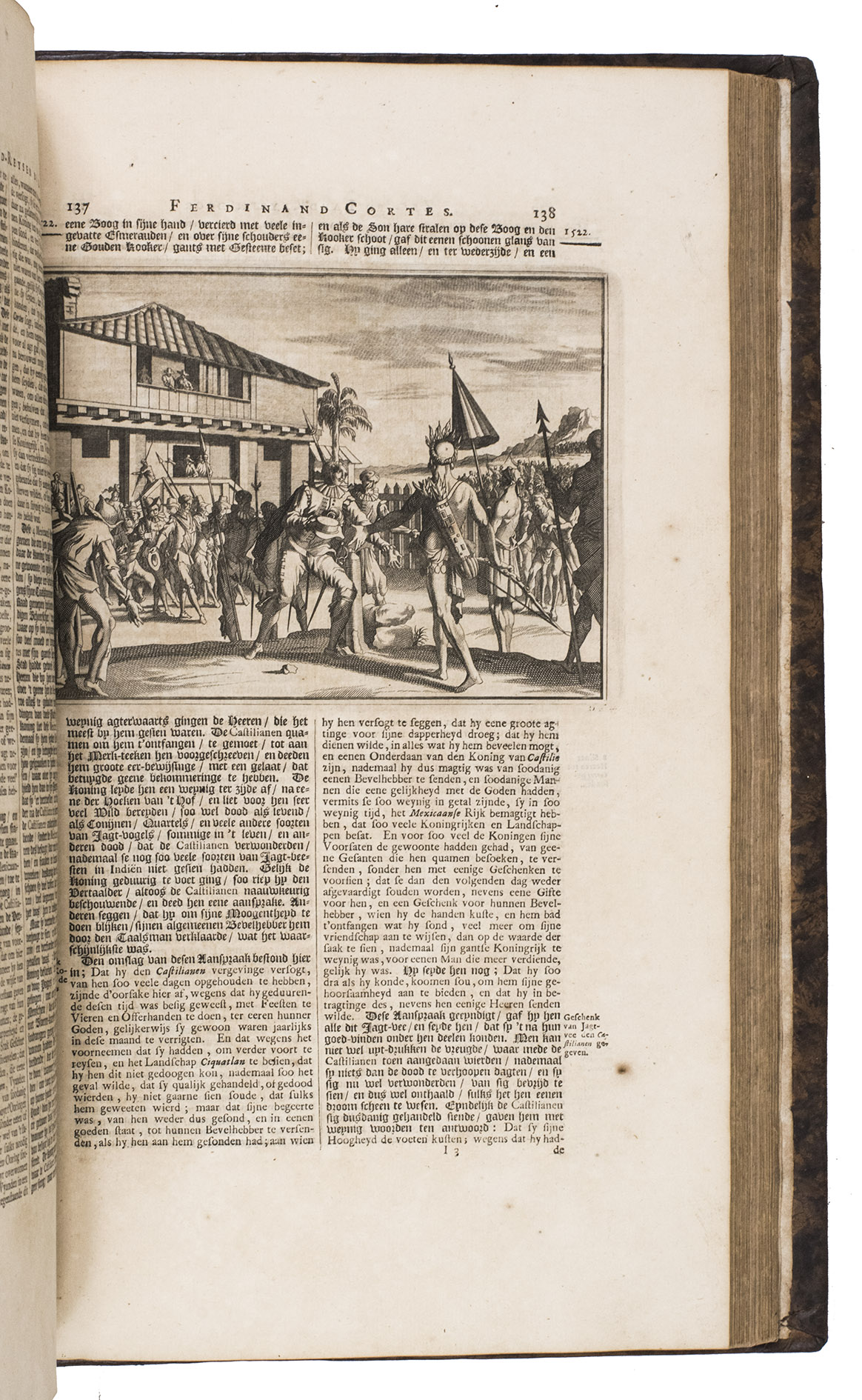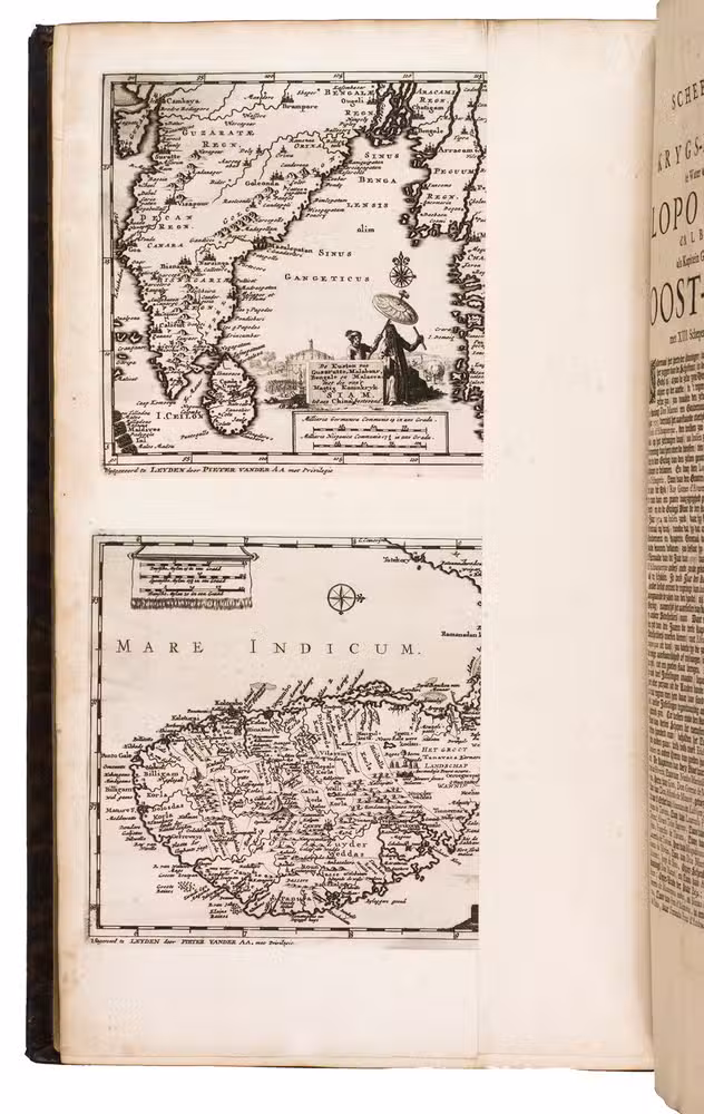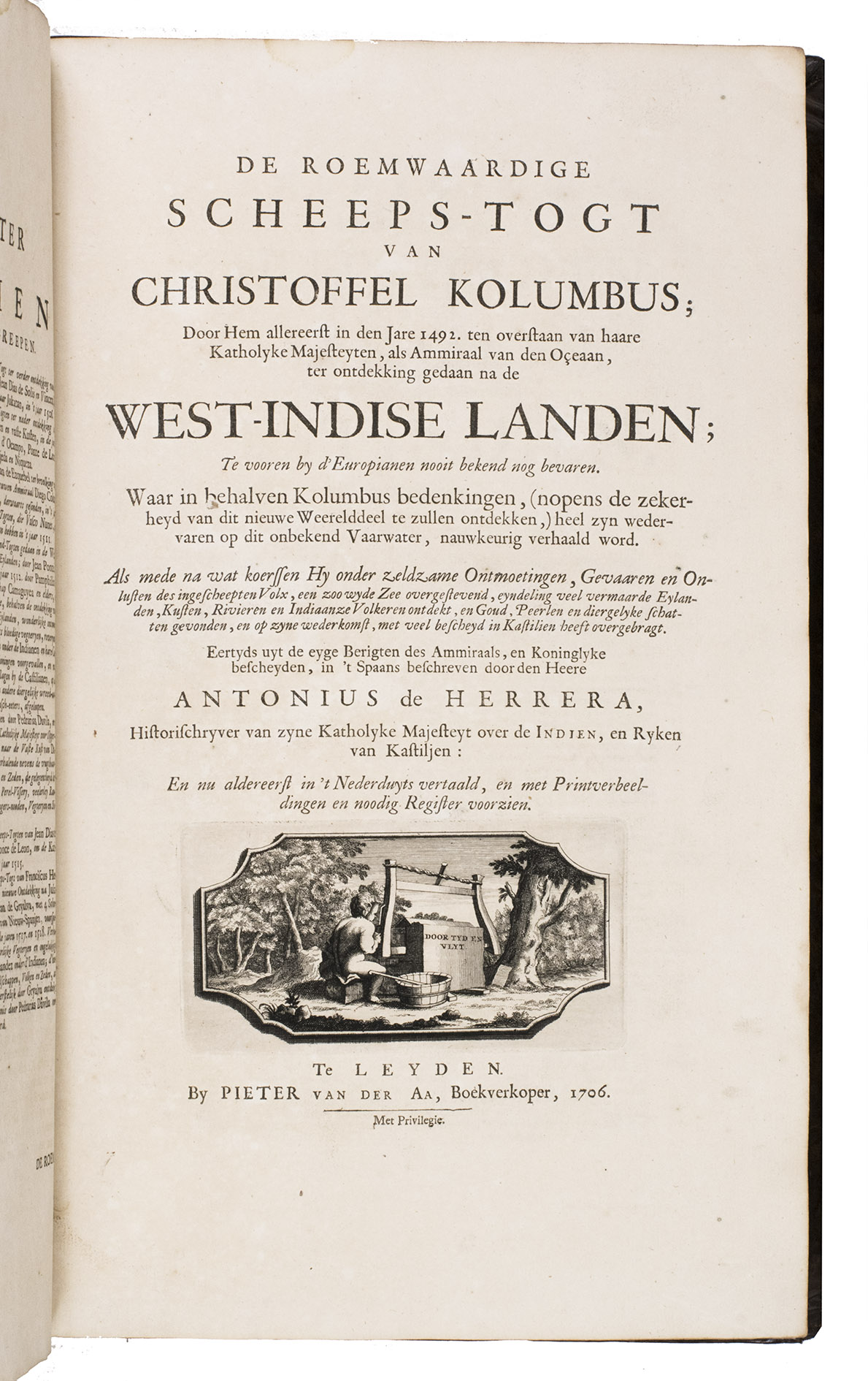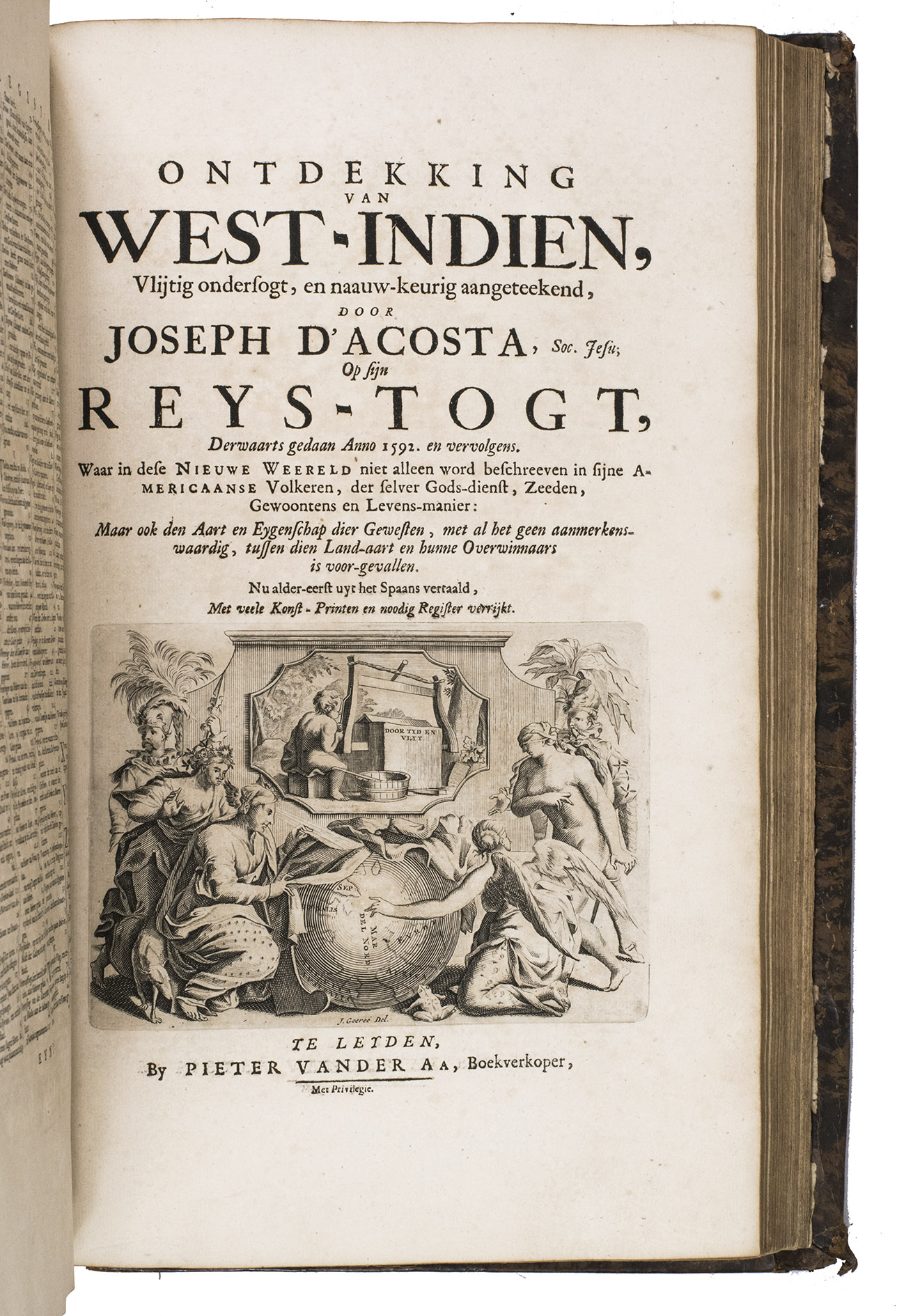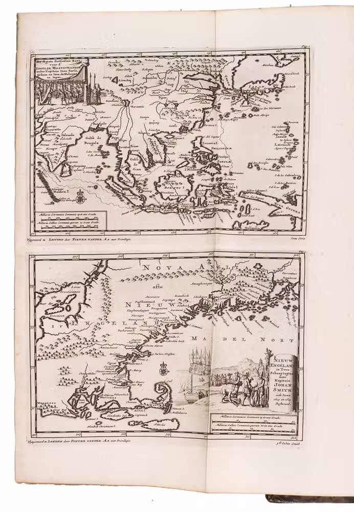 Included are the travel accounts of voyages undertaken by Acosta, Balbi, Cavendish, Chester, Columbus, Cortes, Coutinho, Da Cunha, Drake, Evesko, Frobisher, Da Gama, Garcia, Jenkinson, Harcourt, Herberer, Magallanes, Raleigh, Saris, De Soto, and many others. It was edited and co-published by Pieter van der Aa (1659-1733), known for his ambitious projects. He already started publishing the translated voyages both in small (8vo) and large instalments (folio or 1mo) in 1706, and a year later he published a 28-volume set of the 8vo editions, with the travel accounts arranged chronologically. When this was ready, he proceeded with the folio-edition. For this, he arranged the accounts by country of origin of the travellers, and divided the work into four large divisions of two volumes each. All voyages have their own separate title, with their own index at the end. The present issue is a reissue of these four collections with their own independent title pages and frontispieces, but now includes a new general title-page and list of subscribers. It also includes the original volume titles, which were often removed.
