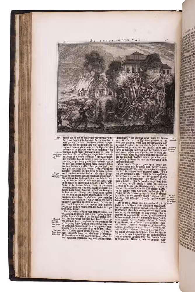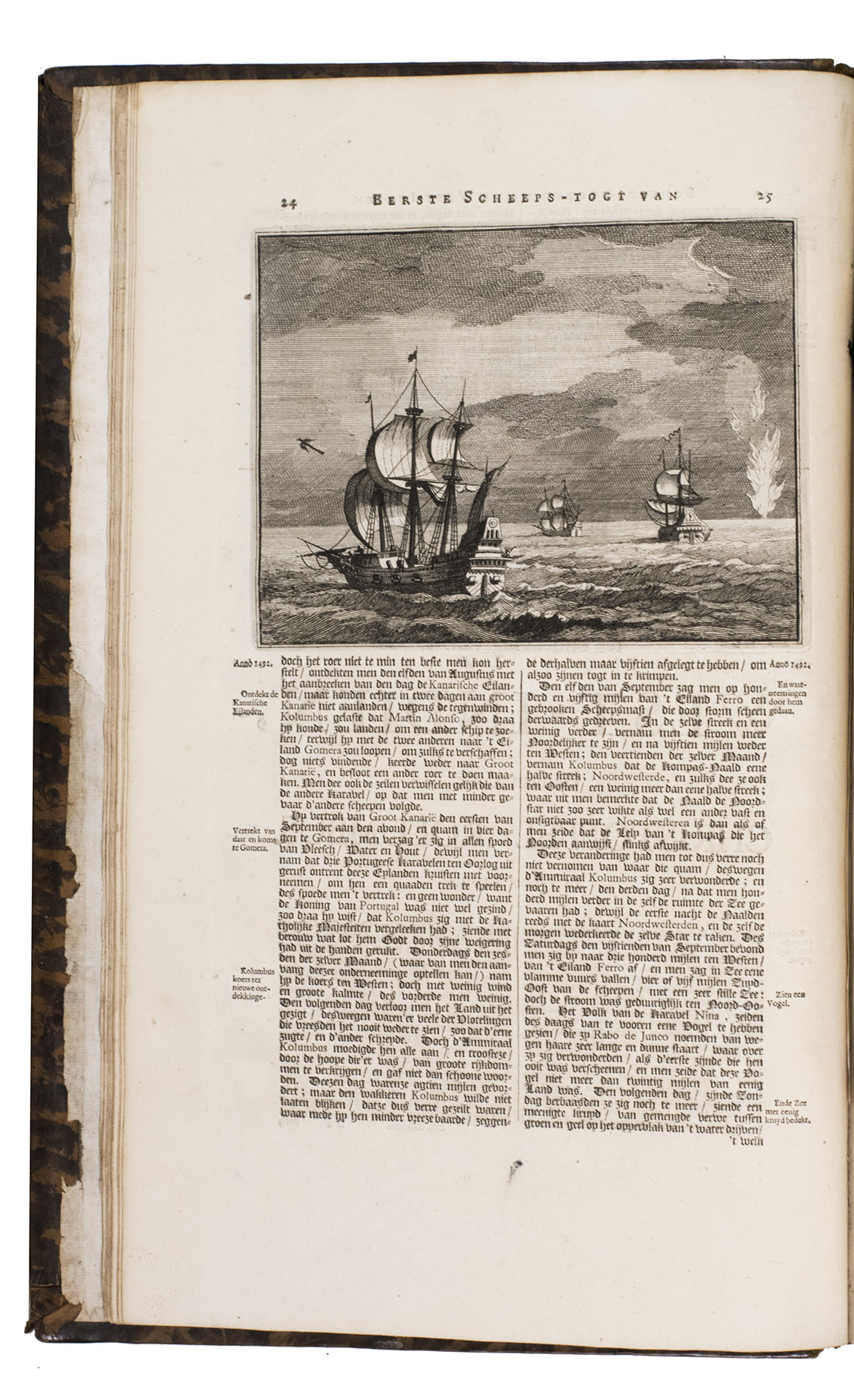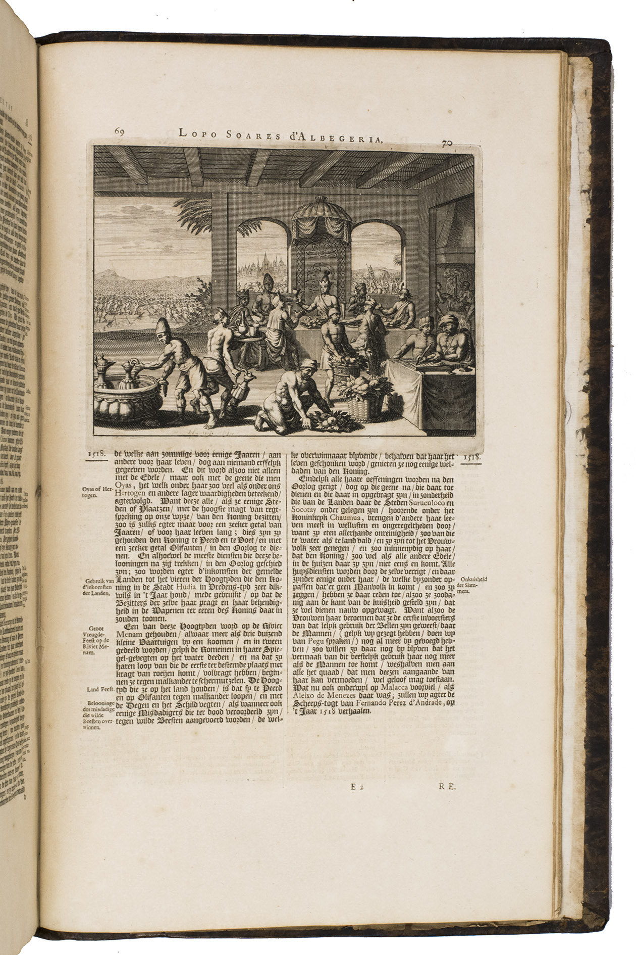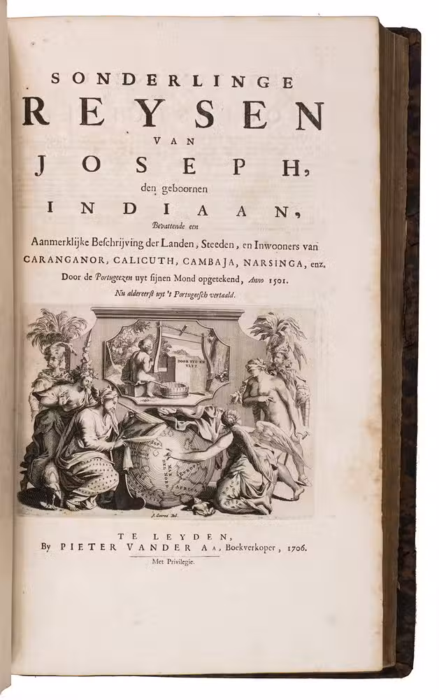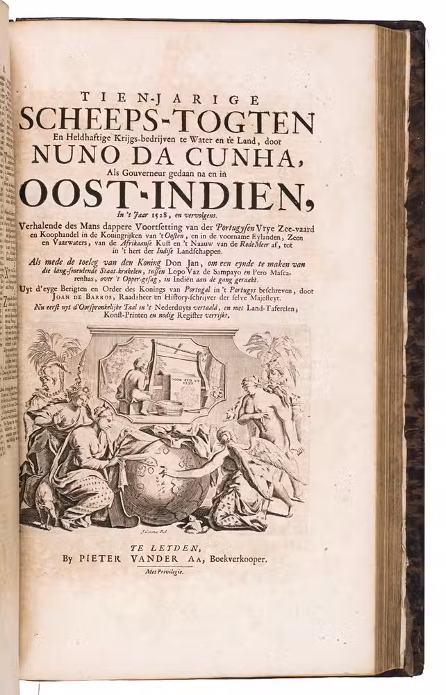 Included are the travel accounts of voyages undertaken by Acosta, Balbi, Cavendish, Chester, Columbus, Cortes, Coutinho, Da Cunha, Drake, Evesko, Frobisher, Da Gama, Garcia, Jenkinson, Harcourt, Herberer, Magallanes, Raleigh, Saris, De Soto, and many others. It was edited and co-published by Pieter van der Aa (1659-1733), known for his ambitious projects. He already started publishing the translated voyages both in small (8vo) and large instalments (folio or 1mo) in 1706, and a year later he published a 28-volume set of the 8vo editions, with the travel accounts arranged chronologically. When this was ready, he proceeded with the folio-edition. For this, he arranged the accounts by country of origin of the travellers, and divided the work into four large divisions of two volumes each. All voyages have their own separate title, with their own index at the end. The present issue is a reissue of these four collections with their own independent title pages and frontispieces, but now includes a new general title-page and list of subscribers. It also includes the original volume titles, which were often removed.
