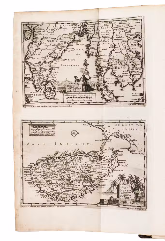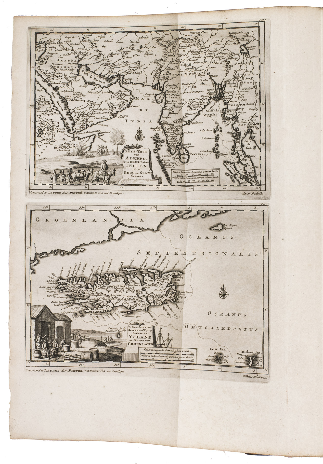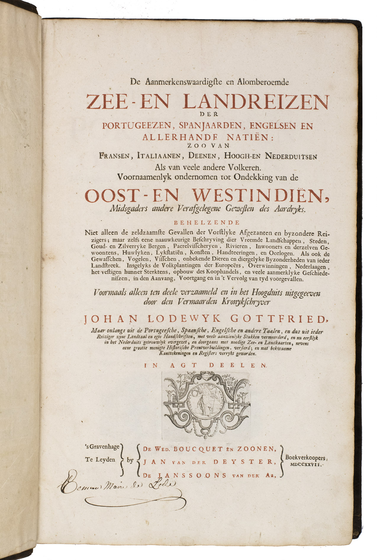 Rare complete set of the folio-edition of Van der Aa's voluminous collection of important voyages to the East and West Indies and other countries, undertaken by all European countries, other than the Dutch. The folio-edition is quite rare, as probably only 332 copies of it were printed. It includes the travel accounts of all of the most important travellers from Western Europe, often translated into Dutch for the first time. The numerous beautiful plates and maps were new and especially designed for the work.
