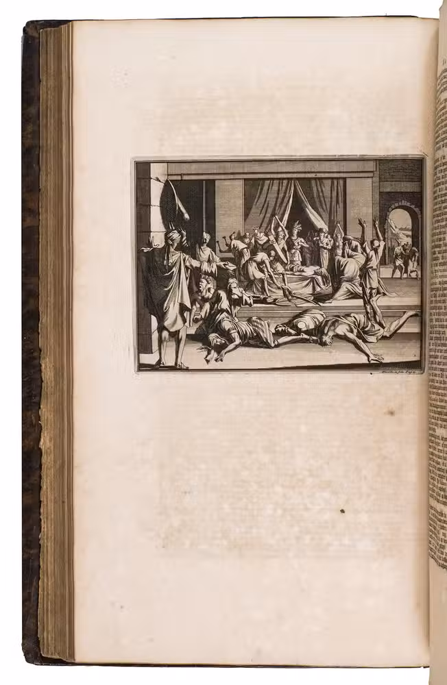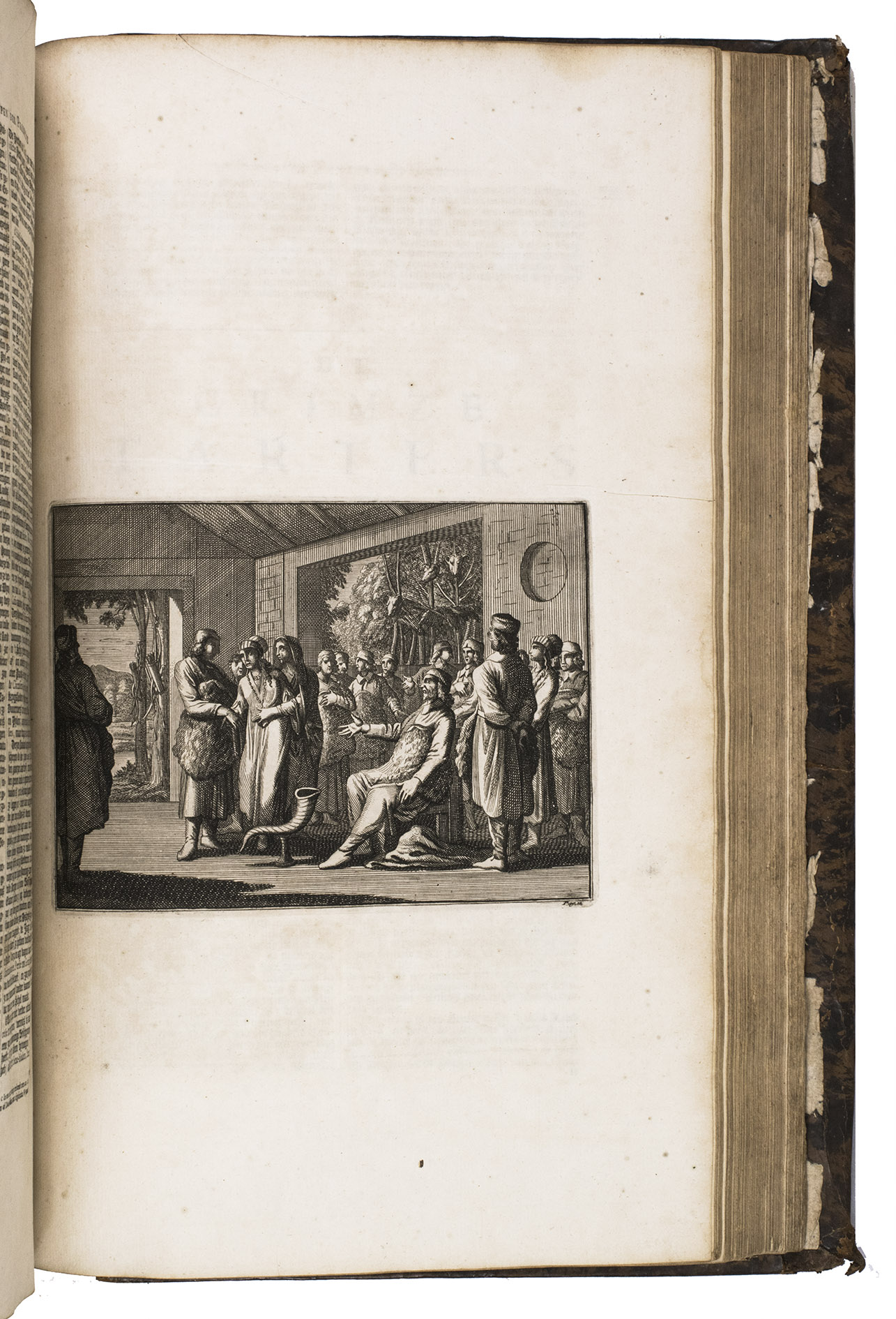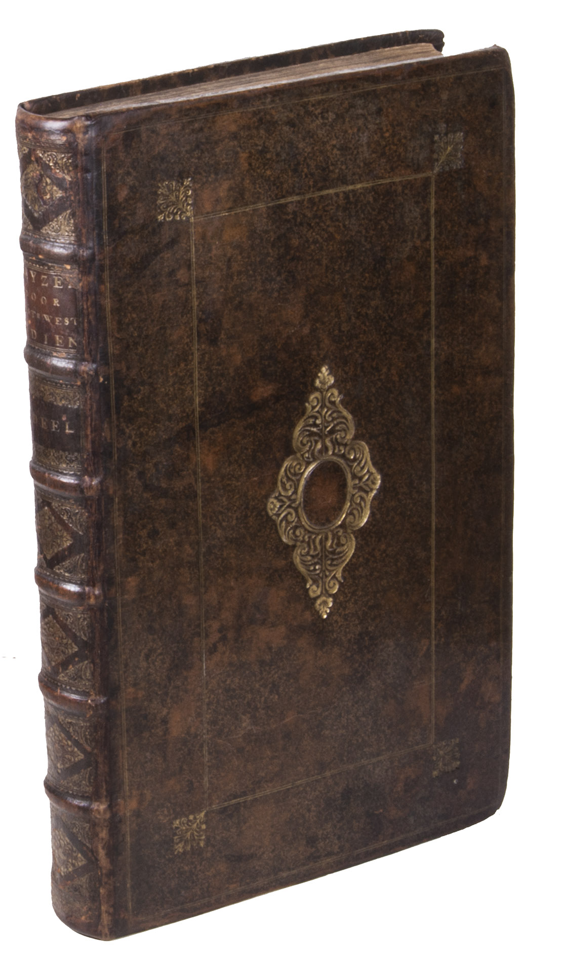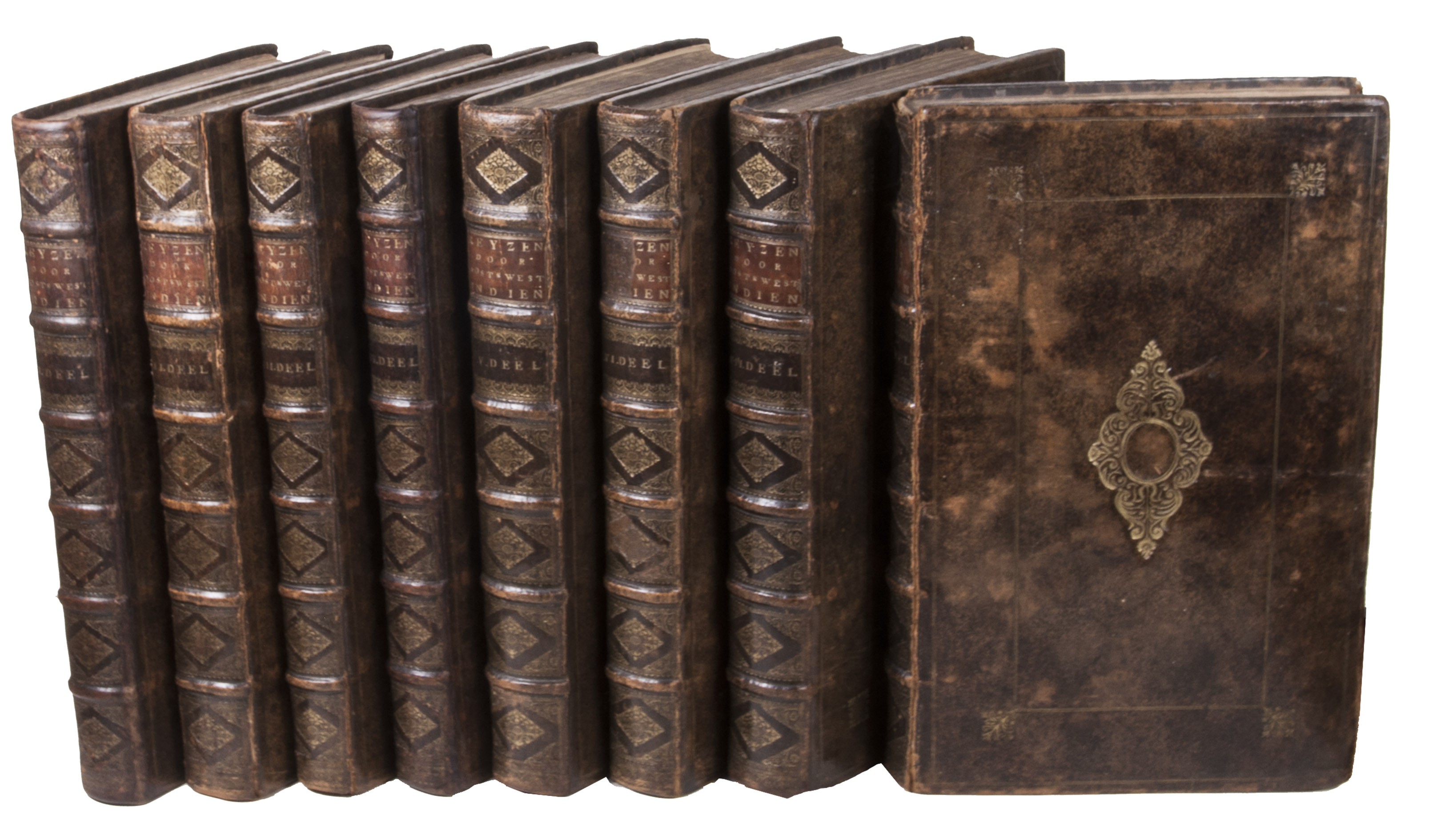 The Hague and Leiden, widow of Engelbrecht Boucquet and sons, Jan van der Deyster, and Boudewijn and Pieter van der Aa, 1727. 8 volumes. Folio. With a general title-page printed in red and black, 8 engraved allegorical frontispieces, 4 engraved dedications, 116 engraved maps, 7 full-page engraved plates, and 502 engravings in the text. Further with 8 title-pages with a vignette, and another 128 separate divisional title-pages with a vignette. Contemporary elaborately gold-tooled marbled calf, with a red morocco title-label lettered in gold on each of the spines.