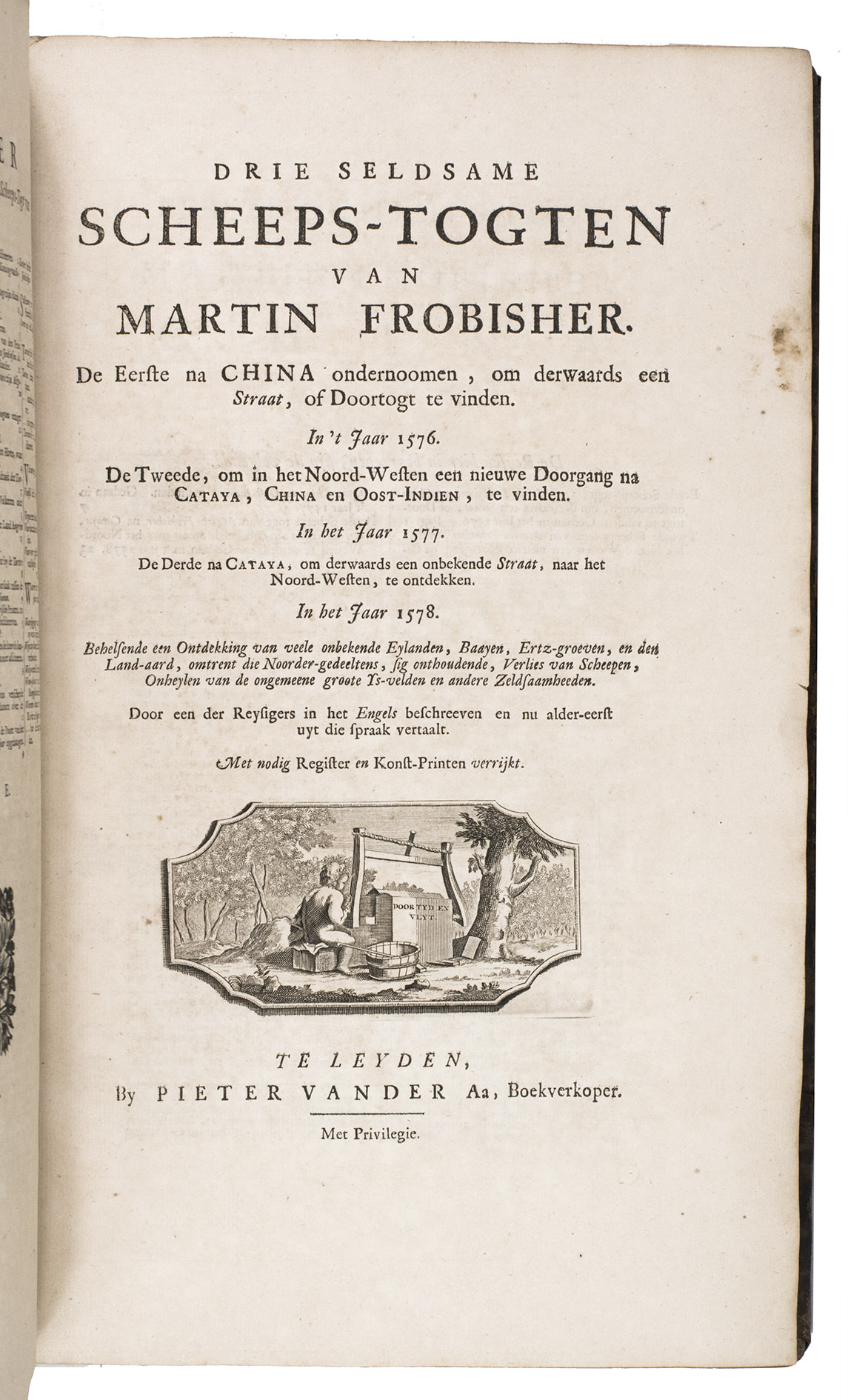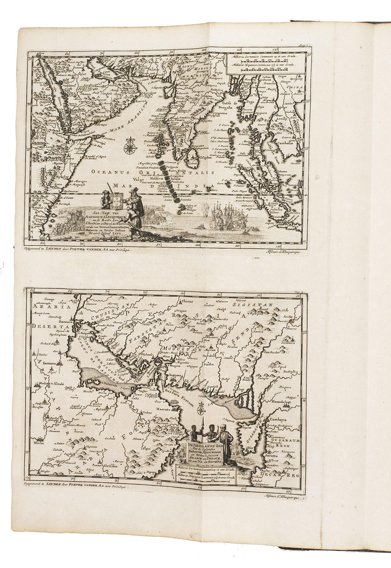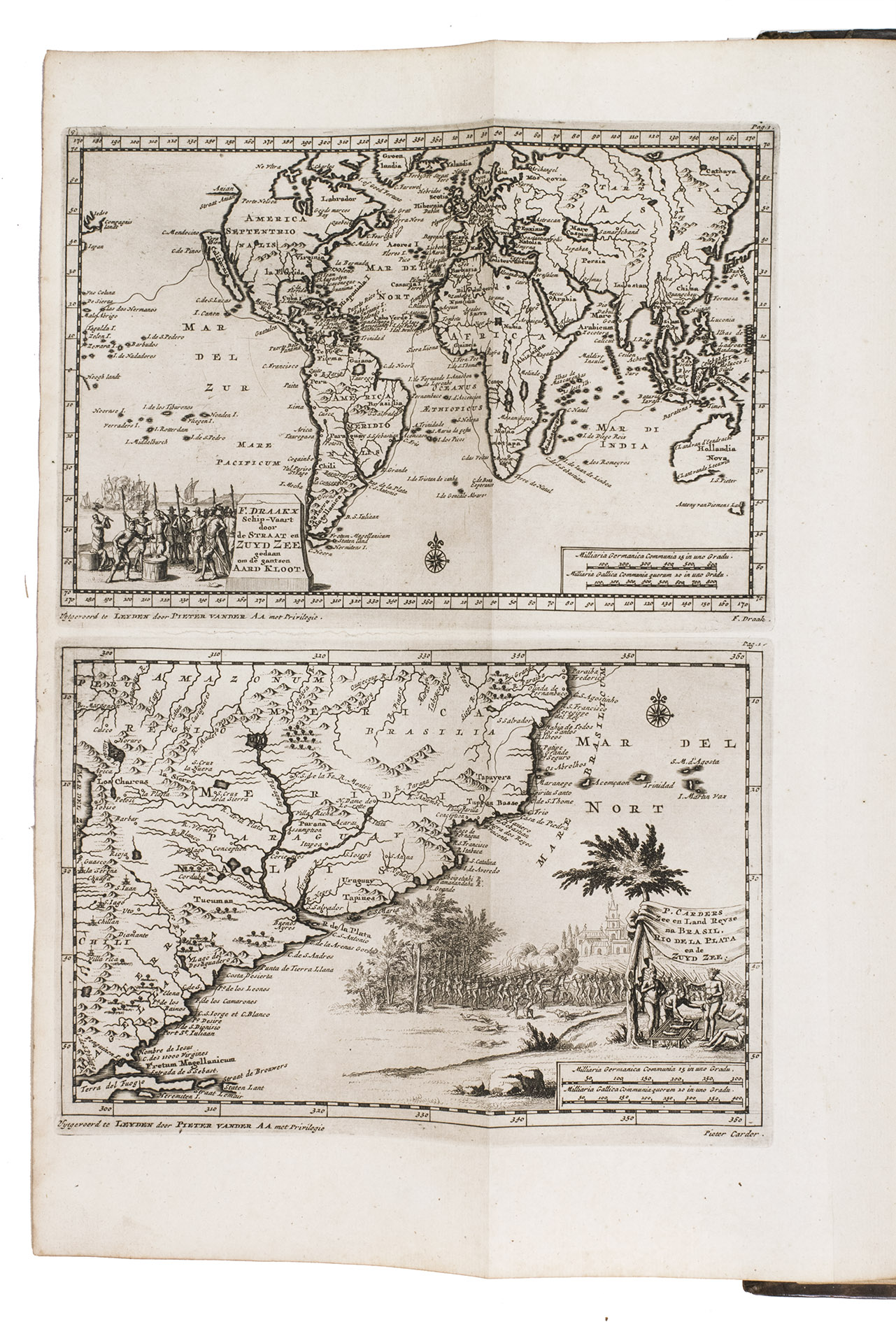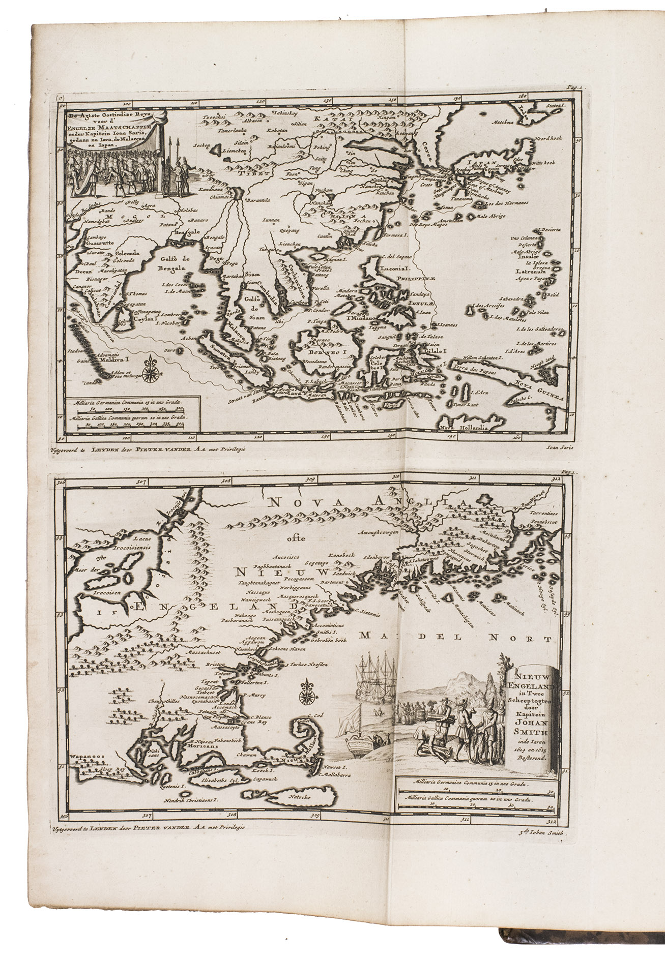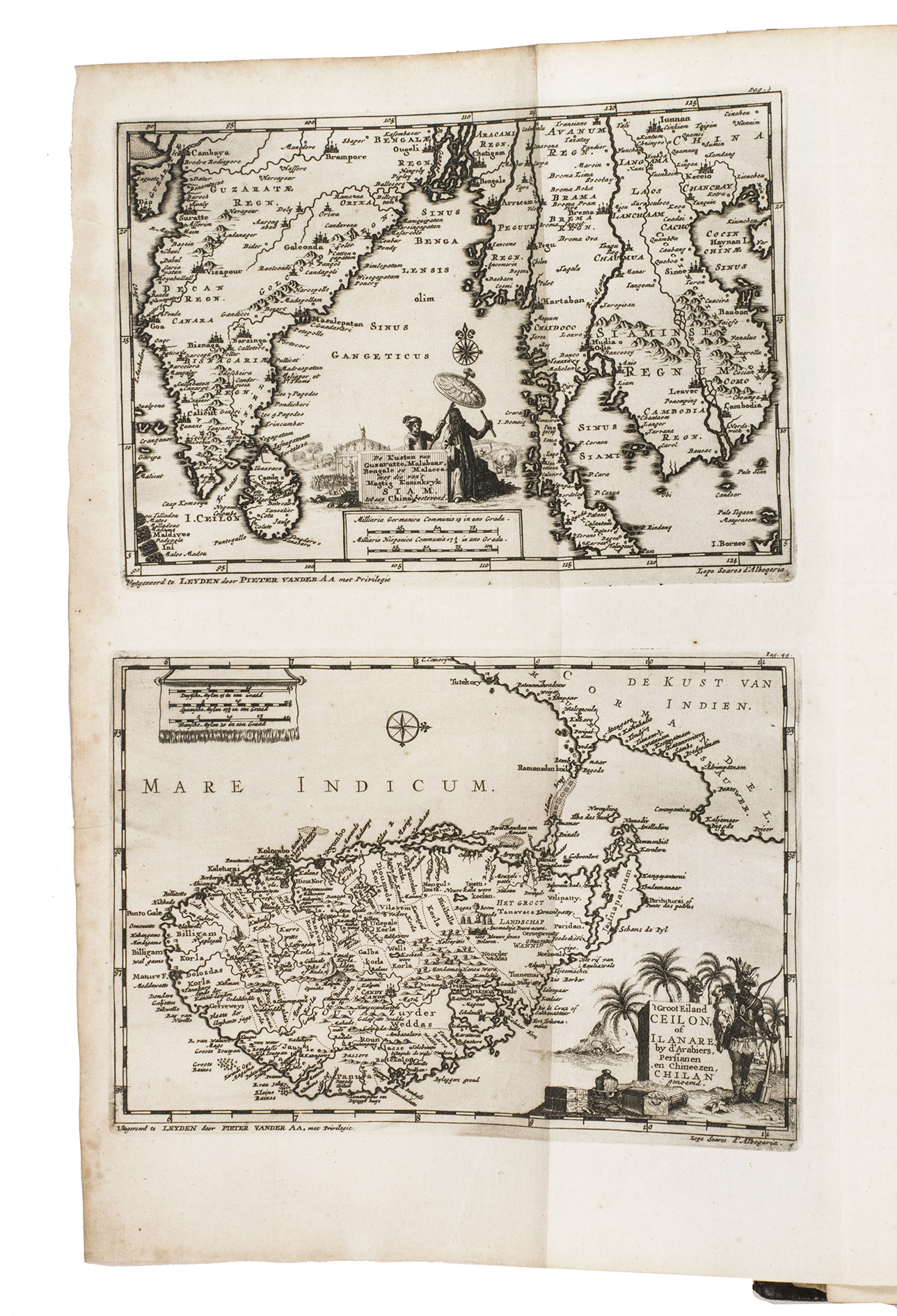 The first and last few leaves of two of the volumes are slightly frayed at the edges, the work is occasionally slightly browned, with minor water stains at the end of 2 volumes. Otherwise in very good condition. Cordier, Japonica, p. 32 (note); Cordier, Sinica, 1942f; Muller, America, 1889; Sabin 3 (note); Tiele 10; cf. Hoftijzer, P.G., Pieter van der Aa (1659-1733), Leids drukker en boekverkoper (1999).