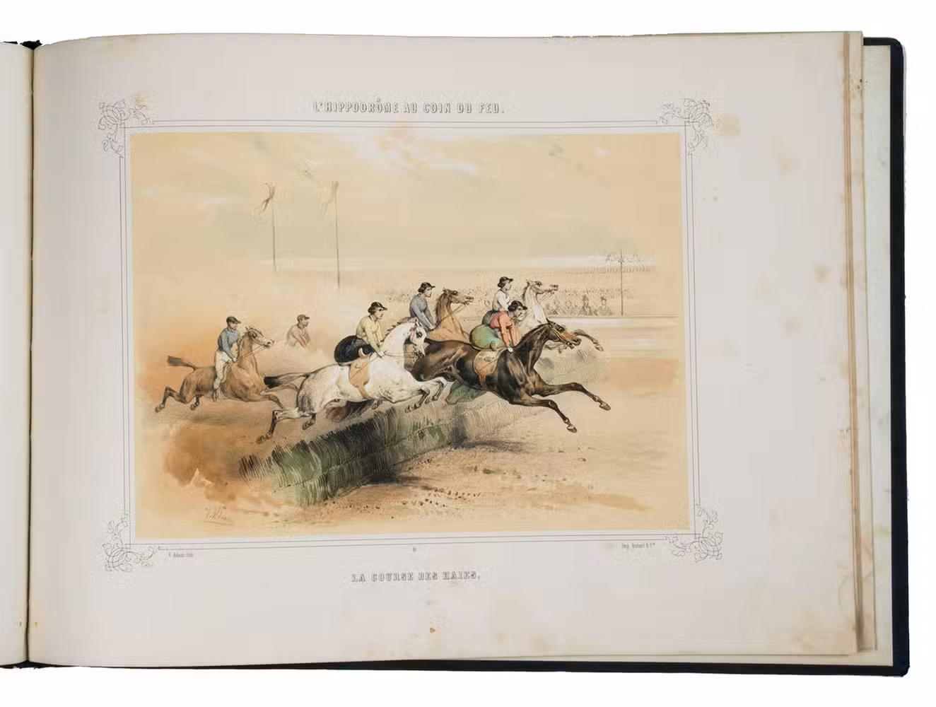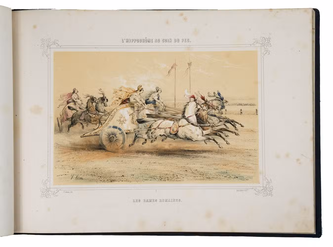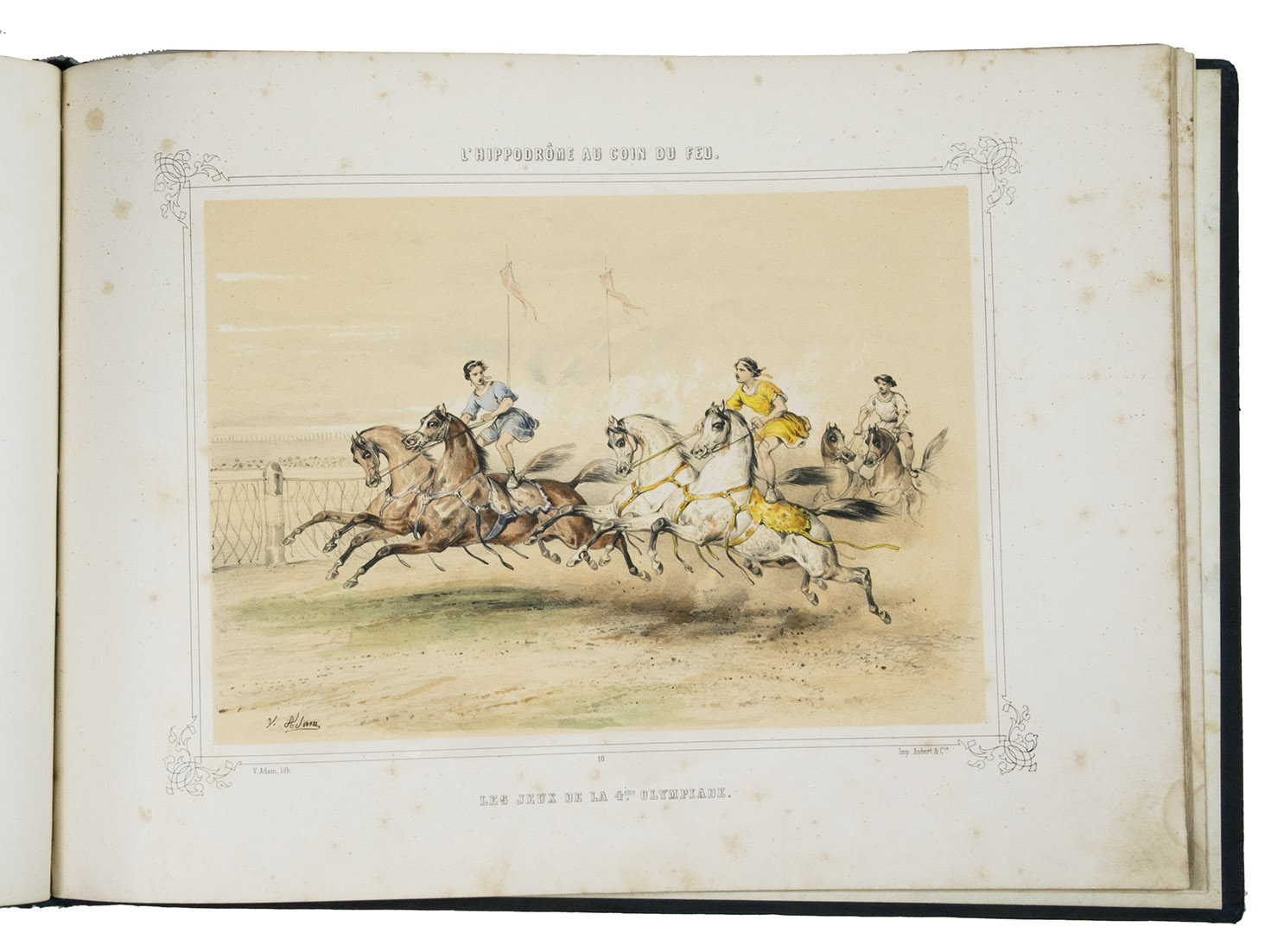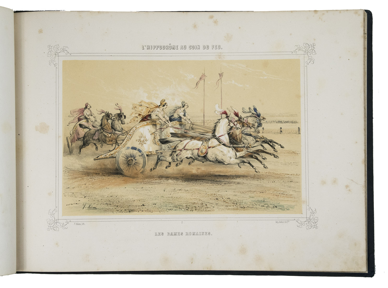 A fine example of Adam's expertise in lithography. The plates depict a variety of unusual equestrian racing scenes including chariot racing with women driving, and monkeys riding horseback.
