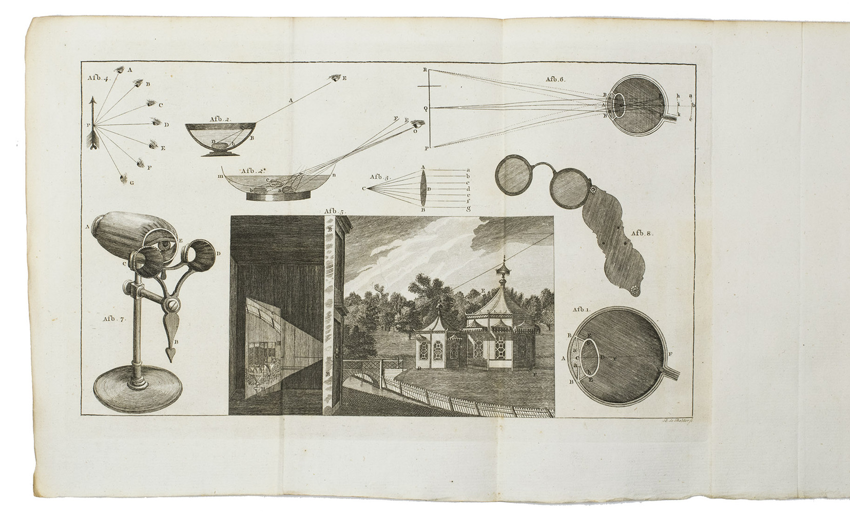 Amsterdam, H. Gartman, W. Vermandel, J.W. Smit, 1792. 8vo. Large folding engraved plate with 8 images concerning optics such as cross-sections of the human eye, camera obscura, spectacles etc. Contemporary stiff sprinkled wrappers. [8], 174, [2] pp.