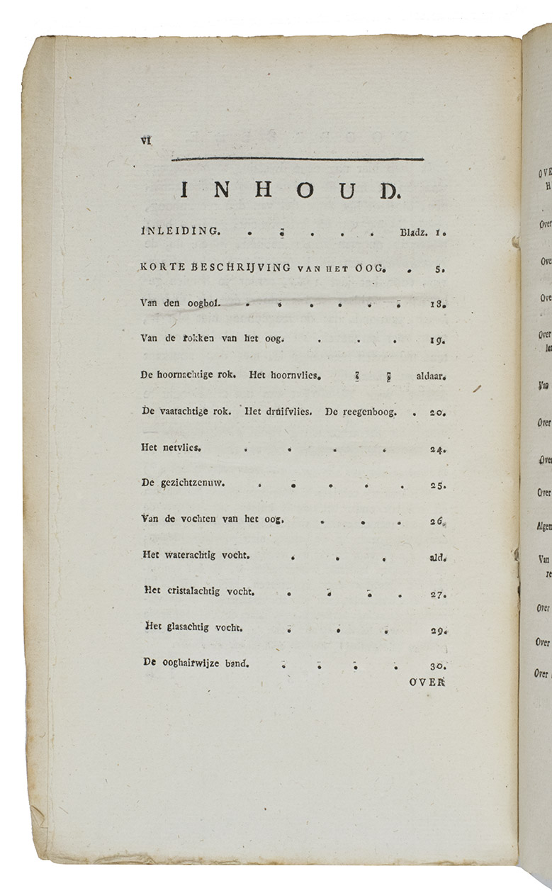 First and only edition of the Dutch translation, after the second English edition of 1792, of a detailed account of the anatomy of the eye, the use of spectacles and the improvement of vision by their use. The first edition of Adams's work had appeared in 1787 under the title An essay on vision, briefly explaining the fabric of the eye. George Adams (1750-1795), a famous London optician, served King George III as a mathematical instrument maker. He earned a worldwide reputation as a maker of spectacles and microscope lenses and wrote many elementary scientific works, which gave regular and systematic instruction in the most important branches of natural science with all its modern improvements.
