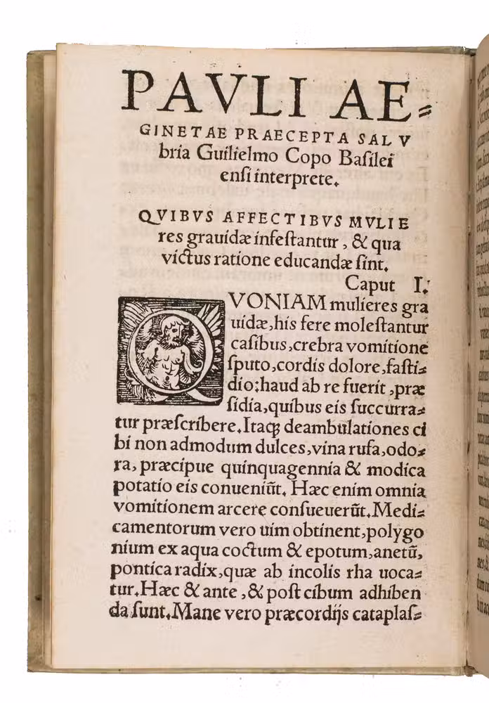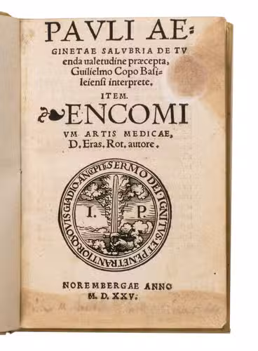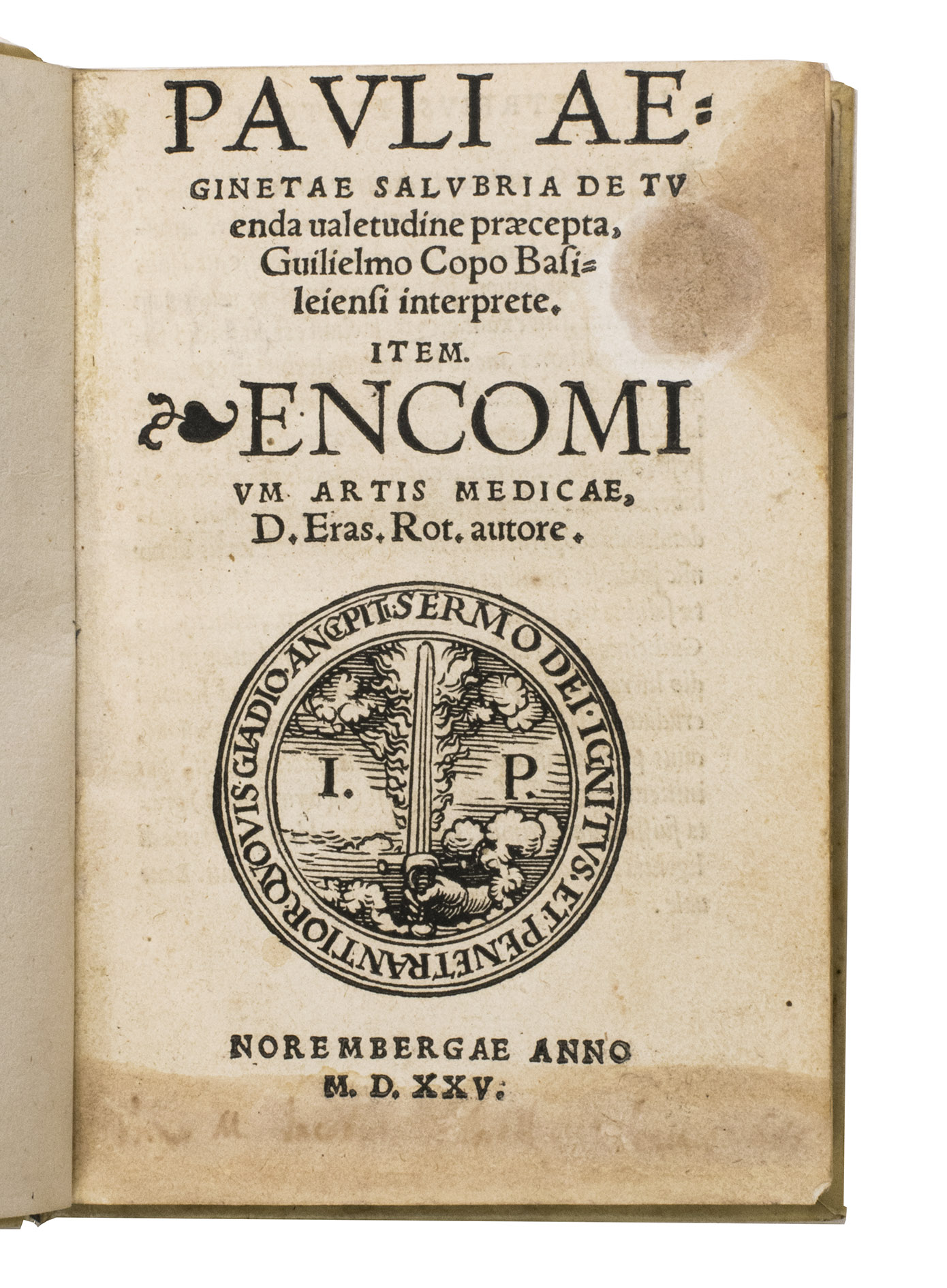 First Nuremberg edition of Erasmus' declaration in praise of medicine. His essay, which was first published in 1518, is a comprehensive summary of his beliefs about the medical profession, and one of his most articulate expressions of his views of the art of medicine. In it, he praises medical doctors as saviours of not only the body, but of the whole person, writing that the physician is to the body what the priest is to the soul. As Erasmus was in poor health, he placed great importance on hygiene and cleanliness. In the present edition, his essay therefore follows the famous manual on hygiene and dietetics by Paulus Aegineta (fl. 7th century), the most prominent medical writer of the Byzantine era.