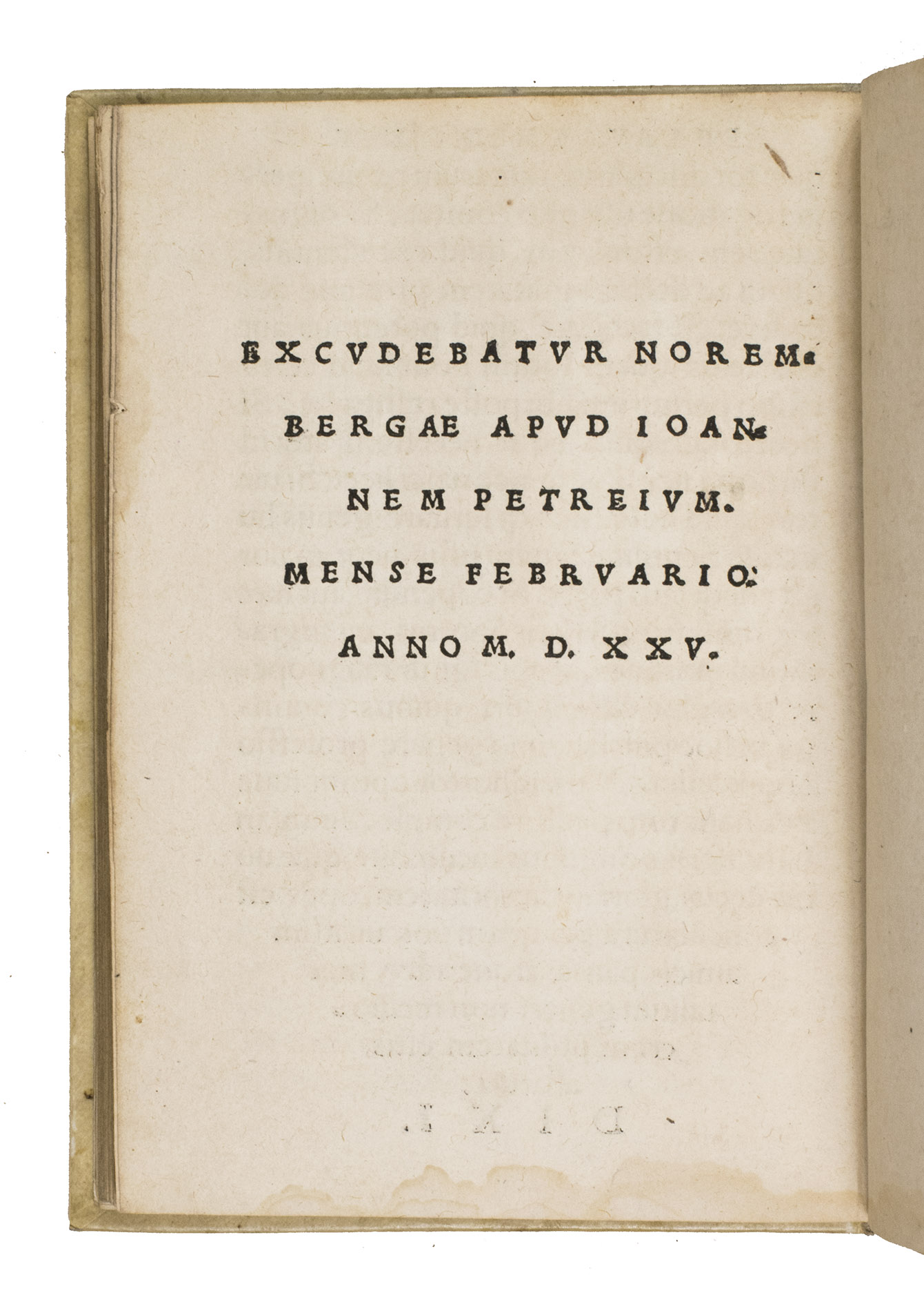 Nuremberg, (colophon:) Johann Petrejus, February 1525. Small 8vo. With a woodcut printer's device on the title page, and 2 decorated woodcut initials. Later vellum with a red morocco title label on the spine lettered in gold. [80] ll.