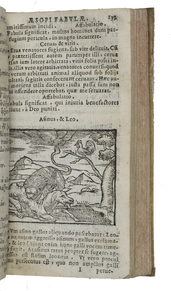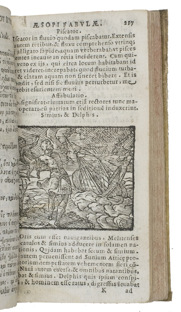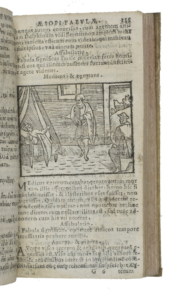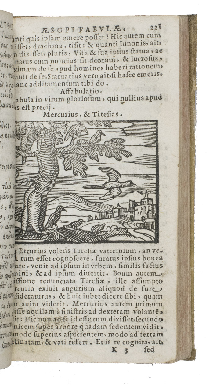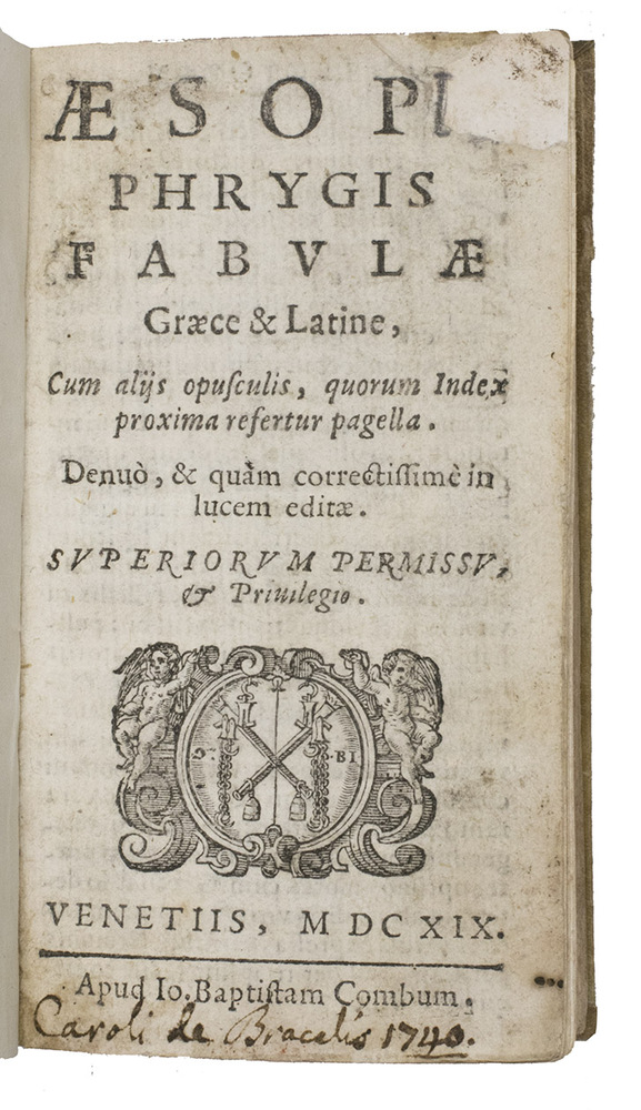 One of the many school editions of the fables of Aesop with the same title (at least 8 between 1524 and 1589, some printed in Basel by Froben, others in Venice), with parallel Greek and Latin text printed on facing pages.