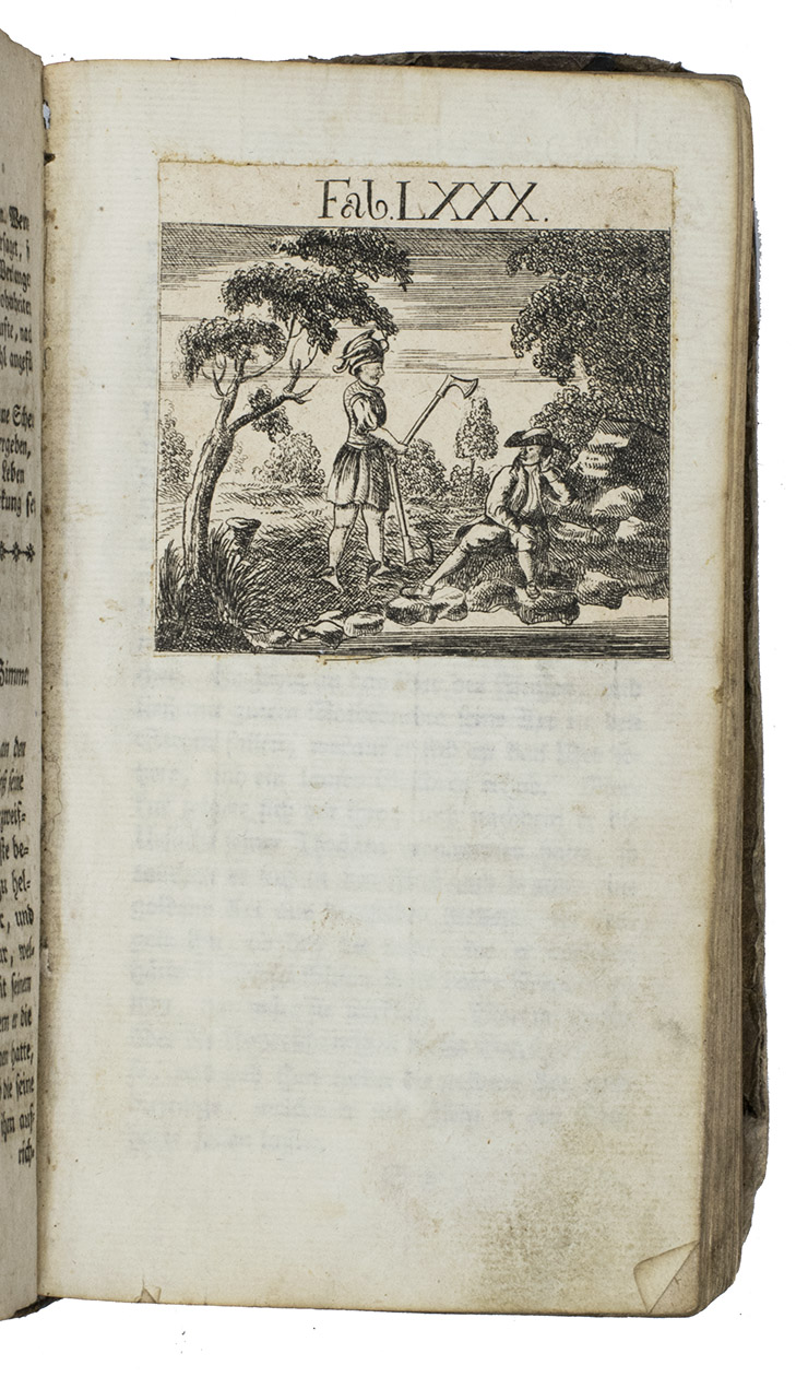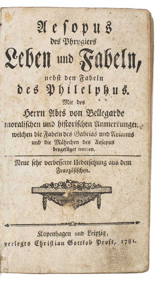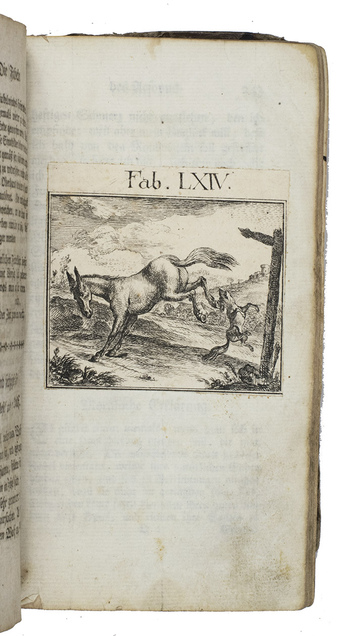 Copenhagen, [widow of Gabr. Christ. Rothen] & Leipzig, Christian Gottlob Prost, 1781. 8vo. With a woodcut title-vignette, woodcut head- and tailpieces and 117 etchings with captions "Fab. I-CXVII" illustrating the 117 Aesop fables, each pasted on separate leaves, except the last one (Fab. CXVII). Contemporary half calf, brown paper sides, brown morocco spine label with the title in (oxidized) gold. XXIV, 576 pp.