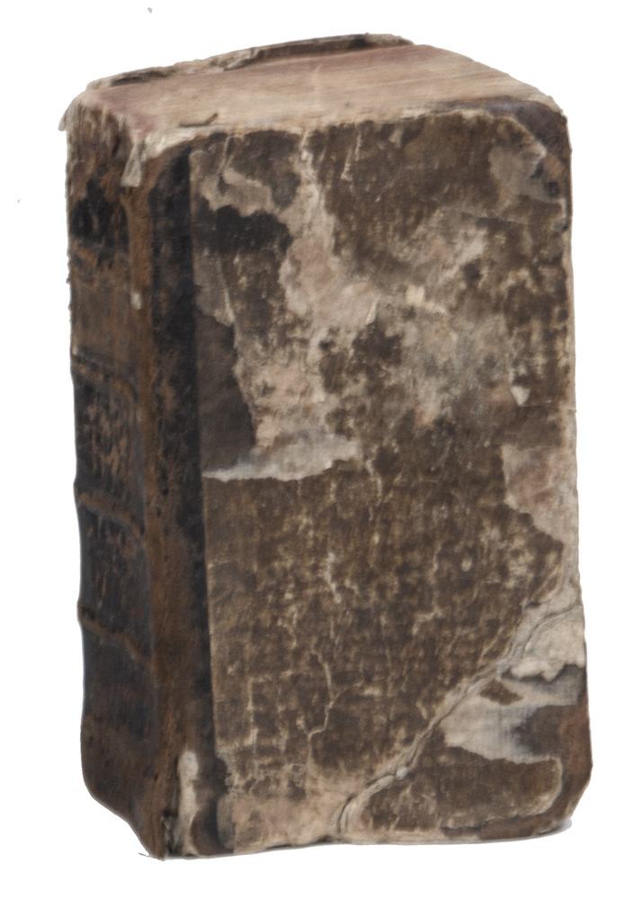 Leather worn, top of spine lacking, boards damaged with the right corner of the front board nearly cracked, hinges weak. Some small stains. Otherwise in good condition. Cf. Bodemann, 97.4 (first edition); not in Fabula docet.