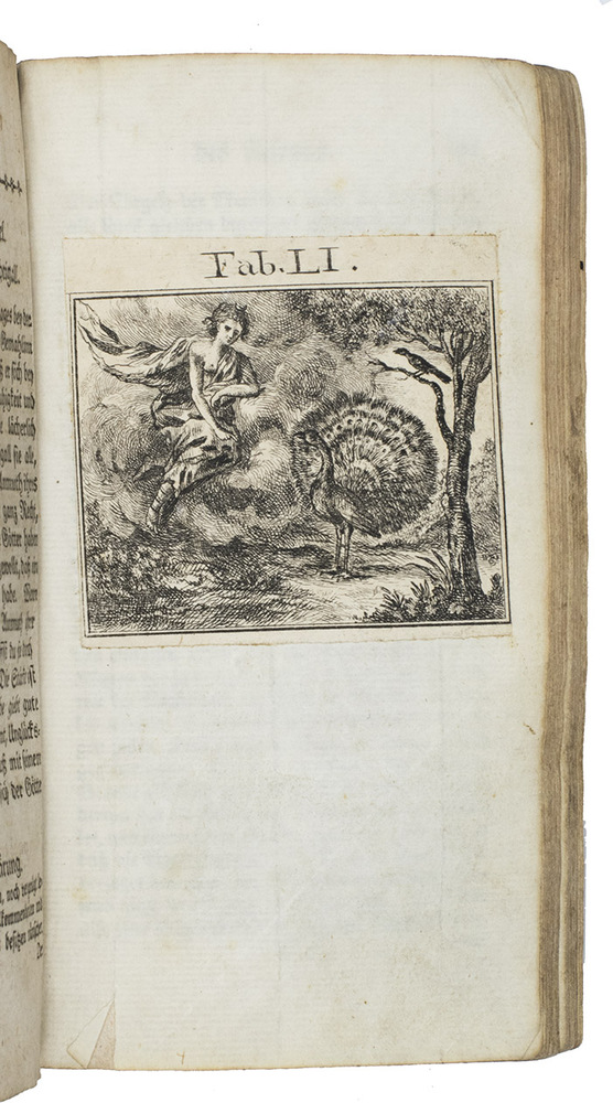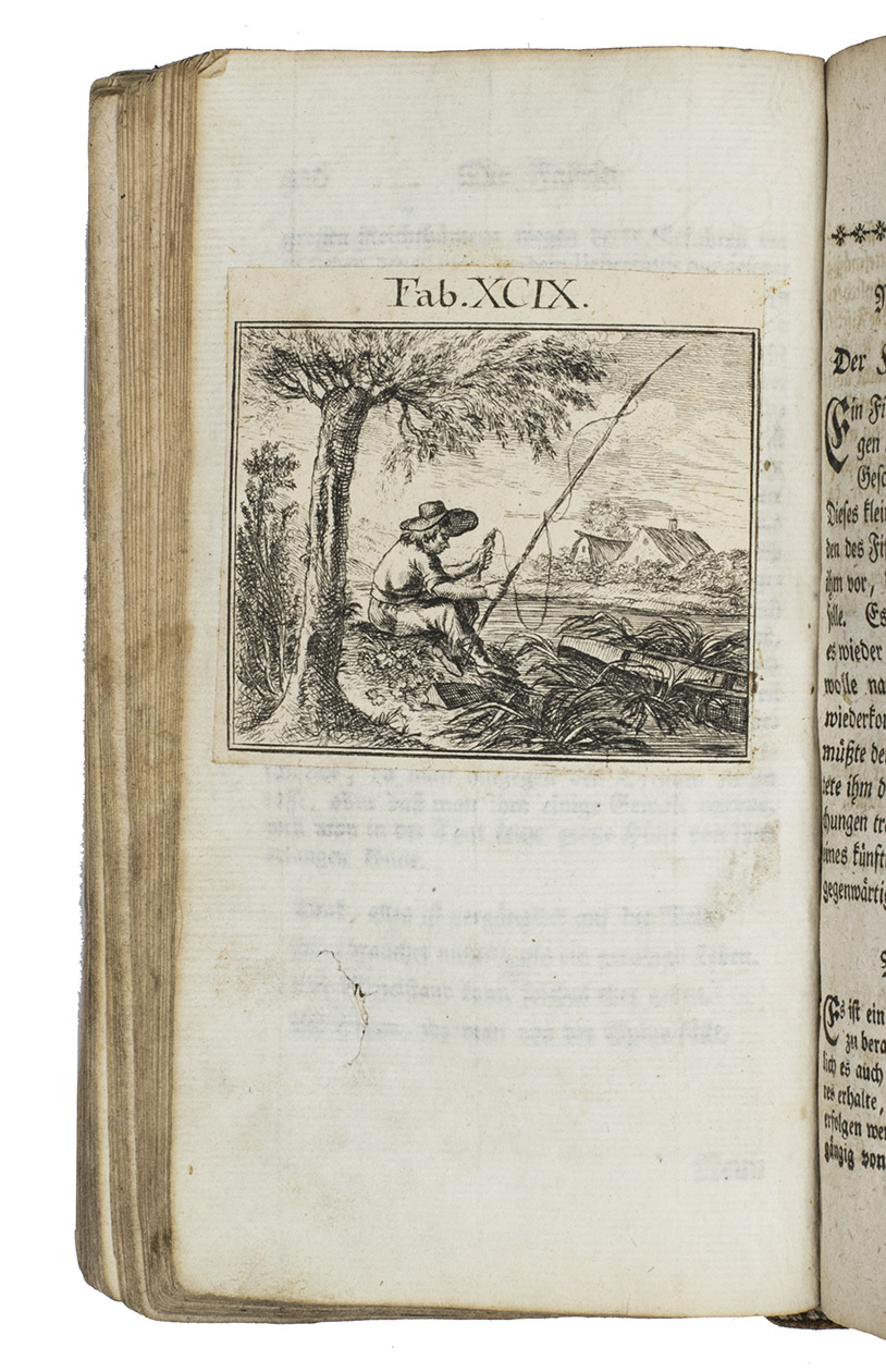 The second edition of the German translation of the French edition of the Aesop fables by Jean-Baptiste Morvan de Bellegarde (1648-1734), with extensive dialogues on the moral of each fable together with the life of Aesop by Planudes, the 18 fables of the Italian renaissance humanist and classical scholar Francesco Philelphus (1398-1481), and the fables of Gabrias and Avianus (Amsterdam, for Pierre Mortier, 1708). The first edition appeared in Copenhagen by the widow of Gabr. Christ. Rothen, und in 1769 in Leipzig by Christian Gottlob Prost (Bodemann, 97.4). The 117 etchings illustrating the Aesop fables are after the engravings of the first edition, but are different.