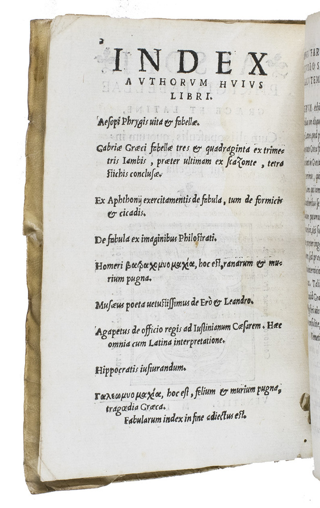 Venice school edition of Aesop's fables with parallel text in Greek and Latin. The book is neatly printed and the clear Greek type has relatively few ligatures. Besides the life of Aesop and Aesop's fables, the book contains several collections of fables and single fables by other authors (pp. 232-364): [Ignatius von Nicaea], Gabriae Graeci fabellae (often added to the Aesop canon); Aphthonius, Excercitamentis de fabula; Philostratus, De fabula; pseudo Homer, Batrachomyomachia (the battle of frogs and mice, a parody of Homer's Iliad); Musaeus, De Ero & Leandro (Hero and Leander; Agapetus, De officio regis; Hippocrates, Ius iurandum (the Hippocratic oath!), and [Theodorus Prodromus], Galeomnomachia (the battle between the cats and the mice), the last two in Greek only. The book ends with a 4-page index and the colophon.