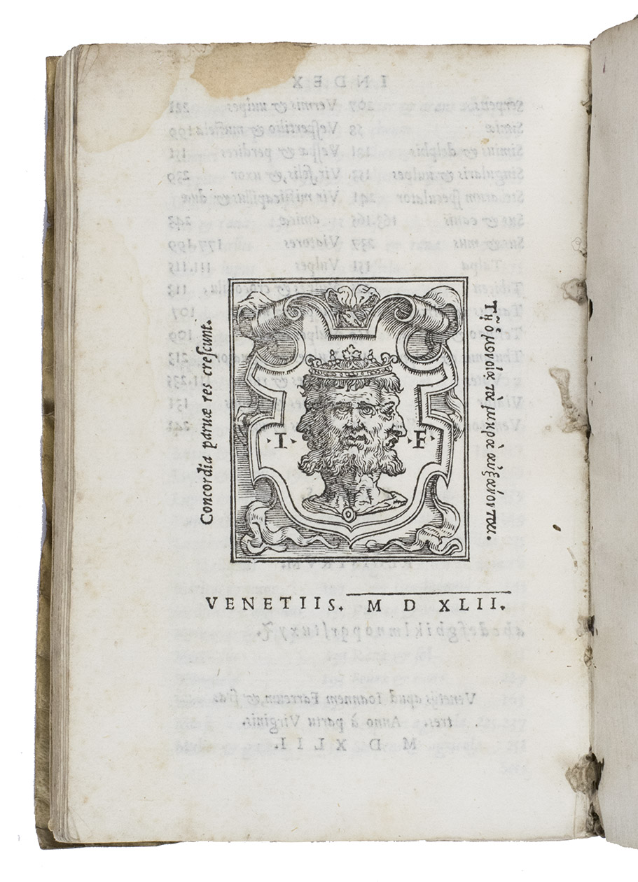Venice, (colophon: Giovanni Farri and brothers), 1542. Small 8vo (16 x 11 cm). With 1 woodcut decorated initial but further with spaces left for manuscript Greek and Latin initials (with printed guide letters). Contemporary limp sheepskin parchment, with fragments of a vellum manuscript used to reinforce the spine. 364, [4] pp.