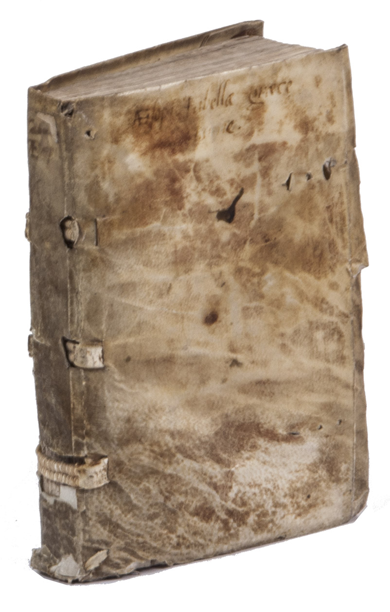 With a few contemporary manuscript notes in brown ink. With some marginal worm holes, mostly in the gutter of quires r and s, and some mostly marginal water stains, more serious in quire c, and a dark stain in the upper outside corner of 2 leaves, not approaching the text, otherwise in good condition. The binding is wrinkled, with a 1½ x 2 cm gap in the backstrip, some small tears and the 2 pair of ties lost. A nice early student edition of Aesop with very extensive additions. EDIT 16, CNCE 364; STC Italian, p. 8; USTC 807871.