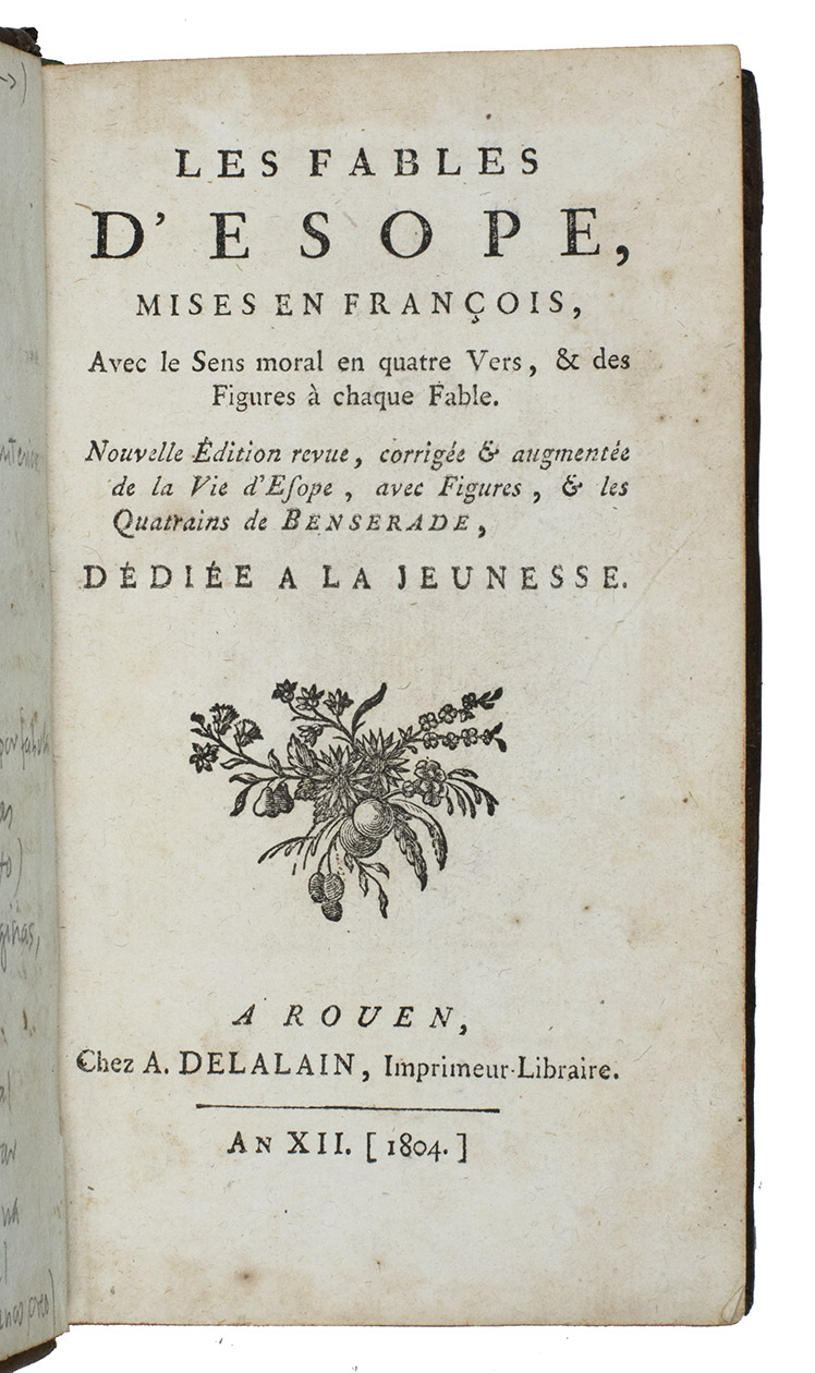 Rouen, chez A. Delalain, An XII [1804]. 12mo. With a full-page woodcut portrait (97 x 72 mm.) of Aesop., and 192 woodcuts of ca 56 x 72 mm., illustrating the Vie dÉsope (28) and 164 out of a total of 225 Fables; woodcut head- and tailpieces. Mottled calf over boards.. [8], C, 314, [2] (out of 10) pp.