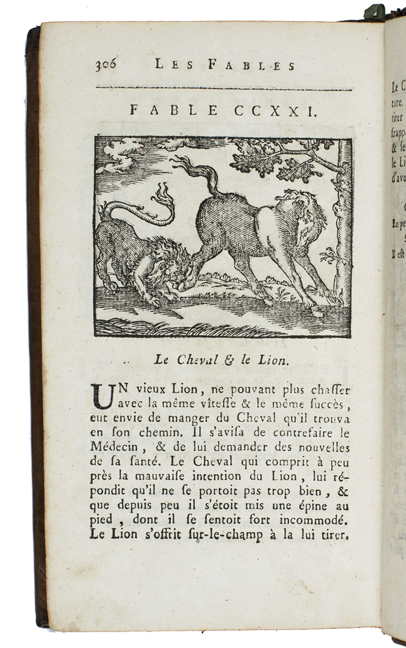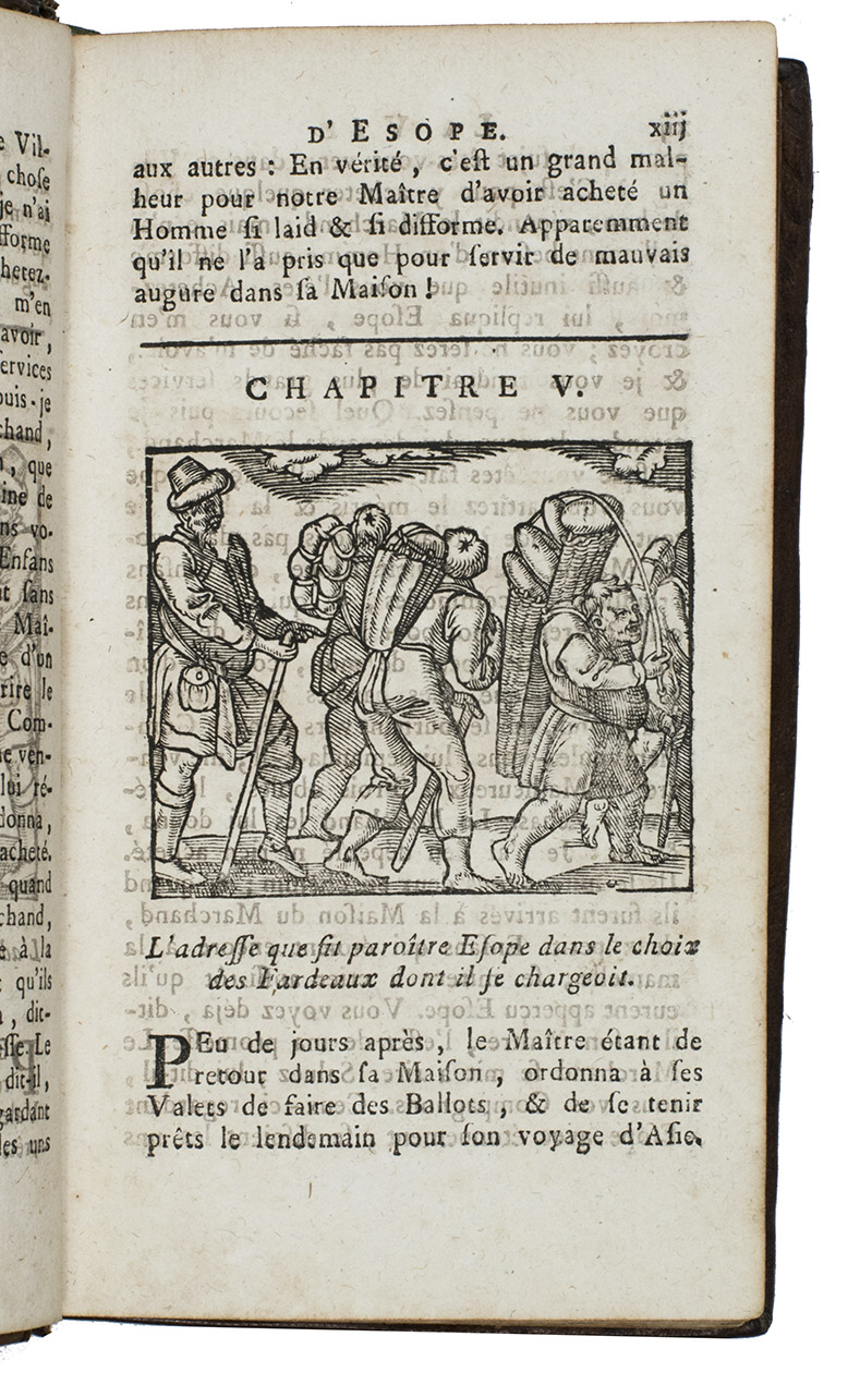 Augmented nicely illustrated re-edition of the editions of 1764 and 1787 with the same collation, printed by Richard Lallemant in Rouen (Bodemann, 113.1-2). As in these editions, also in our edition there are the 225 fables of Aesop in French prose with the quatrains by the French writer and dramaturge Isaac Benserade (1612-1691). The translation of the Vie dÉsope is illustrated with 28 woodcuts; the other 164 woodcuts illustrate 164 Fables. They are after the series of Bernard Salomon and Marcus Gheeraerts.