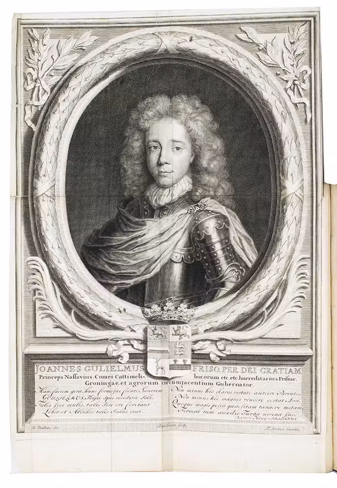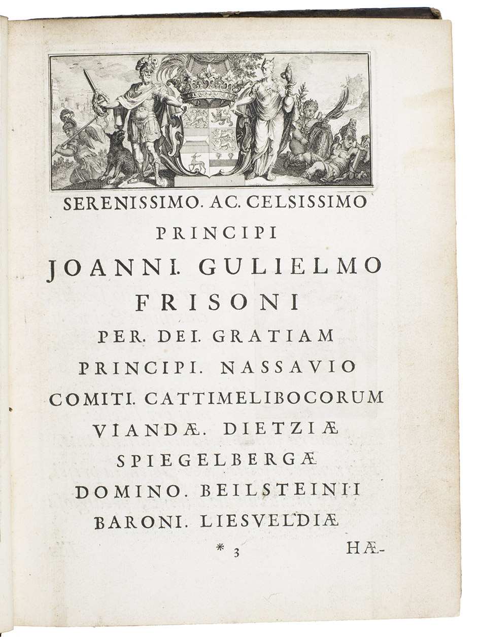 With the bookplate of John Blackburne on the front paste-down. Spine damaged, front hinge weak, paper sides worn and partly torn off, some small marginal tears in the portrait of Johan Willem Friso, but otherwise in good condition. Bodemann, 94.1; Fabula docet 42; Landwehr, F163; Schwabe/Barbier, pp. 69-70.