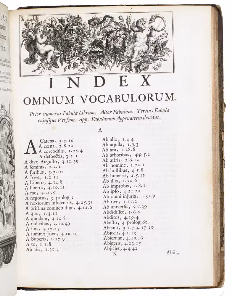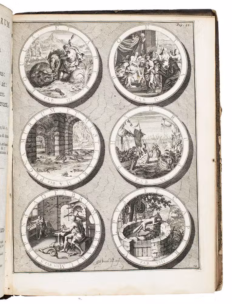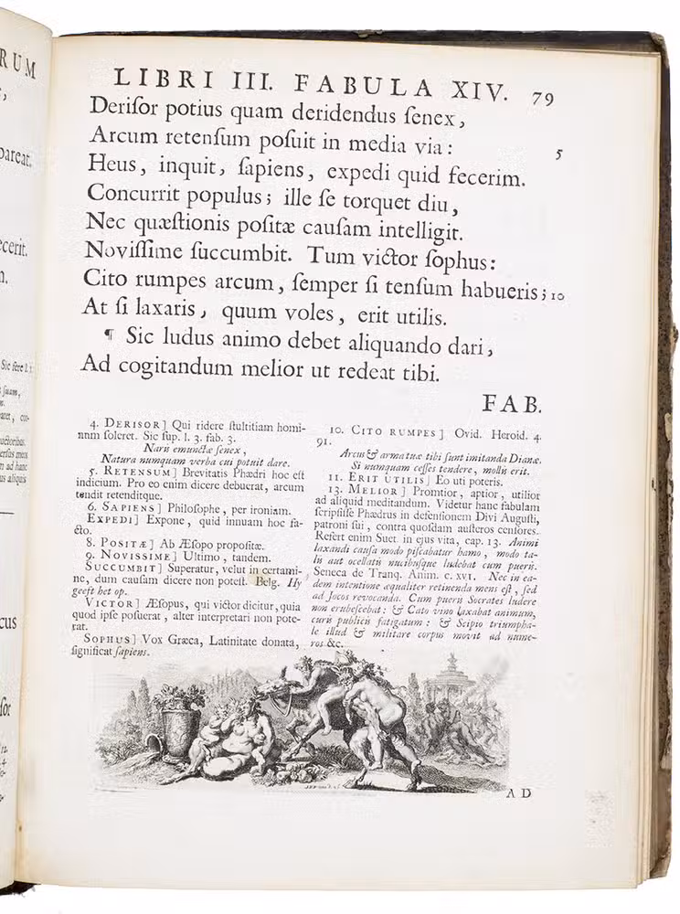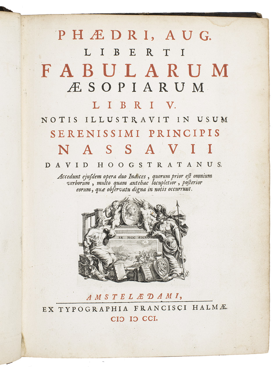 Gorgeous edition of the 94 Aesop fables with 5 additional fables found by the German philologist and classical scholar Marquart Gudius, together with his extensive and scholarly notes, printed in two columns below each fable, the whole prepared by David van Hoogstraten (1658-1724), the conrector of the Latin School of Amsterdam (1694-1722). Apart from being a prolific Dutch and Neo-Latin poet, he was an esteemed linguist and philologist who edited a number of classical authors. His present splendid Phaedrus edition, intended for and dedicated to the young Stadholder of Friesland and Groningen, the "crown-prince" Johan Willem Friso of the Nassau family, is magnificently printed in the style of the French "in usum Delphini" editions made for Le Grande Dauphin.