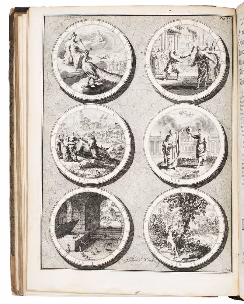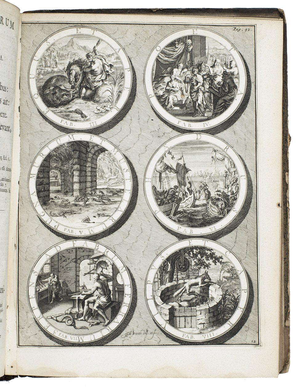 Amsterdam, François Halma, 1701. 4to. With an engraved frontispiece, an engraved printer's device on the title-page, a folding portrait of the dedicatee and 18 engraved plates with 6 roundels on each plate illustrating the 99 fables and 5 prologues, 3 portraits of Aesop and tailpieces and historiated initials. Contemporary half calf, brown sprinkled paper sides, brown spine label with title in gold, red sprinkled edges. [32], 160, [84] pp.