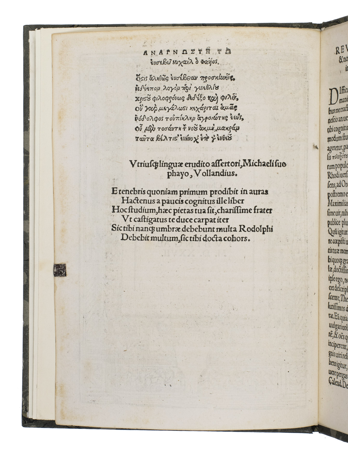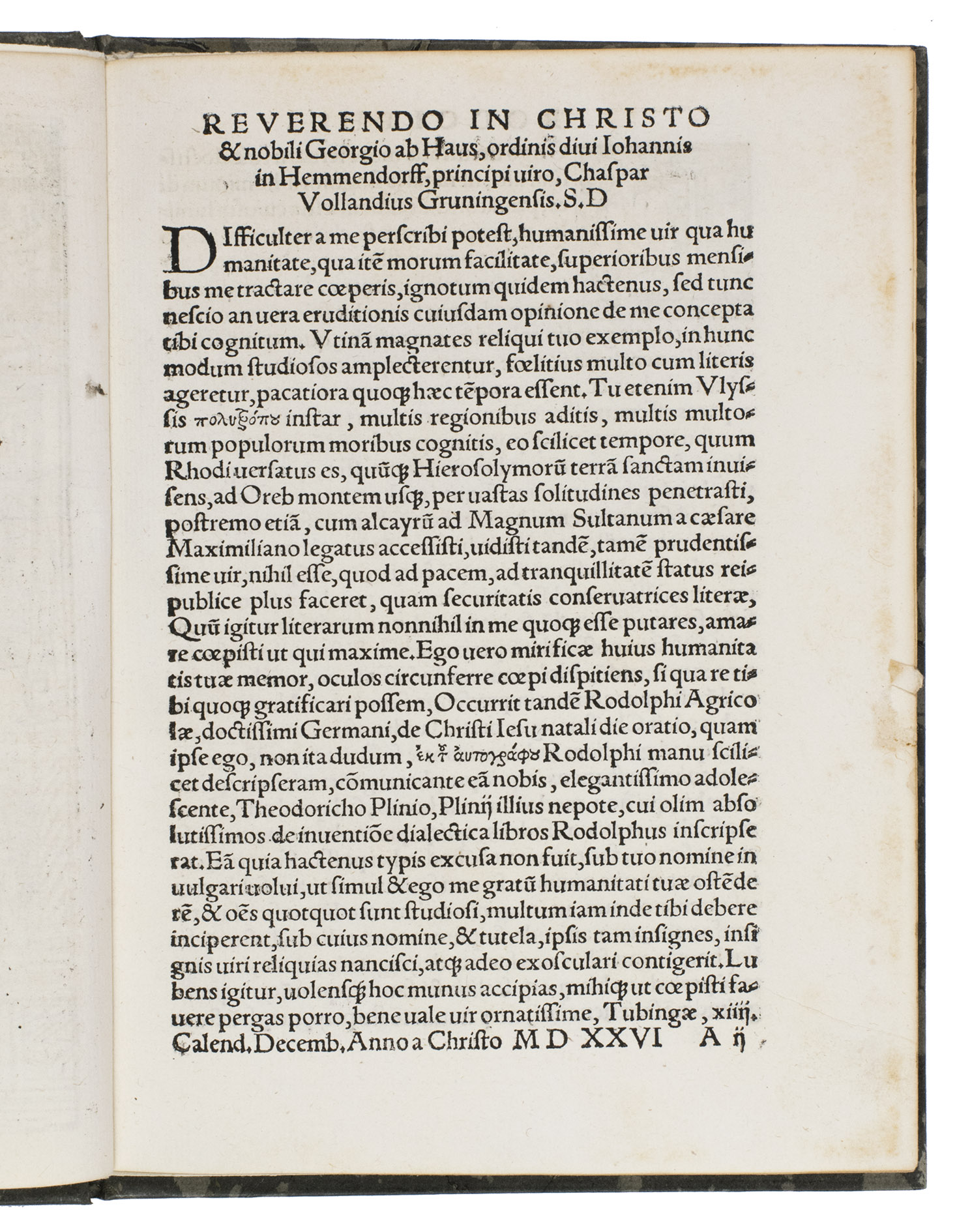 First edition of the celebrated Christmas oration, delivered in 1484 before the assembled clergy of the Diocese of Worms, though the title erroneously dates it to 1486. The oration was given by Rodolphus Agricola (also known as Roelof Huisman, 1444-1485), one of the first Humanists of the northern Low Countries. The editor, Caspar Volland (1500-1554), who taught poetics and rhetoric at Tübingen, ensured that Agricolas eloquent Latin prose reached a wider audience of Renaissance Humanists. The editor, Caspar Volland (1500-1554), who taught poetics and rhetoric at Tübingen, ensured that Agricolas eloquent Latin prose reached a wider audience of Renaissance humanists.