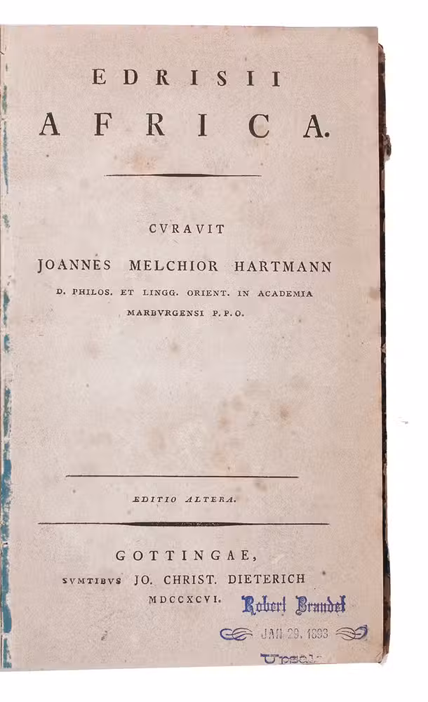 Second edition of a Latin translation of a work on the geography of Africa, written by the Islamic geographer and botanist Muhammad al-Idrisi (1100-1165). It deals specifically with the geography of northern Africa, Egypt and the Sahara desert, covering its soil, cities, population, mountains, deserts, rivers and monuments. Al-Idrisi also mentions various travel routes from one city to the other. Around 1138, al-Idrisi was invited to the court of the king of Sicily, Roger II, who asked him to map the world as it was then known. This map is now lost, but Roger II also asked for supplemental texts to comment on the map. "Emissaries were sent far and wide, and from the information they brought back the Kitab al-Rojari [Book of Roger] was compiled, and completed by January 1154" (Howgego). Various manuscripts containing (parts of the) Kitab al-Rojari have survived, and the present translation was based on one of them. The present work was translated and edited by the Johannes Melchior Hartmann (1764-1817), who worked from a medieval Arabic manuscript at the University of Jena.