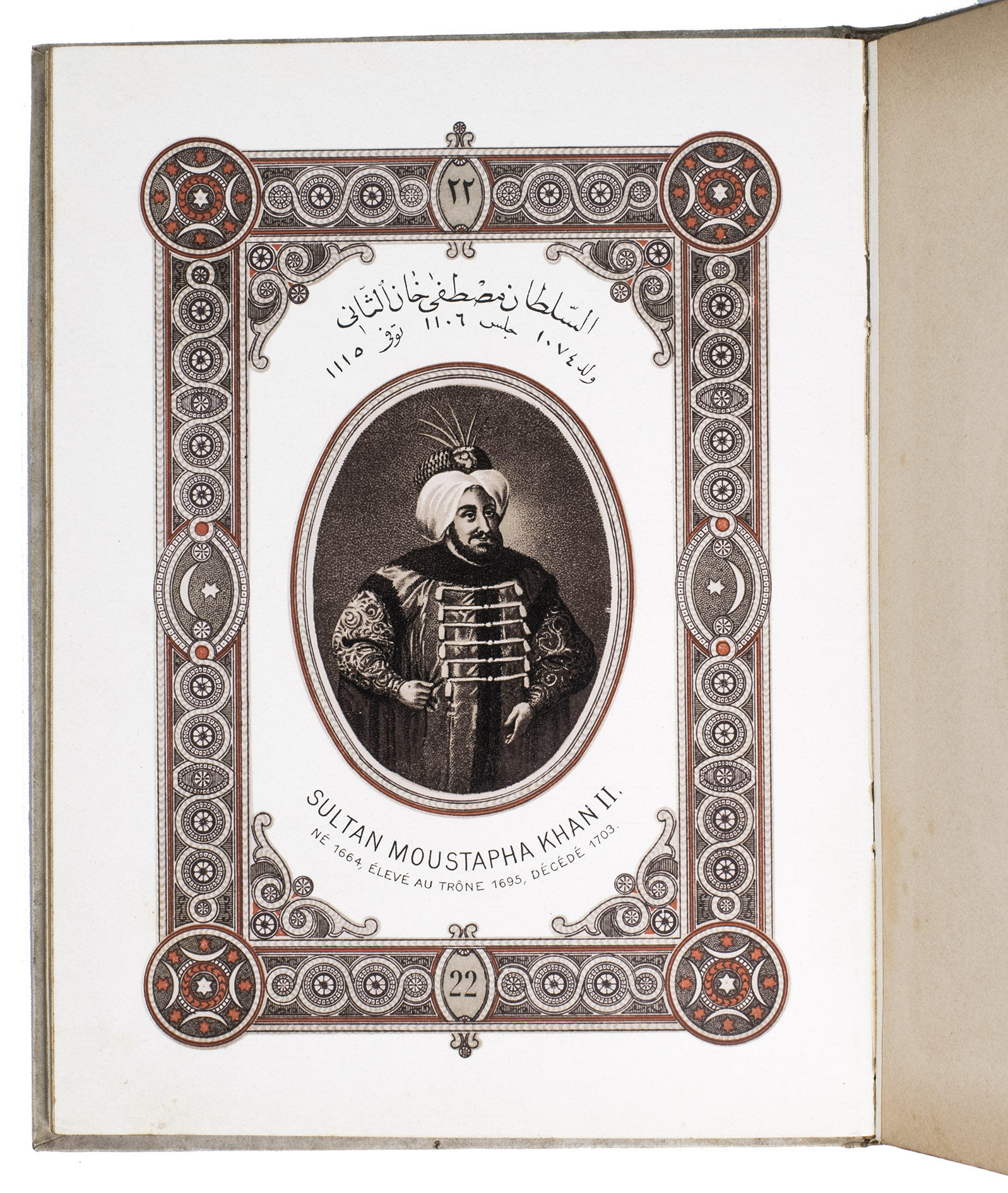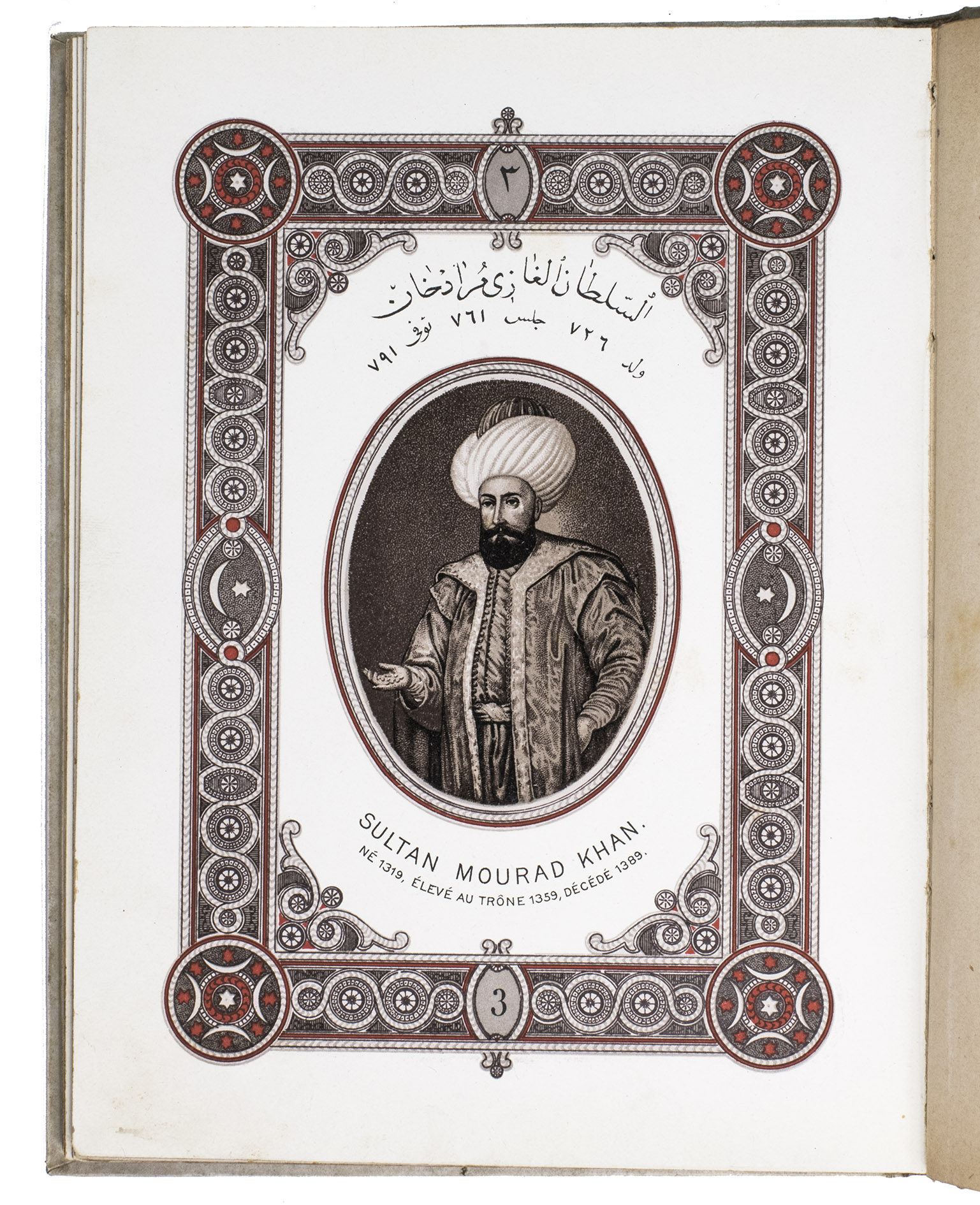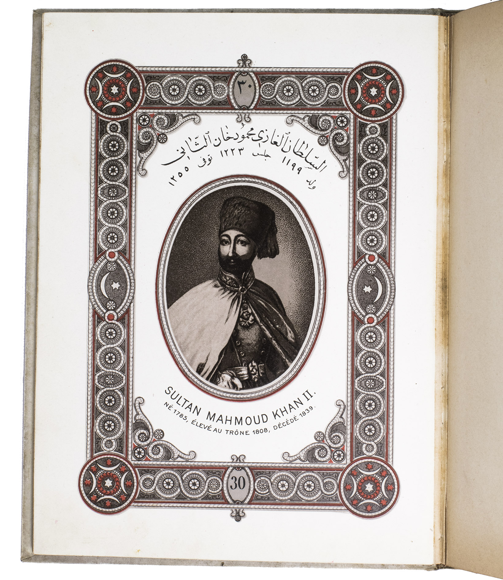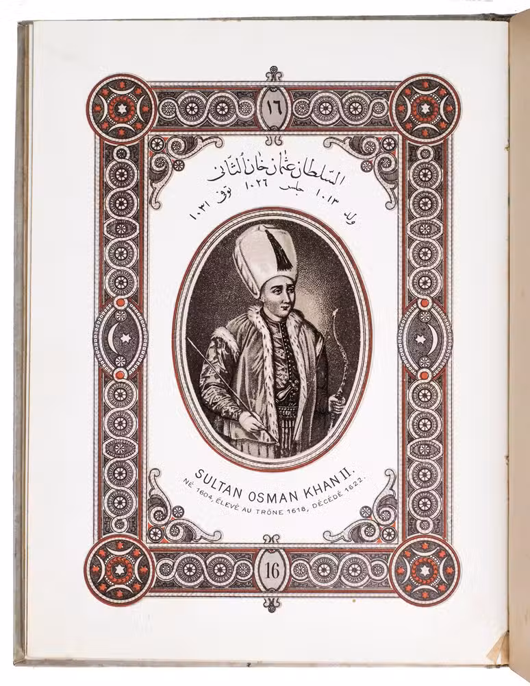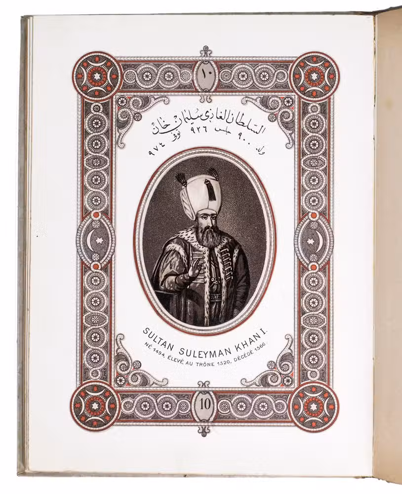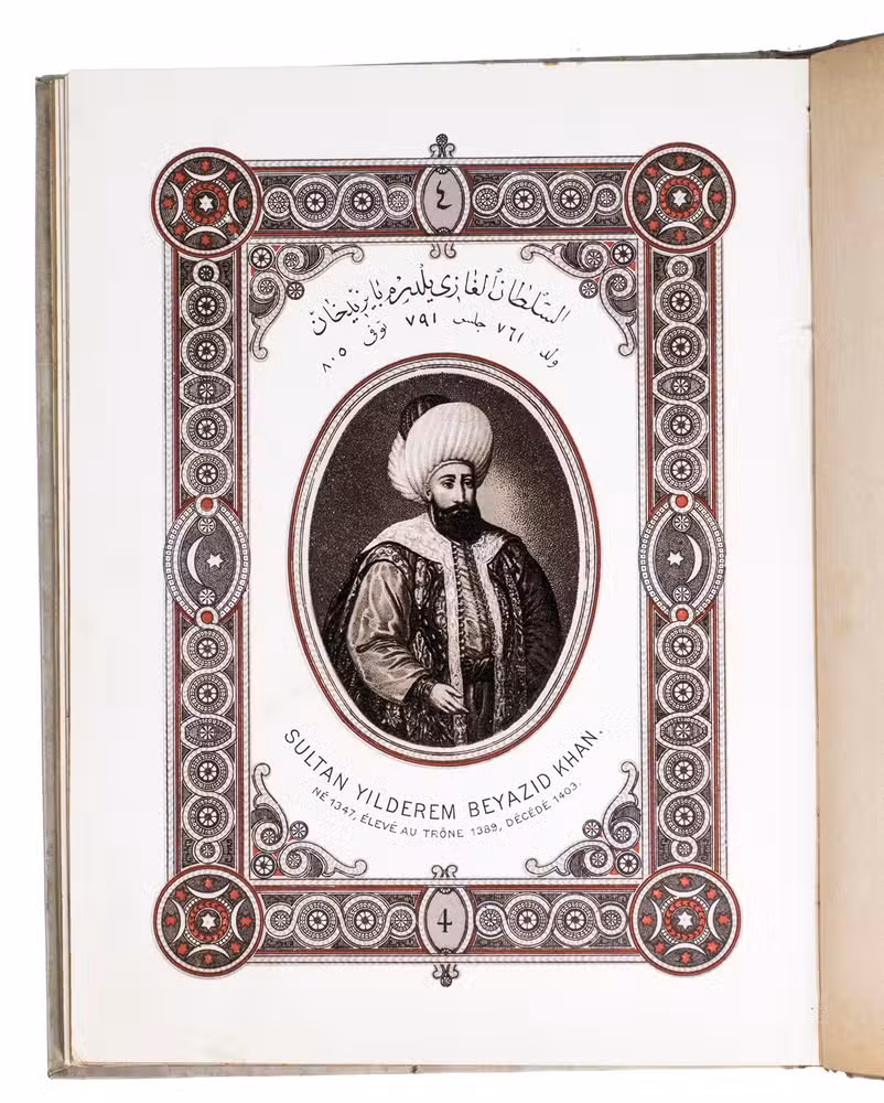 First edition of a series of portraits of all thirty-four Sultans that ruled the Ottoman Empire before the end of the 19th century. They are presented in chronological order from Osman I (r. ca. 1299-ca. 1324), the very first Sultan, to Abdul Hamid II (r. 1876-1909). Each portrait is surrounded by a beautiful geometric border, and accompanied by bibliographical information about the Sultan in Arabic/Ottoman Turkish(?) and French. The work is relatively scarce in libraries and on the market, and we have not found any other copies with the present binding.