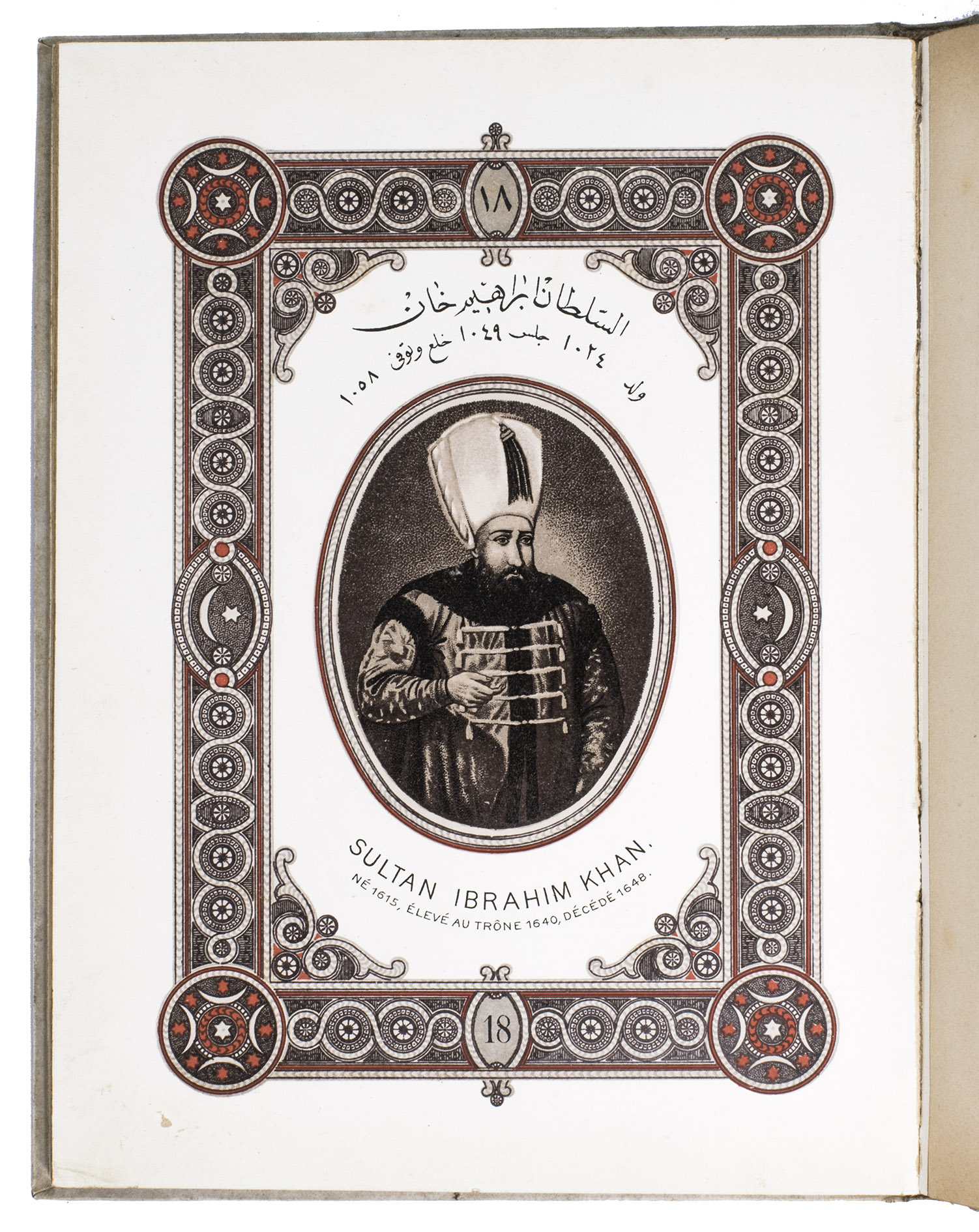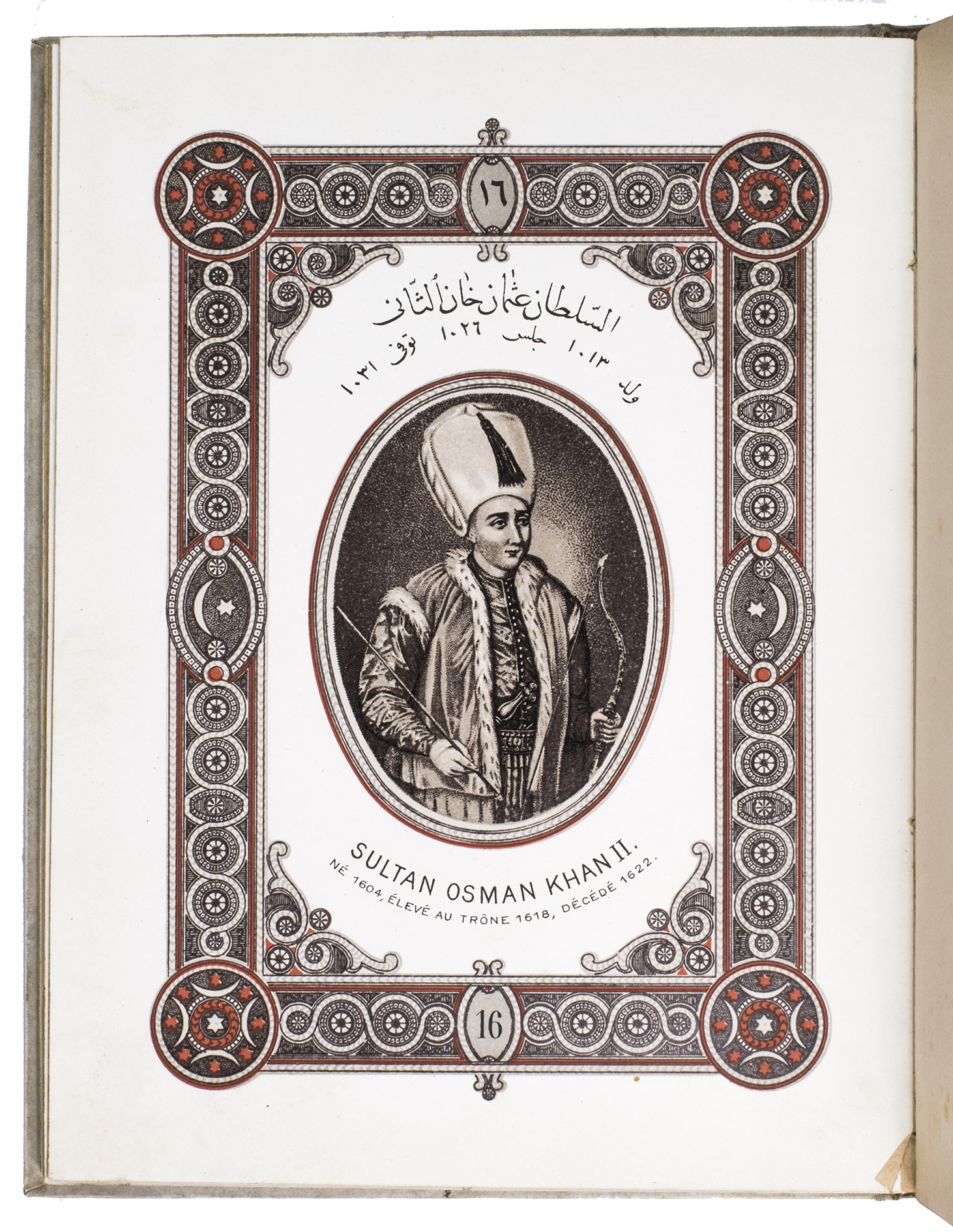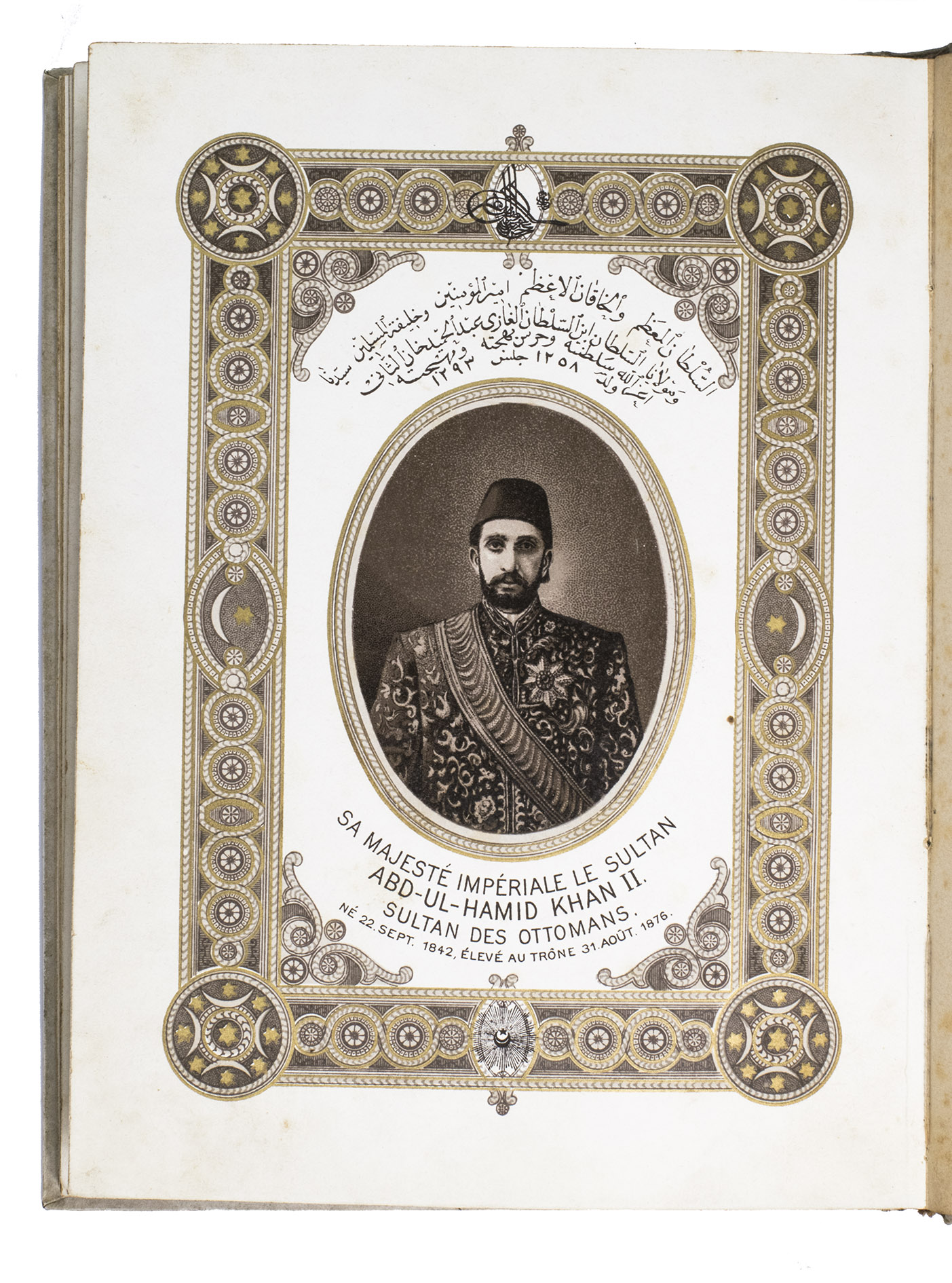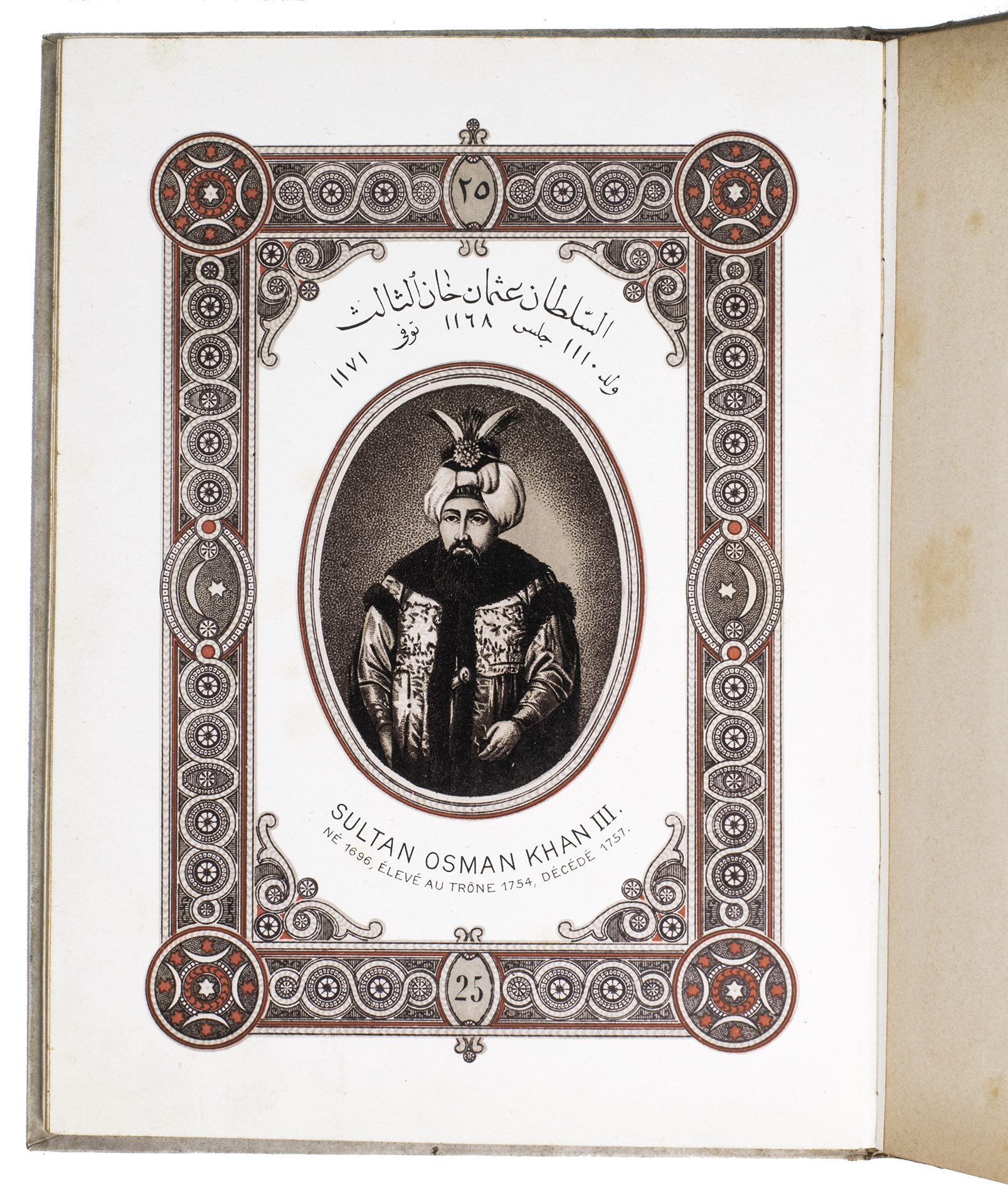 First edition of a series of portraits of all thirty-four Sultans that ruled the Ottoman Empire before the end of the 19th century. They are presented in chronological order from Osman I (r. ca. 1299-ca. 1324), the very first Sultan, to Abdul Hamid II (r. 1876-1909). Each portrait is surrounded by a beautiful geometric border, and accompanied by bibliographical information about the Sultan in Arabic/Ottoman Turkish(?) and French. The work is relatively scarce in libraries and on the market, and we have not found any other copies with the present binding.