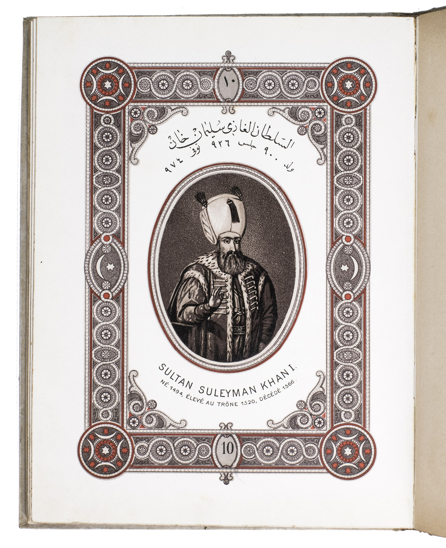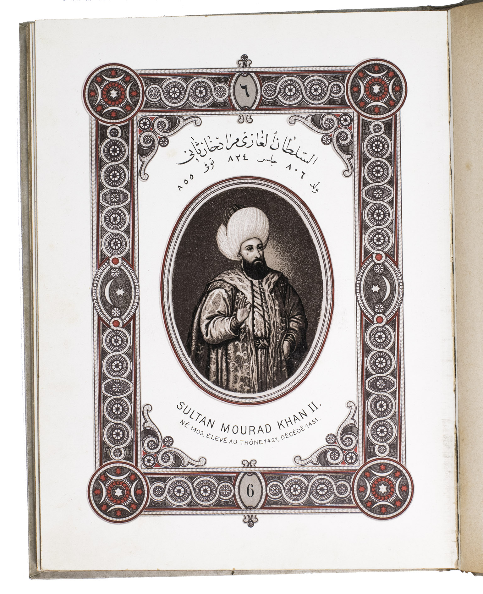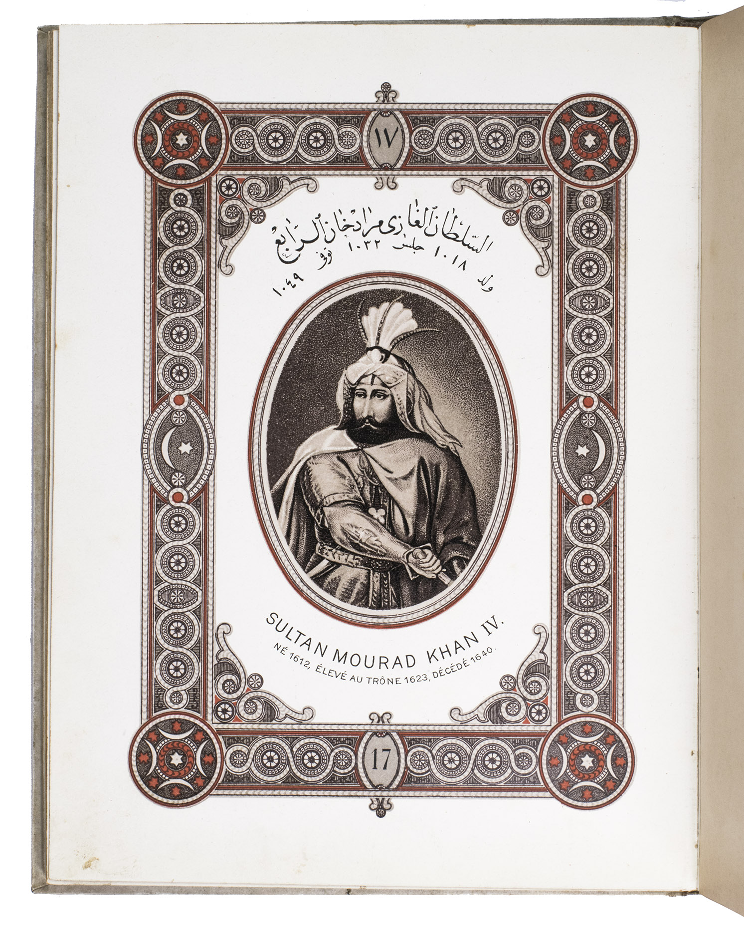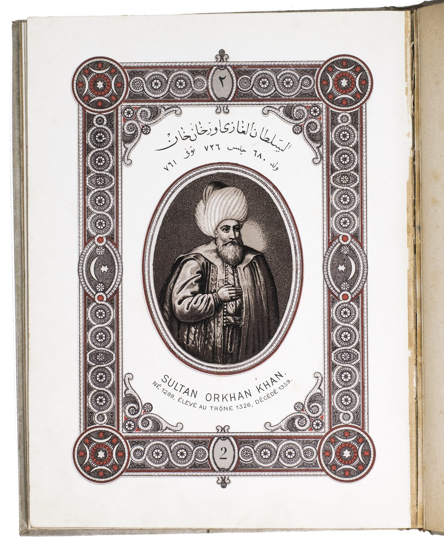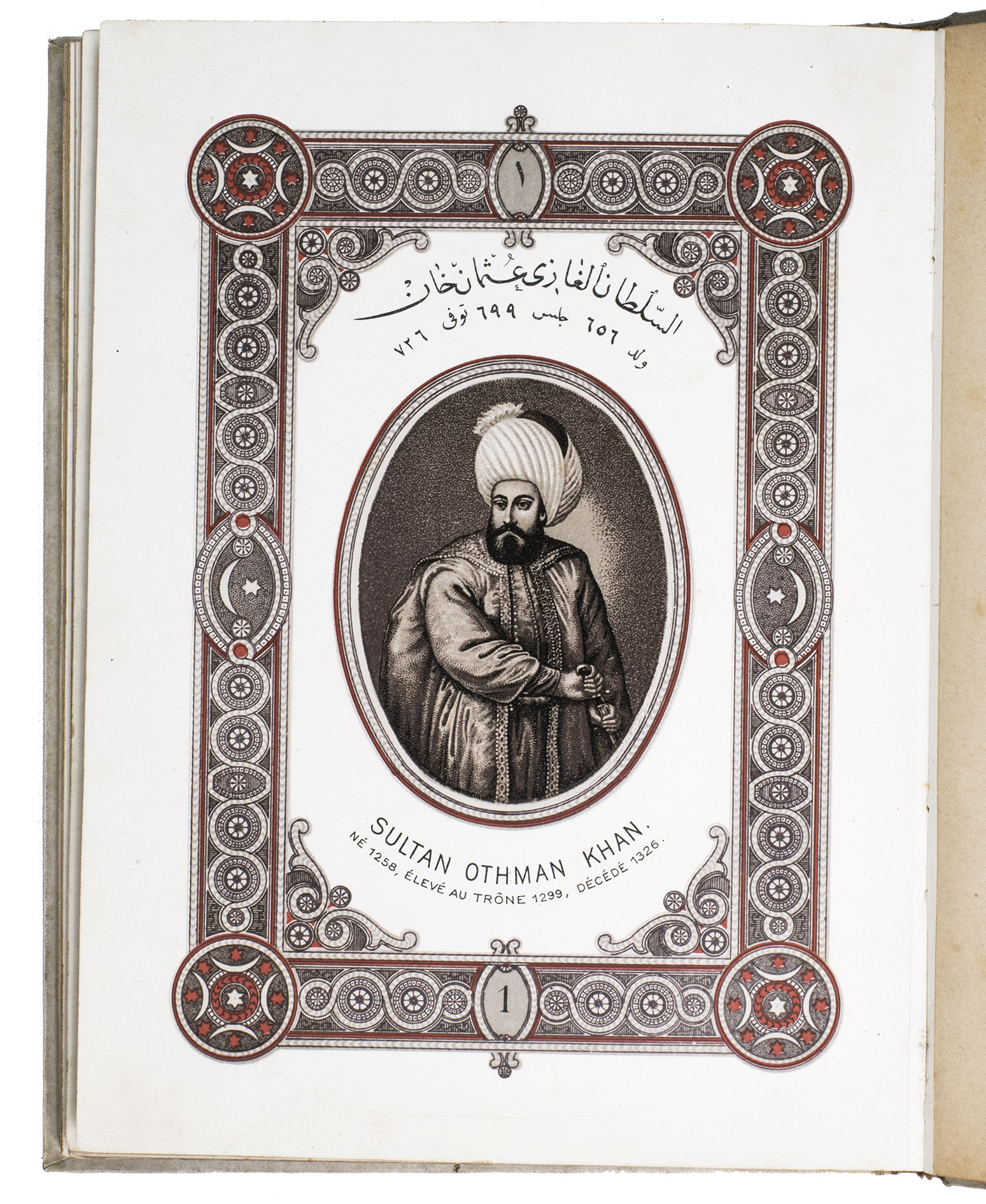 First edition of a series of portraits of all thirty-four Sultans that ruled the Ottoman Empire before the end of the 19th century. They are presented in chronological order from Osman I (r. ca. 1299-ca. 1324), the very first Sultan, to Abdul Hamid II (r. 1876-1909). Each portrait is surrounded by a beautiful geometric border, and accompanied by bibliographical information about the Sultan in Arabic/Ottoman Turkish(?) and French. The work is relatively scarce in libraries and on the market, and we have not found any other copies with the present binding.