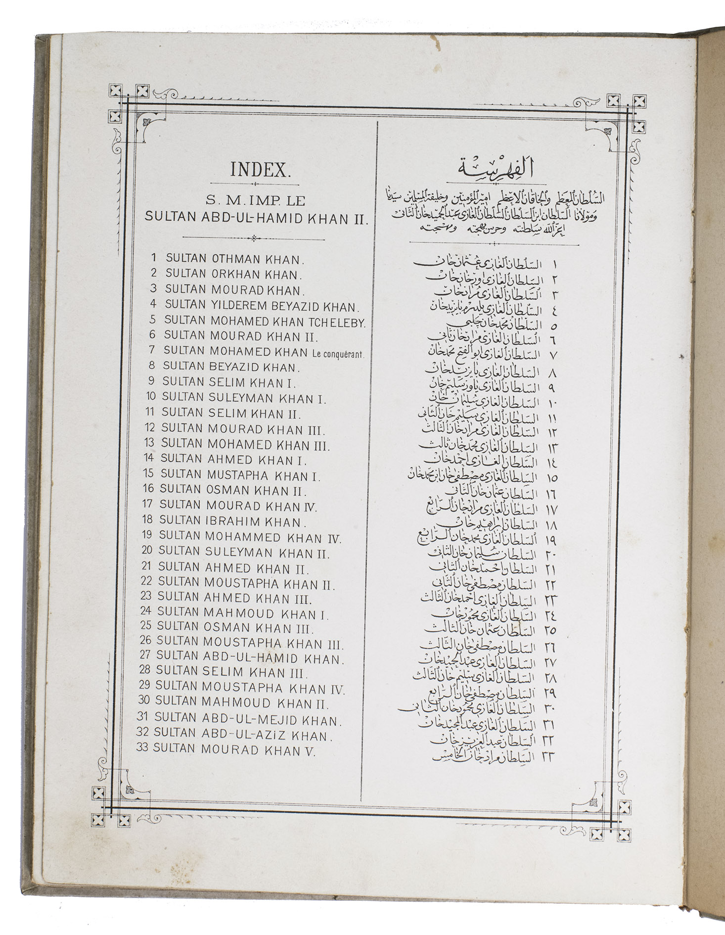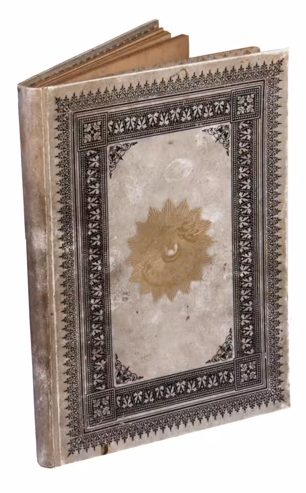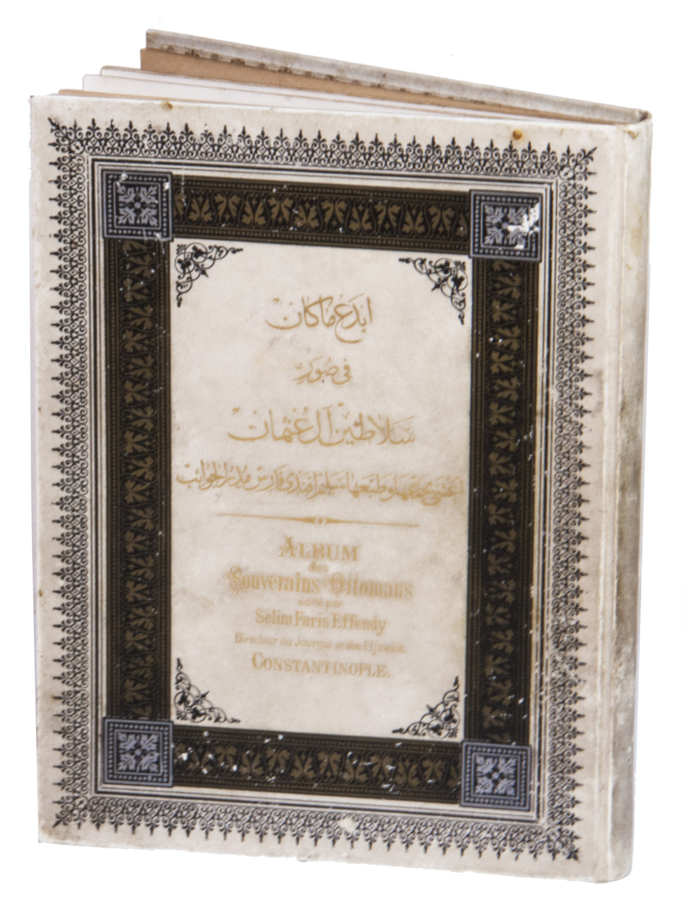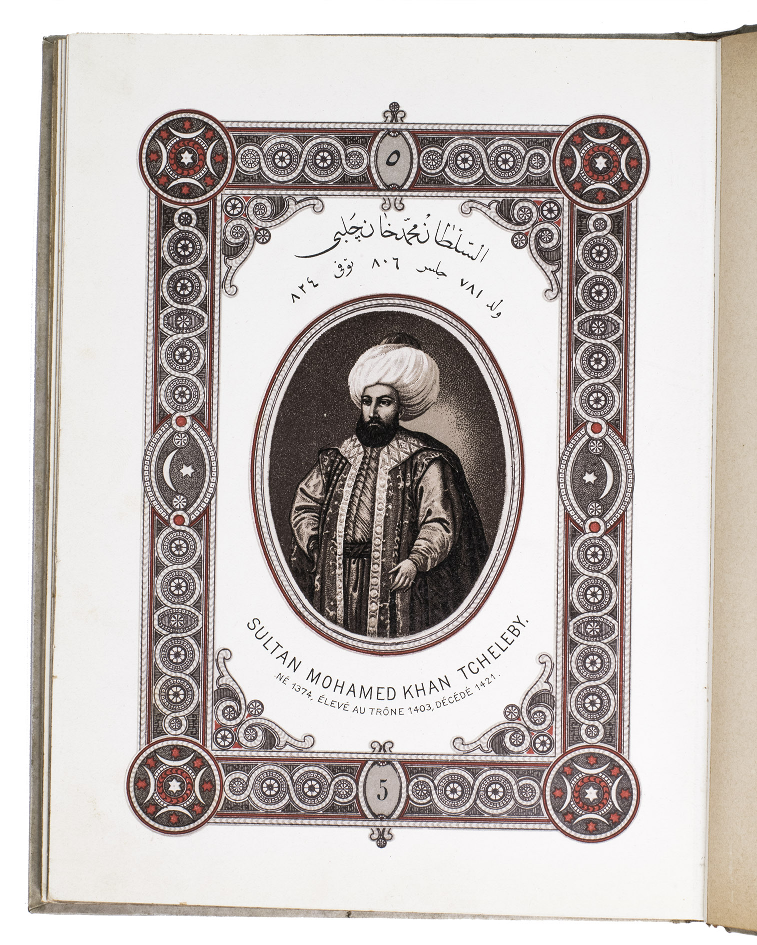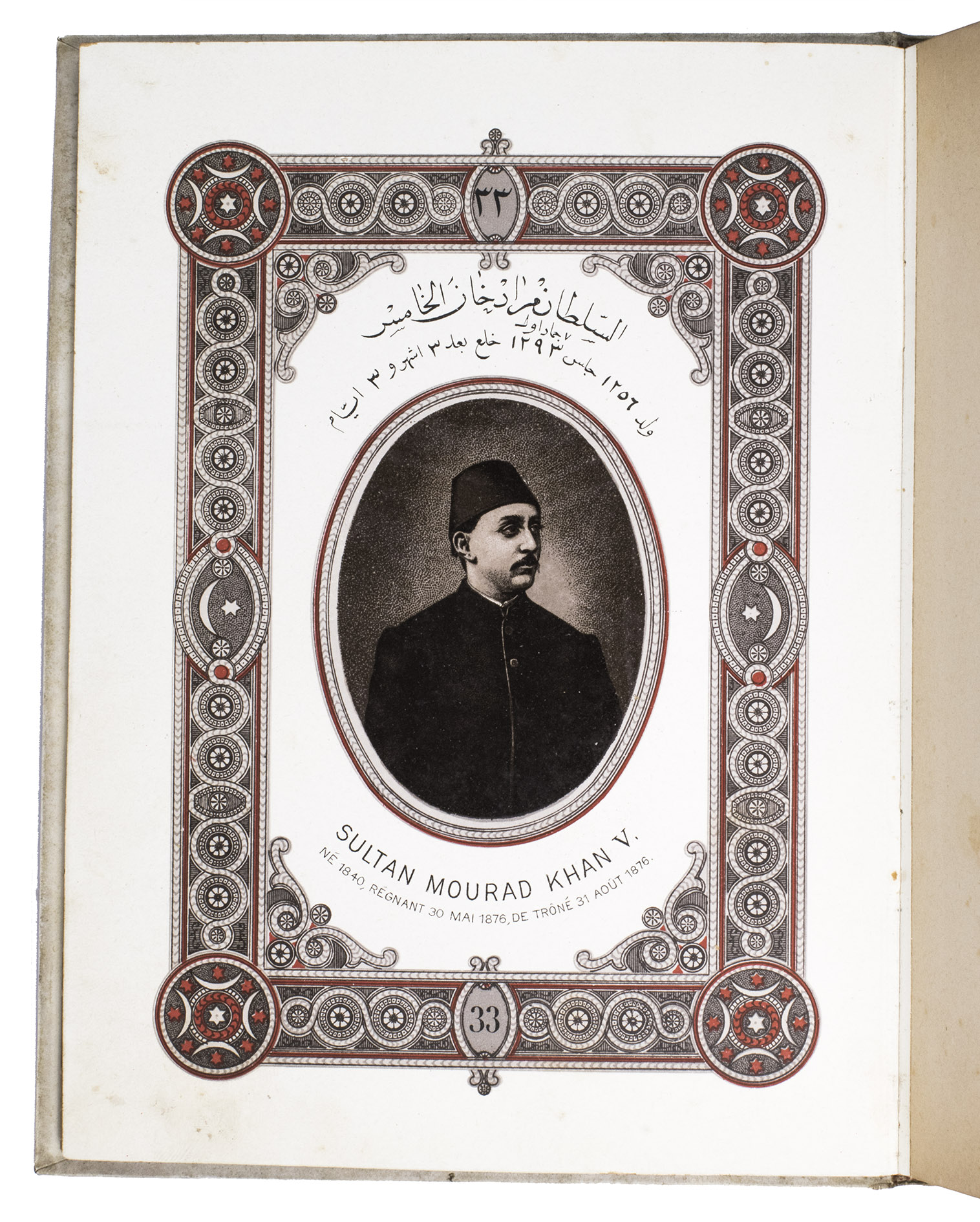 First edition of a series of portraits of all thirty-four Sultans that ruled the Ottoman Empire before the end of the 19th century. They are presented in chronological order from Osman I (r. ca. 1299-ca. 1324), the very first Sultan, to Abdul Hamid II (r. 1876-1909). Each portrait is surrounded by a beautiful geometric border, and accompanied by bibliographical information about the Sultan in Arabic/Ottoman Turkish(?) and French. The work is relatively scarce in libraries and on the market, and we have not found any other copies with the present binding.
