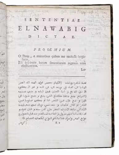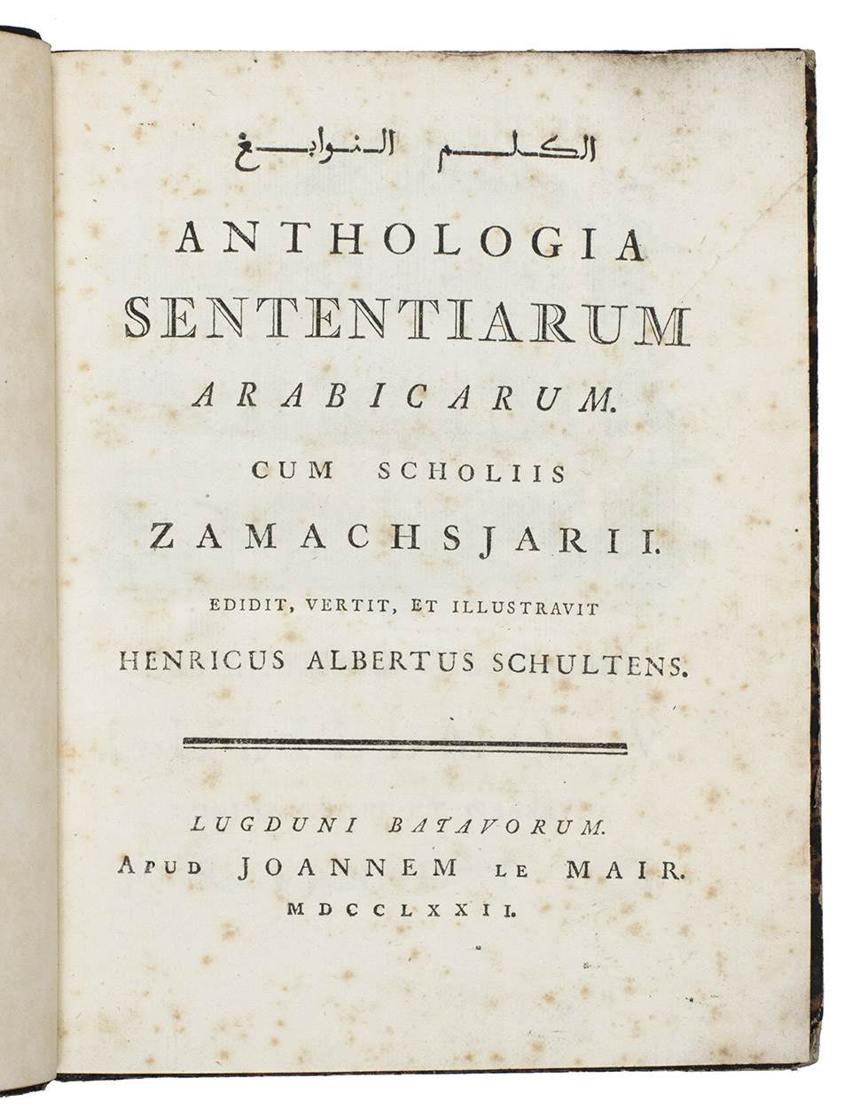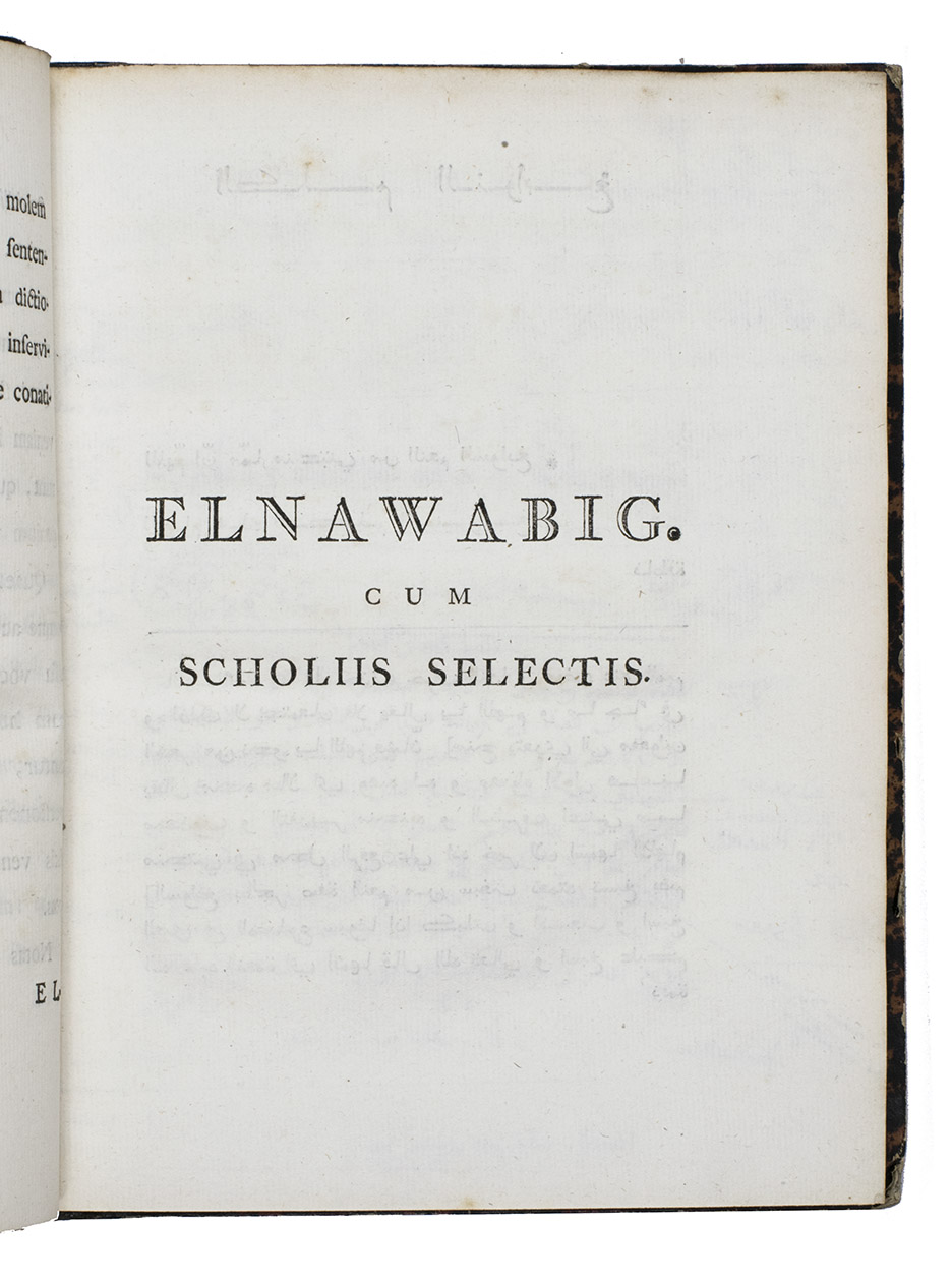This first edition of a famous and very rare work on the Arabic language combines a collection of Arabic sentences, quotations and proverbs in Arabic script with a Latin translation. It was originally compiled by the medieval Persian theologian, grammarian and lexicographer Abu al-Qasim Al-Zamakhshari (1075-1144). The presen edition was translated by the renowned professor of oriental languages Hendrik Albert Schultens (1749-1793) at the University of Leiden. The work emulates the reading practices of the Arab world and is being read from right to left, but the preliminaries are in Latin with quotations in Arabic. The extensive notes, often longer than the main text, are given in Arabic only below the main text with the Latin notes with quotations in Arabic at the end of the work.