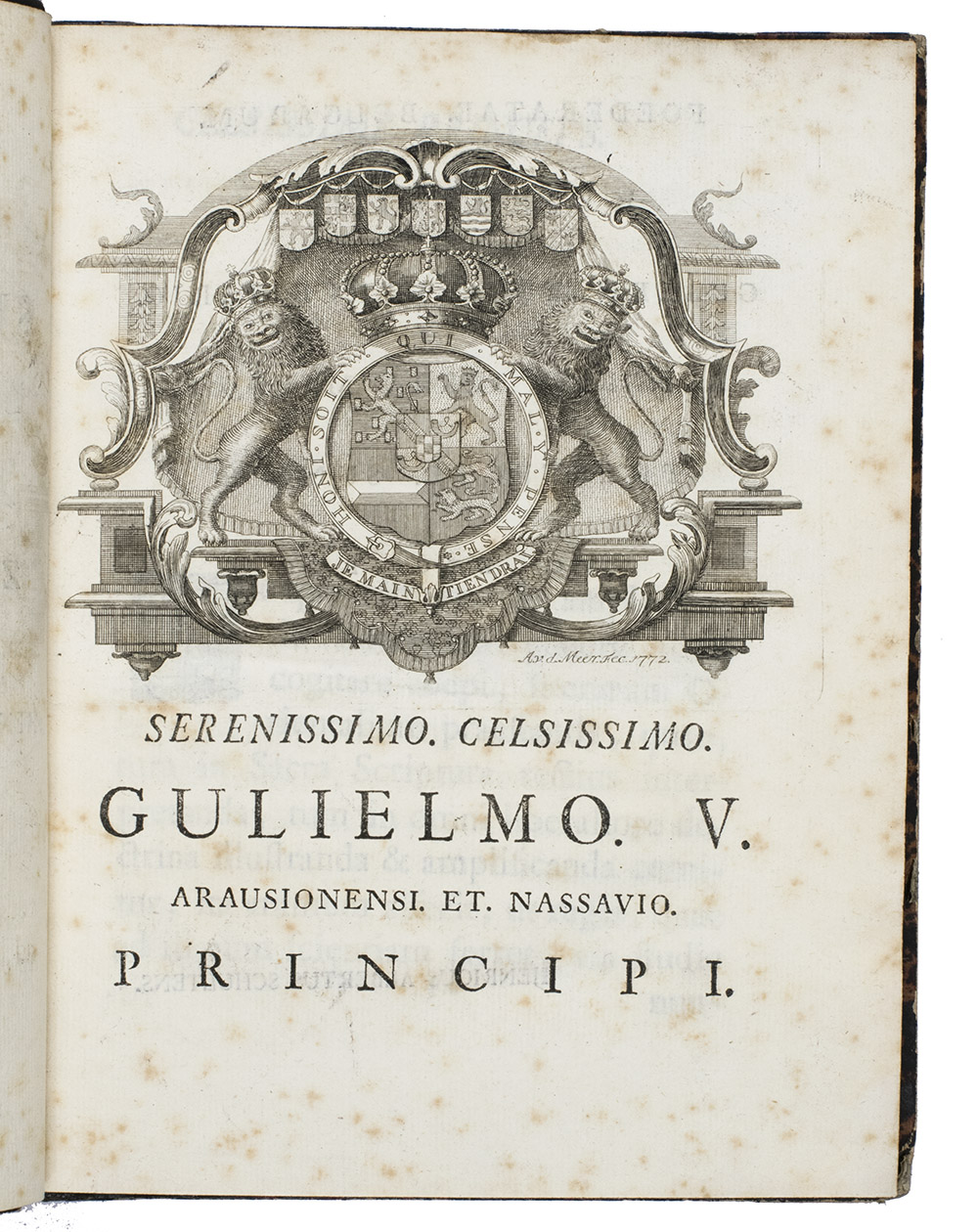 Leiden, Jean Le Mair (colophon: printed by Daniel van Damme), 1772. Small 4to. With the large engraved arms of Willem V, Prince of Orange, by A. v. d. Meer, above the dedication, and several dedicated woodcut initials. 19th century gold-tooled quarter calf. [20], 171, [1] pp.