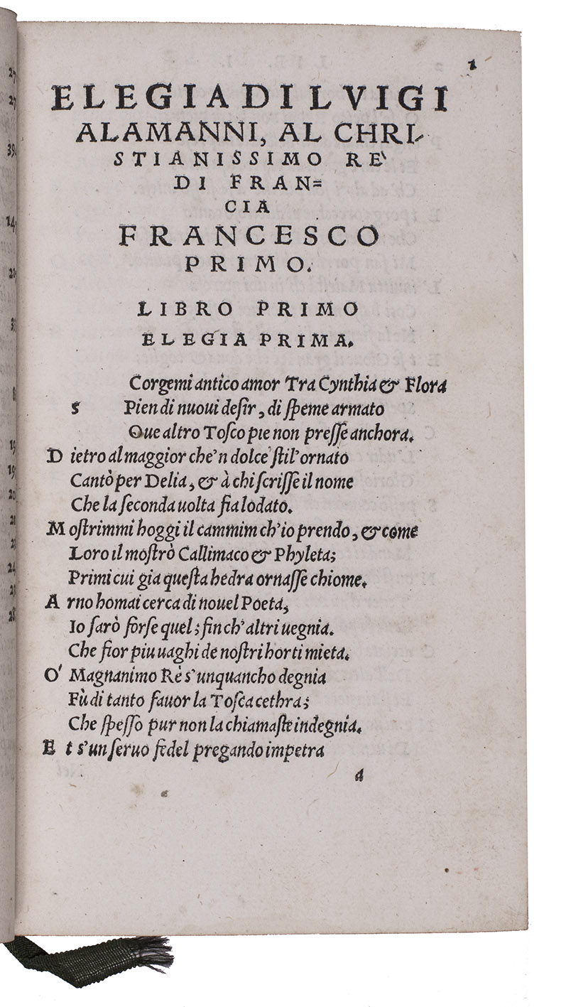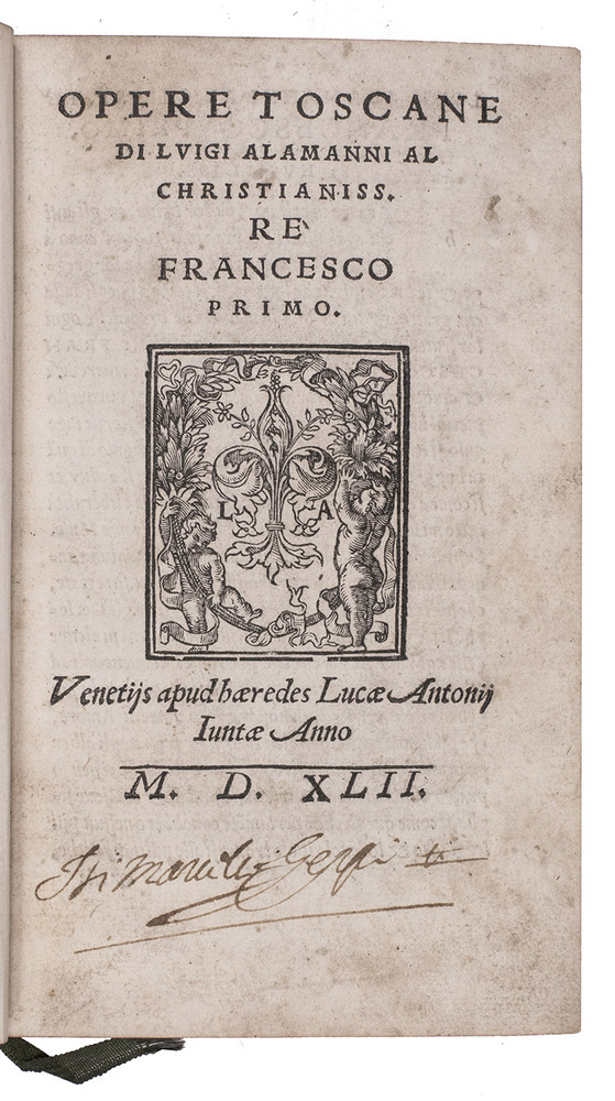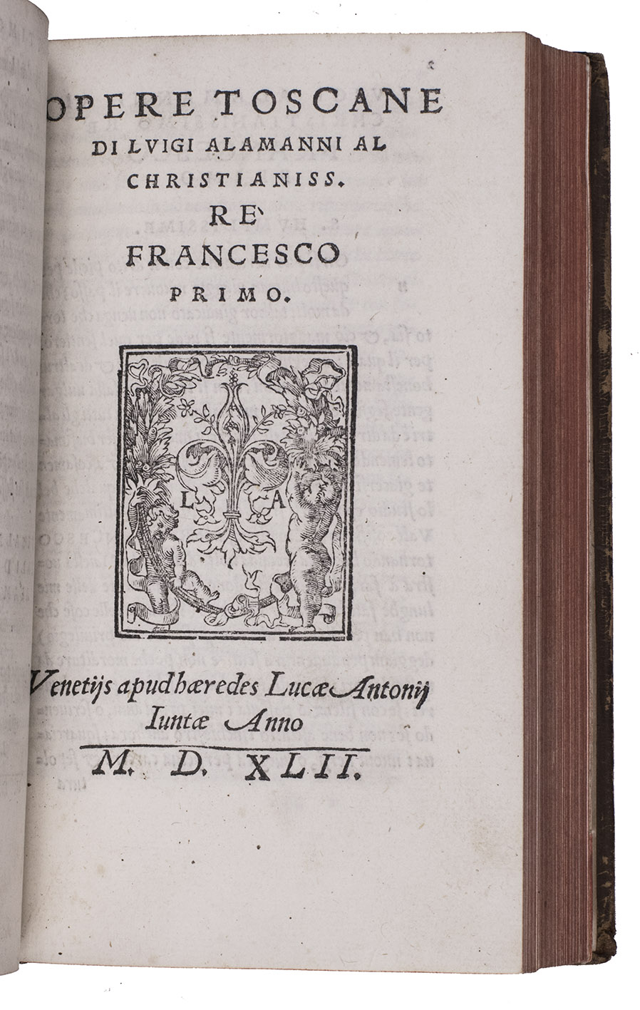 Third edition of frequently satirical poetry and plays written in (mostly blank) Italian verse by the Florentine statesman, poet and playwright Luigi Alamanni (1495-1556). He and his contemporary Giangiorgio Trissino pioneered the use of blank verse in Italian poetry. The French King François I (1494-1547), who promoted Renaissance Italian ideas and fashions in France, had been allied with the Medici in Florence, but when Giulio de' Medici (from 1523 Pope Clement VII) and François I fell out in 1521, Luigi Alamanni, whose family had long supported the Medici, took François's side and plotted against Giulio. As a result Luigi had to flee to France, living part of the time in Lyon and frequenting François's court in Paris. He returned to Florence when the Medici fell in 1527 but fled again when they regained power in 1530. As a result, he wrote most of his works in France.