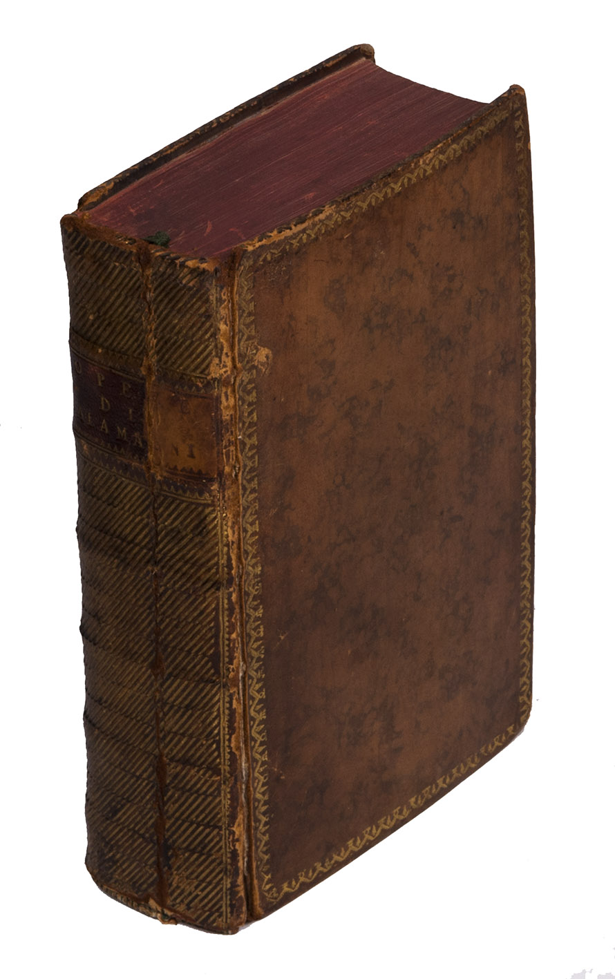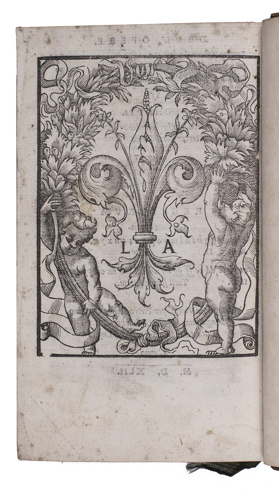 Venice, heirs of Lucantonio Giunta (colophons: printed by Peter Schoeffer the younger), 1542. 2 volumes bound as 1. 8vo. With 2 title-pages, each with the same woodcut Giunta device, and a full-page woodcut showing a larger version of the same device on the last printed page of vol. 2. Set in an Aldine-style italic. 18th-century gold-tooled mottled calf. [16], 431, [1 blank]; 295, [7] pp.