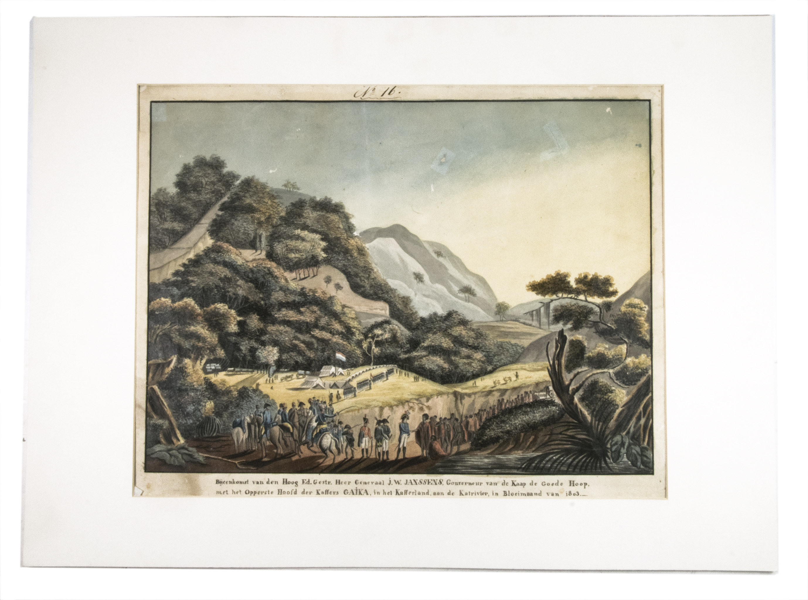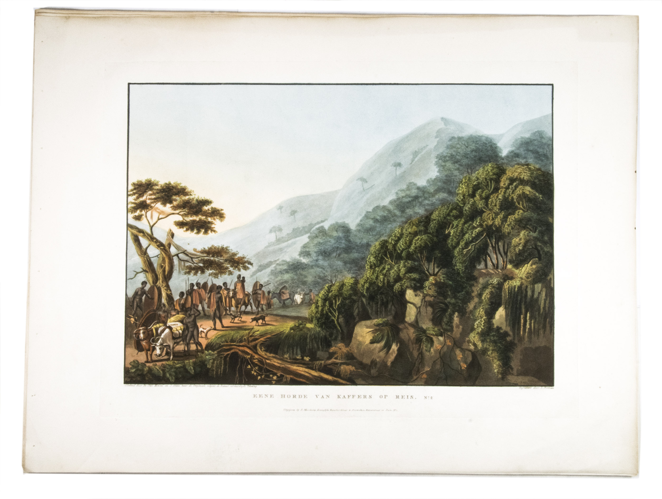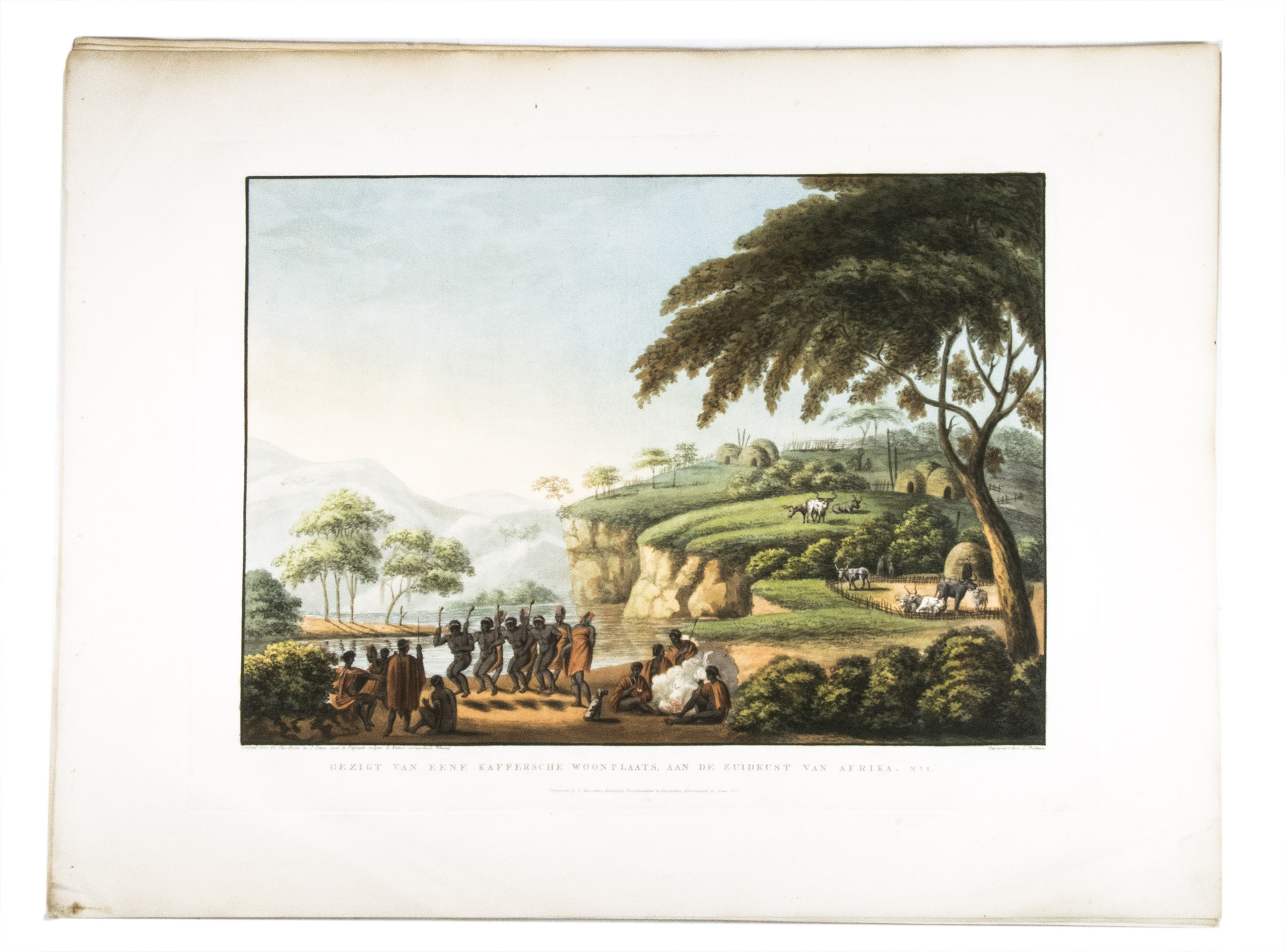 The four plates are accompanied by one explanatory text leaf. The first plate shows the Xhosa people dancing, some resting near a small fire, with their village, their cattle, and a lake in the background; the second shows the Xhosa's travelling through the mountains, together with their dogs and heavily packed cattle; the third shows a meeting between Jan Willem Janssens (1762-1838), governor of the Cape Colony, and Gaïka, chieftain of the Xhosa, near the Kat River in 1803; and the last gives a view of Fort Frederick and the Algoa Bay, with some people on its shores. All the plates are brightly coloured and remarkably fresh and lively, evoking the beauty of the African landscape and the culture of the Xhosa.