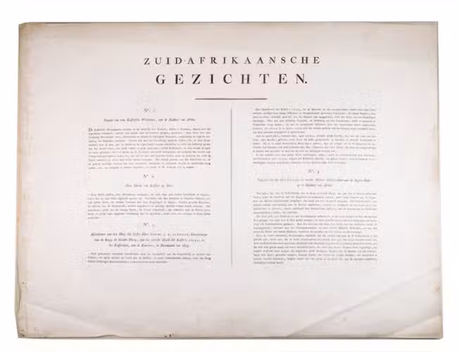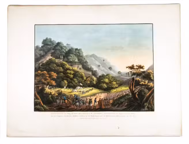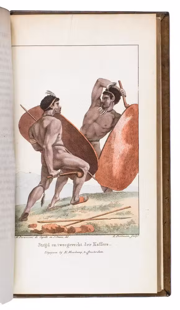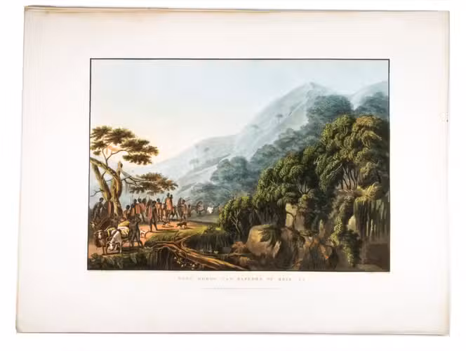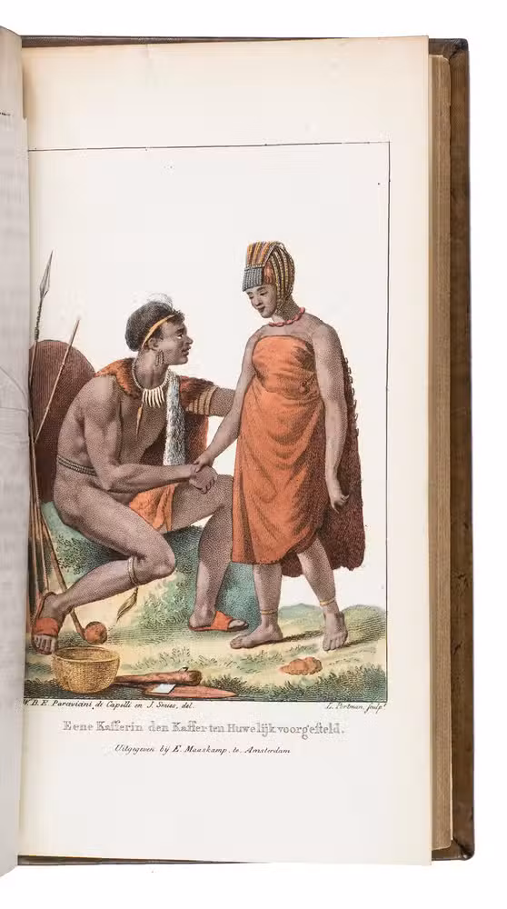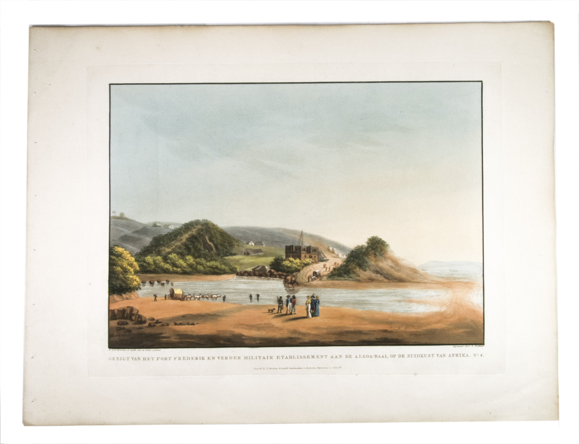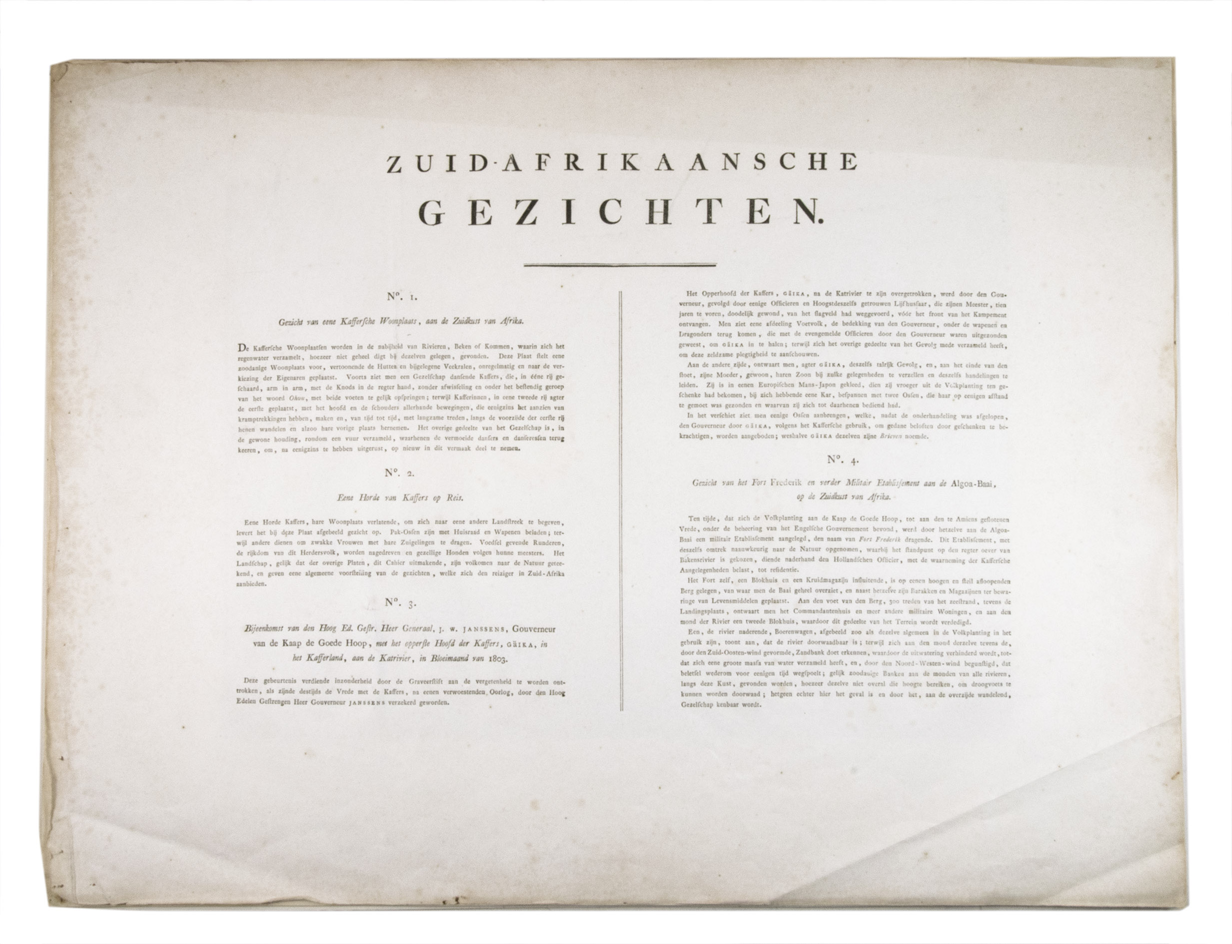 The four plates are accompanied by one explanatory text leaf. The first plate shows the Xhosa people dancing, some resting near a small fire, with their village, their cattle, and a lake in the background; the second shows the Xhosa's travelling through the mountains, together with their dogs and heavily packed cattle; the third shows a meeting between Jan Willem Janssens (1762-1838), governor of the Cape Colony, and Gaïka, chieftain of the Xhosa, near the Kat River in 1803; and the last gives a view of Fort Frederick and the Algoa Bay, with some people on its shores. All the plates are brightly coloured and remarkably fresh and lively, evoking the beauty of the African landscape and the culture of the Xhosa.