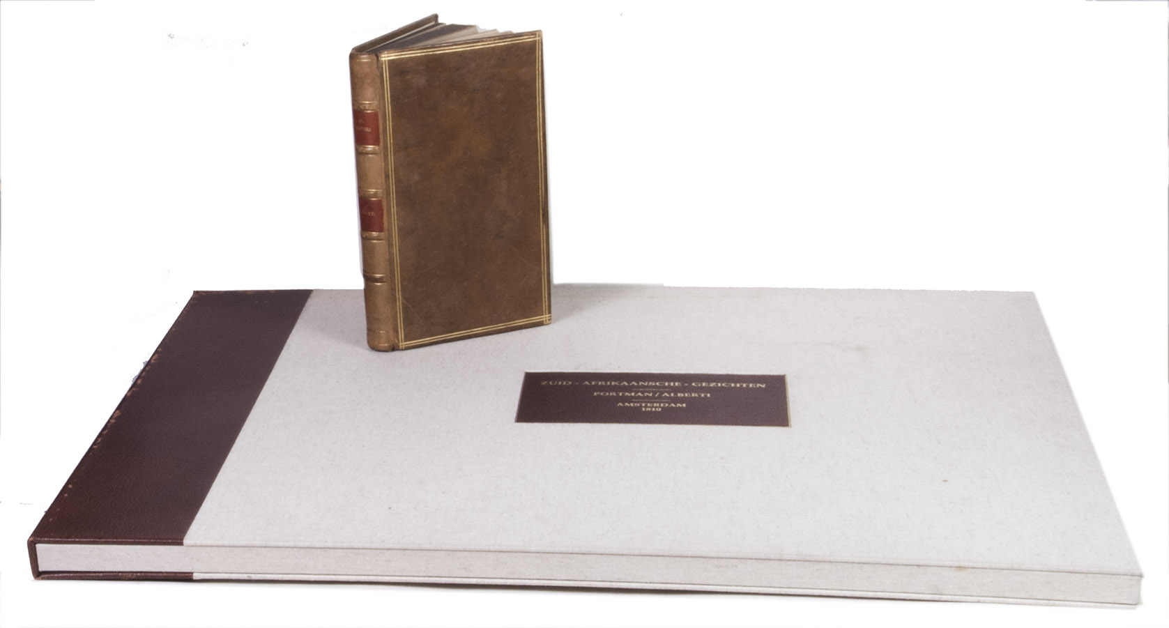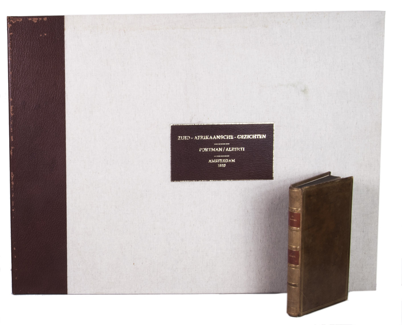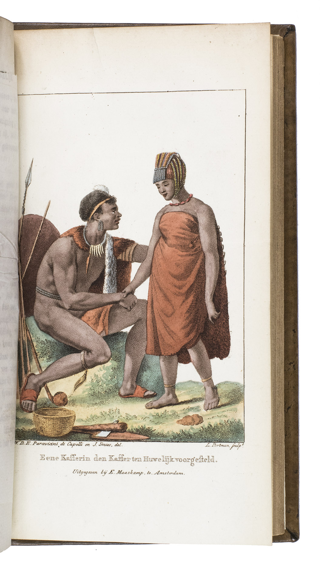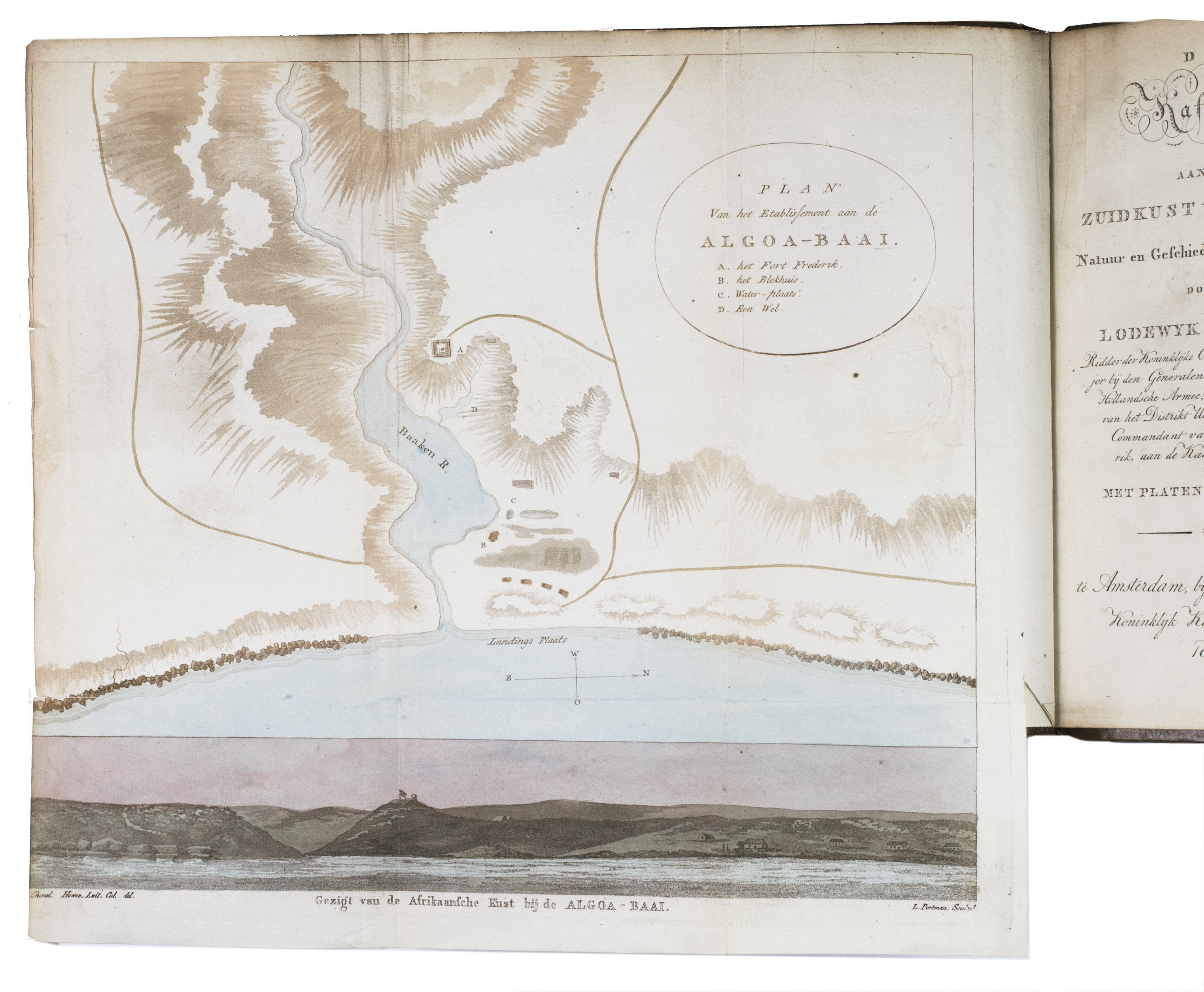 Amsterdam, Evert Maaskamp, 1810. 8vo. With engraved title-page, aquatint folding plan, with coastal view, of Algoa Bay, and 2 stipple-engraved plates, all but the title-page coloured by a contemporary hand. Contemporary gold-tooled calf; rebacked, with new endpapers.The plates are housed in a later box of brown quarter calf, grey cloth sides, and a brown calf title label on the front, lettered in gold. [1] l. text + 4 plates and 1 watercolour; [8], VIII, [4], 260, [1], [1 blank] pp.