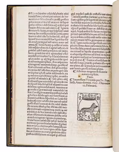 Rare early edition (one of perhaps four or five early editions with the main text set in a roman type) of two works written ca. 1300 by an unidentified follower of Albertus Magnus concerning the extraordinary properties (magical, astrological, medicinal, etc.) of 16 plants, 45 minerals or gems and 18 animals (including many birds), and concerning the "wonders of the world". The first includes means to become invisible, feel no pain, arouse love, interpret dreams and make prophesies. The second includes mental manipulation of matter, cures for diseases, magic made with fire or light, means of breaking charms, and seeing the future in dreams. The woodcut is remarkable for its depiction of both numerous books with bosses, clasps, etc., and numerous accoutrements, such as a wedge-shaped book stand, a copy stand in the form of a four-sided pyramid on a pedestal, pens, ink wells and penknives. Senna used it again in 1504 on the title-page of John Pecham's Perspectiva communis. Though this edition, like many others, attributes the works to Albertus Magnus (ca. 1194?-1280) on the title-page and at the end of the texts, the attribution is believed to be spurious. An attribution to his follower Henry of Saxony (d. ca. 1378) has also been challenged.