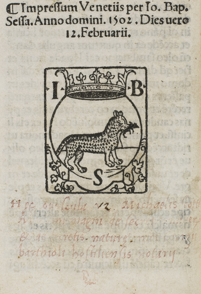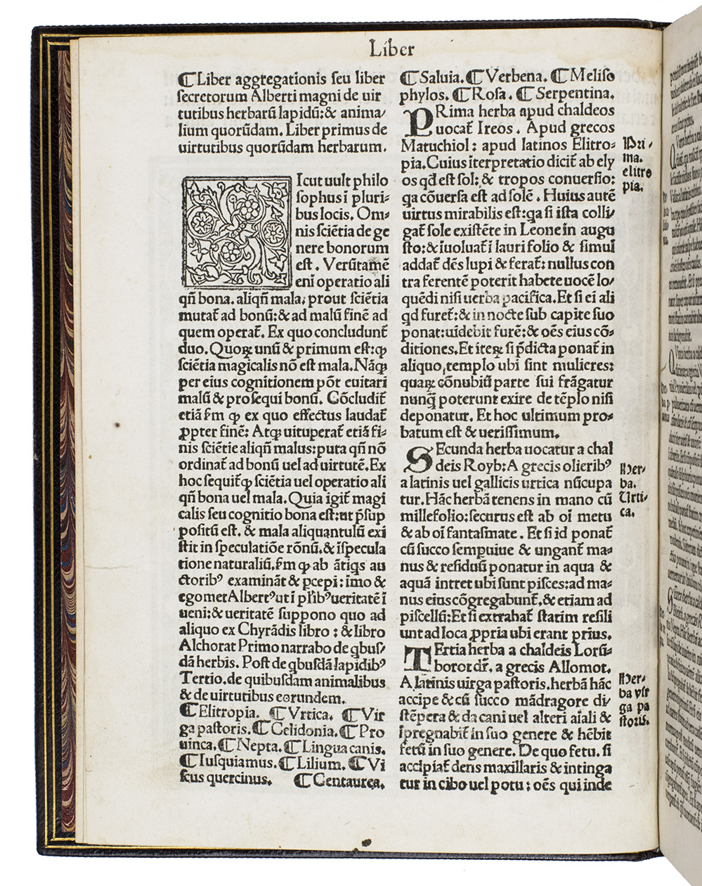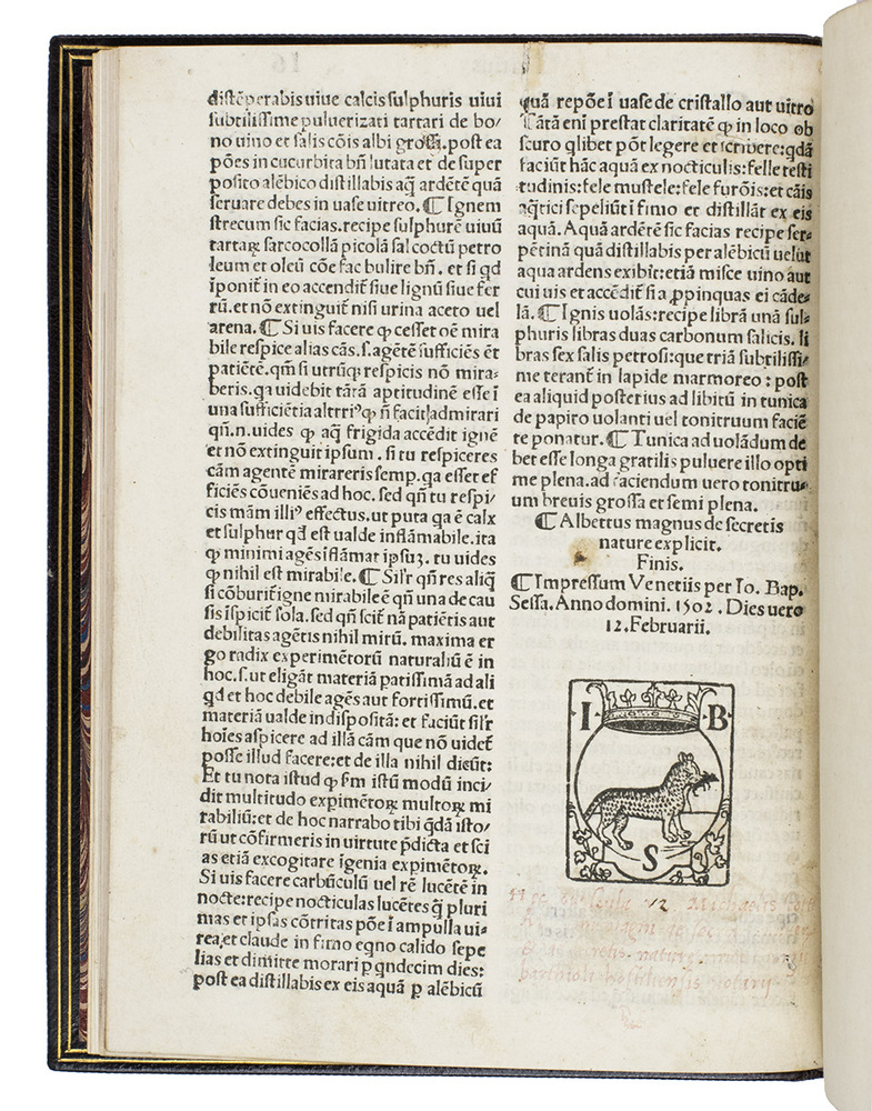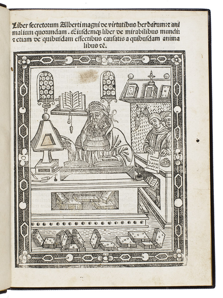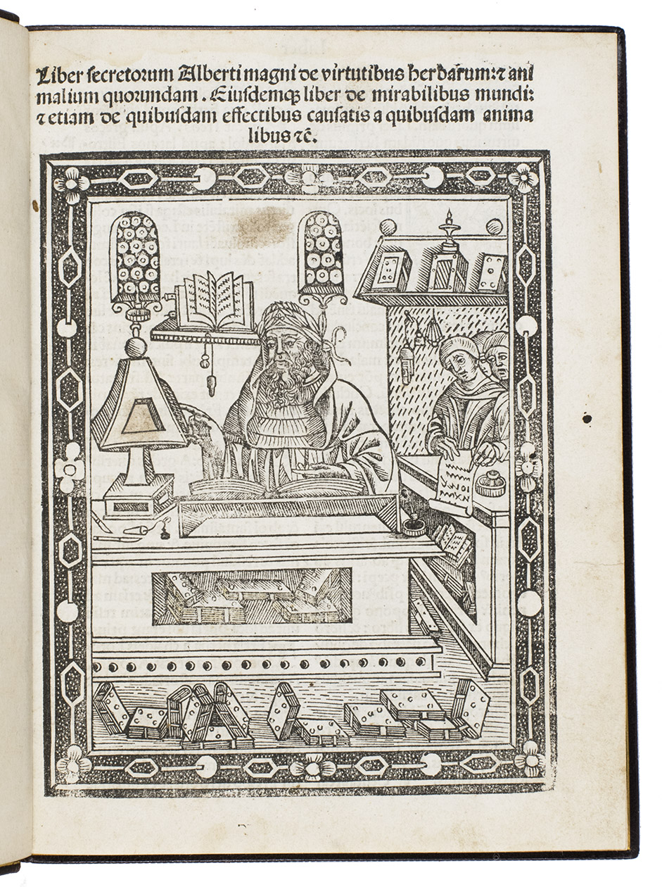 Rare early edition (one of perhaps four or five early editions with the main text set in a roman type) of two works written ca. 1300 by an unidentified follower of Albertus Magnus concerning the extraordinary properties (magical, astrological, medicinal, etc.) of 16 plants, 45 minerals or gems and 18 animals (including many birds), and concerning the "wonders of the world". The first includes means to become invisible, feel no pain, arouse love, interpret dreams and make prophesies. The second includes mental manipulation of matter, cures for diseases, magic made with fire or light, means of breaking charms, and seeing the future in dreams. The woodcut is remarkable for its depiction of both numerous books with bosses, clasps, etc., and numerous accoutrements, such as a wedge-shaped book stand, a copy stand in the form of a four-sided pyramid on a pedestal, pens, ink wells and penknives. Senna used it again in 1504 on the title-page of John Pecham's Perspectiva communis. Though this edition, like many others, attributes the works to Albertus Magnus (ca. 1194?-1280) on the title-page and at the end of the texts, the attribution is believed to be spurious. An attribution to his follower Henry of Saxony (d. ca. 1378) has also been challenged.