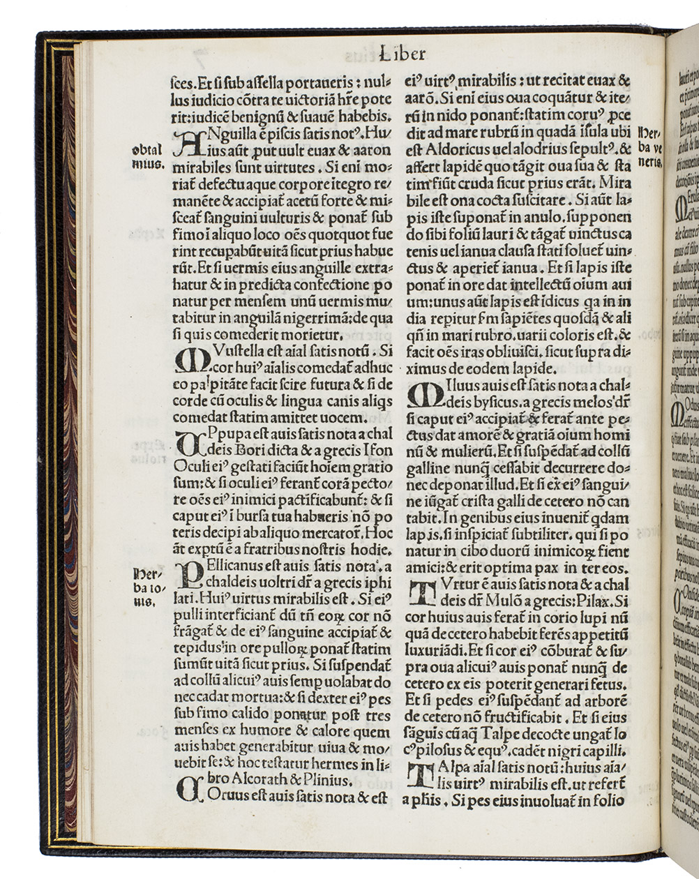 With a faded inscription in red ink below the colophon, in a 16th-century italic hand. With the engraved armorial bookplate of James, Earl of Southesk, on the front pastedown. With a short worm trail at the head of the last 2 leaves, and a small marginal chip (repaired) and tear, neither approaching the text, but otherwise in very good condition. The binding shows some small minor blemishes and its spine is slightly faded, but it is otherwise fine. A rare early edition of a popular book of botanical, mineral and zoological wonders. Earl of Southesk sale, Sotheby, 18 October 1954, 255 (this copy); EDIT16 CNCE 29555 (2 copies); Honeyman 51 (this copy); ICCU, LO1E 43699 (1 of the 2 EDIT16 copies); KVK & WorldCat (5 copies); www.minrec.org/libdetail.asp?id=20, 64; USTC (same 2 copies as EDIT16); cf. Adams A539 (ca. 1508 ed.); Brüning, Bibl. alchemistischen lit., supp. 0054a (ca. 1500 ed.); Duveen, p. 8 (ca. 1490 ed.); Hunt 4 (ca. 1485 ed.); Sinkankas 56 (1669 ed.); Thorndike II, pp. 720-750 at p. 721 (1509 Sessa ed.); Wellcome 118 (ca. 1500 ed.).