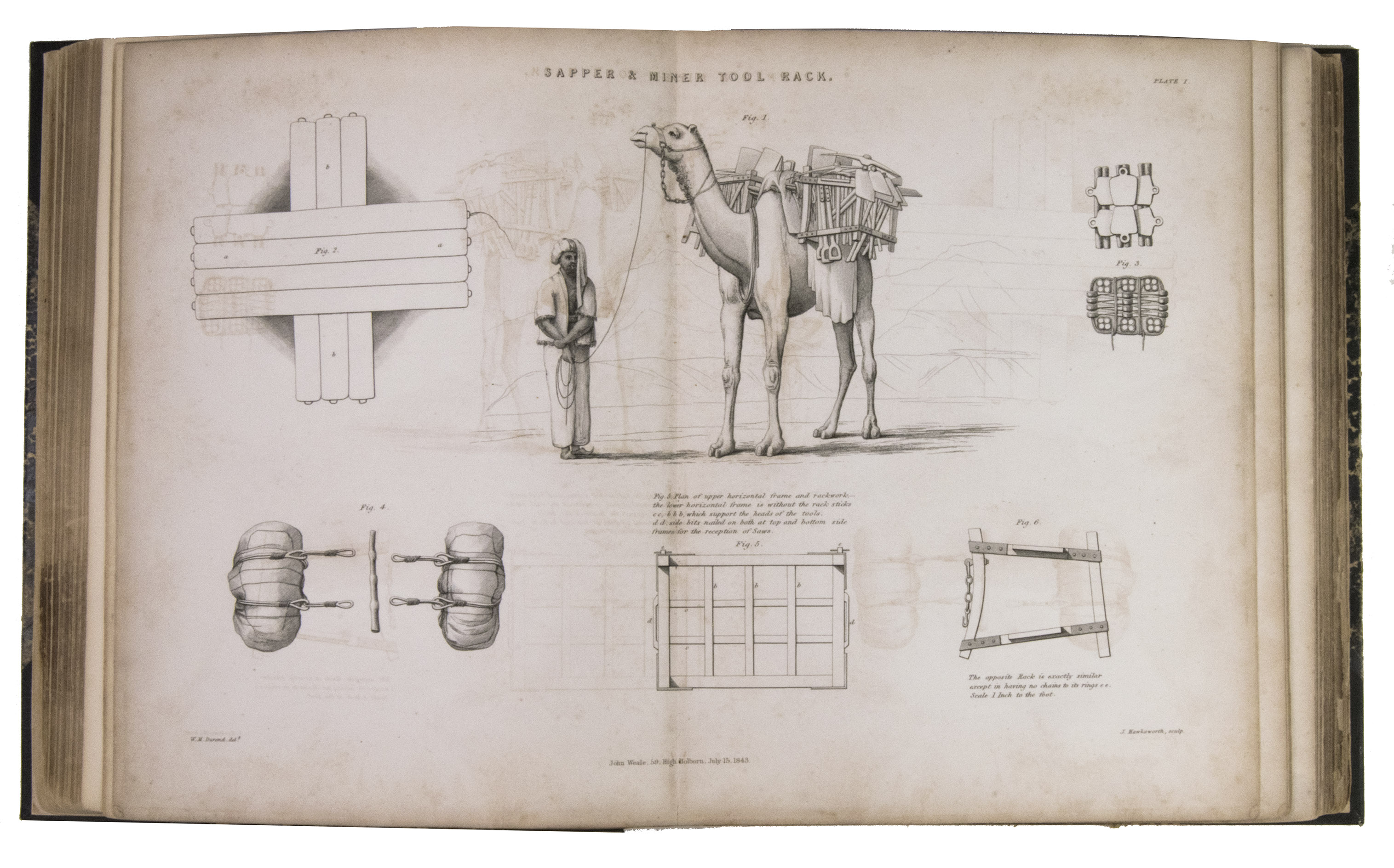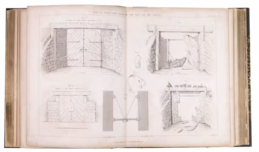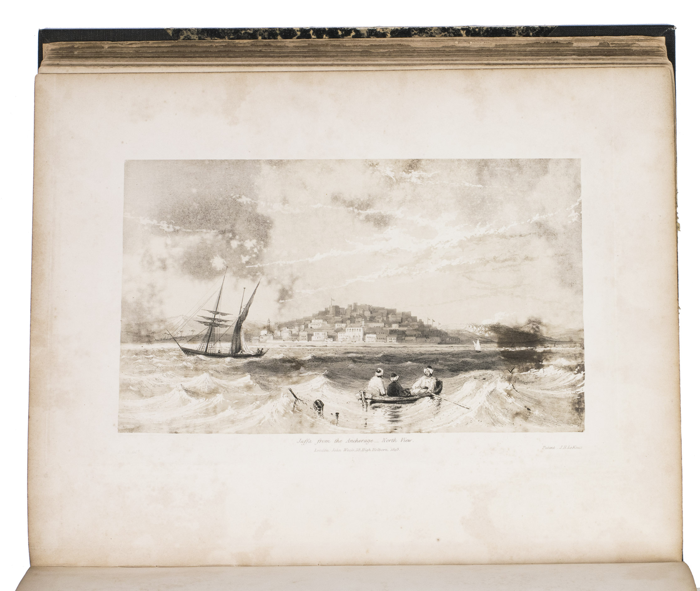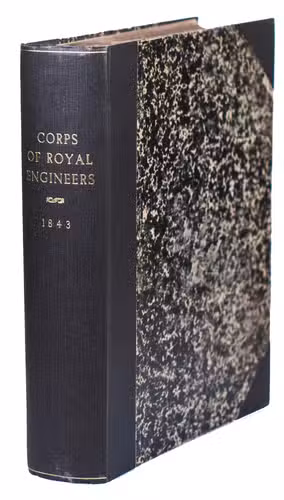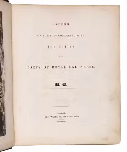 London, John Weale, 1843. Large 4to (23.5 x 28 cm). With a general engraved frontispiece, 60 plates (52 numbered plates plus plate XLIV* and 7 unnumbered plates; comprising of 1 folding double page plate, 48 double page plates, and 11 full-page plates). Plates VI-IX belong to the "Notes on Acre" article. Part of: Papers on subjects connected with the duties of the Corps of Royal Engineers. Contemporary half black cloth. XI, [1], 220 pp. [Notes on Acre on pp. 19-62].