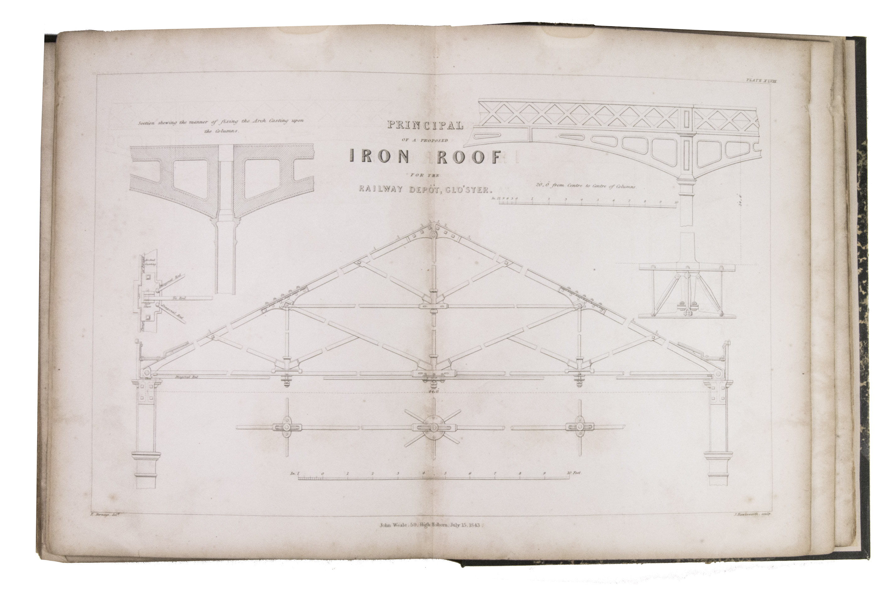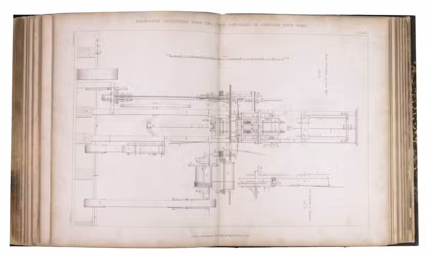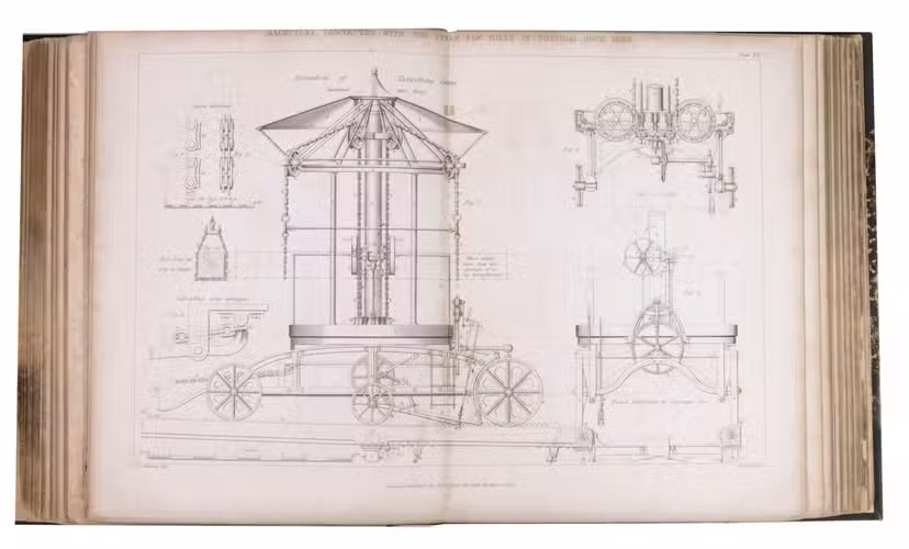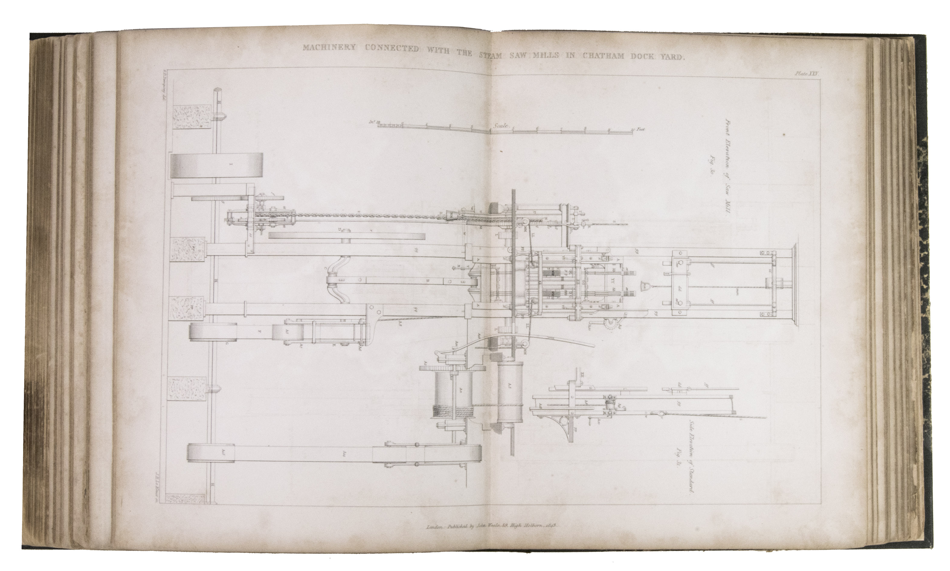 London, John Weale, 1843. Large 4to (23.5 x 28 cm). With a general engraved frontispiece, 60 plates (52 numbered plates plus plate XLIV* and 7 unnumbered plates; comprising of 1 folding double page plate, 48 double page plates, and 11 full-page plates). Plates VI-IX belong to the "Notes on Acre" article. Part of: Papers on subjects connected with the duties of the Corps of Royal Engineers. Contemporary half black cloth. XI, [1], 220 pp. [Notes on Acre on pp. 19-62].
