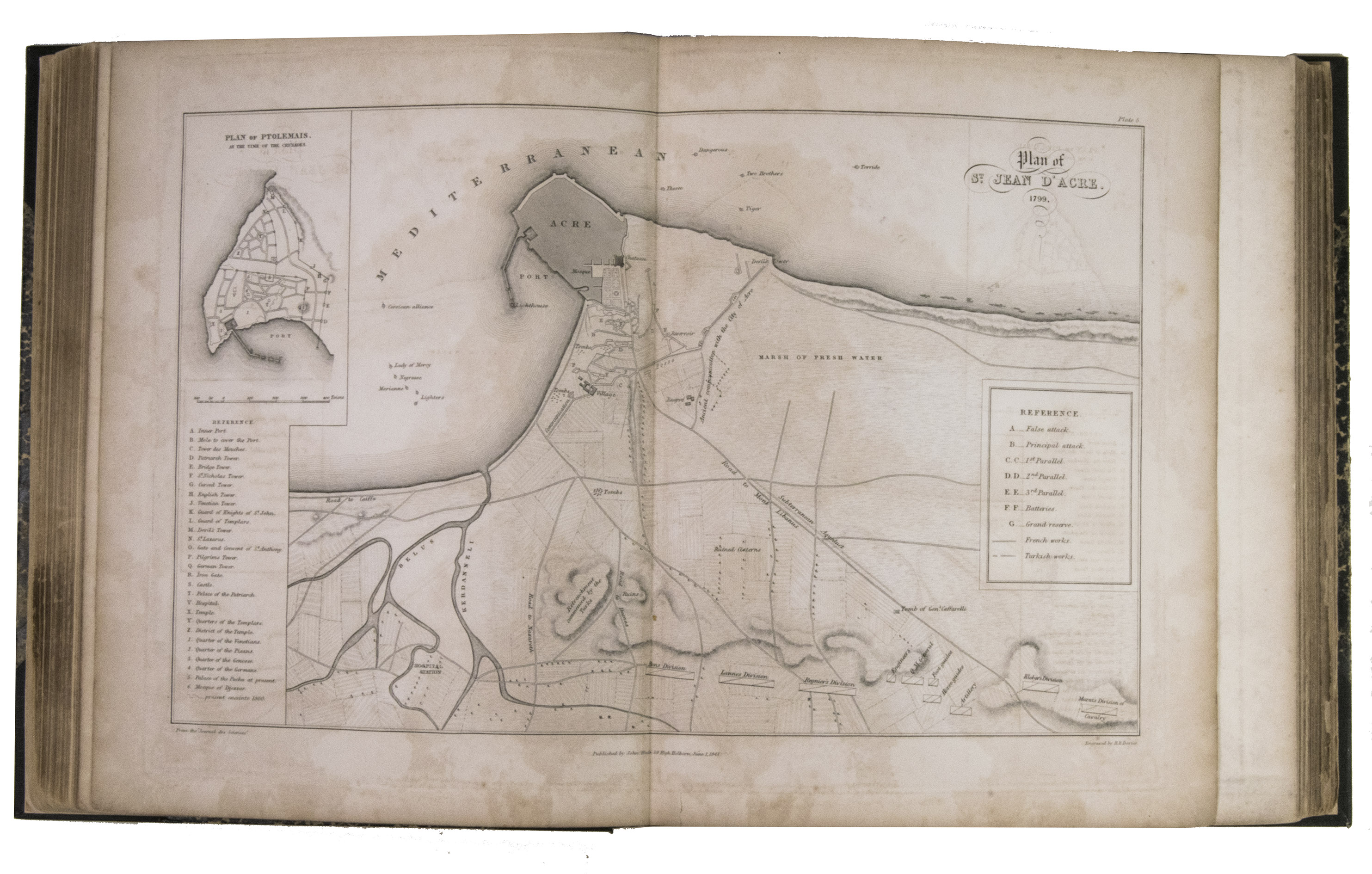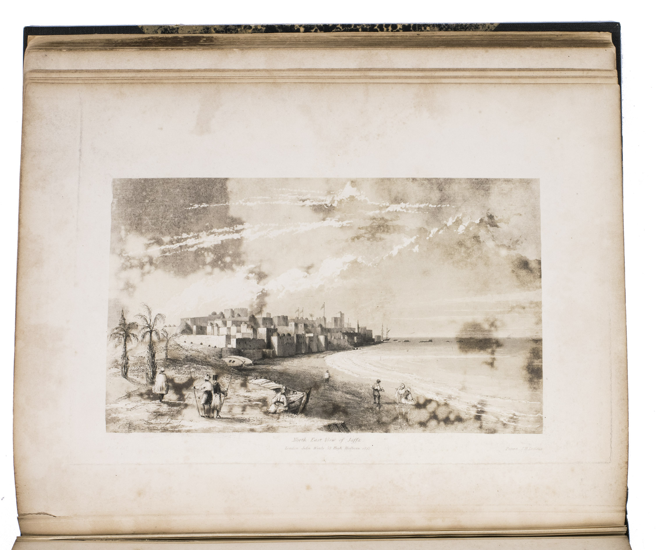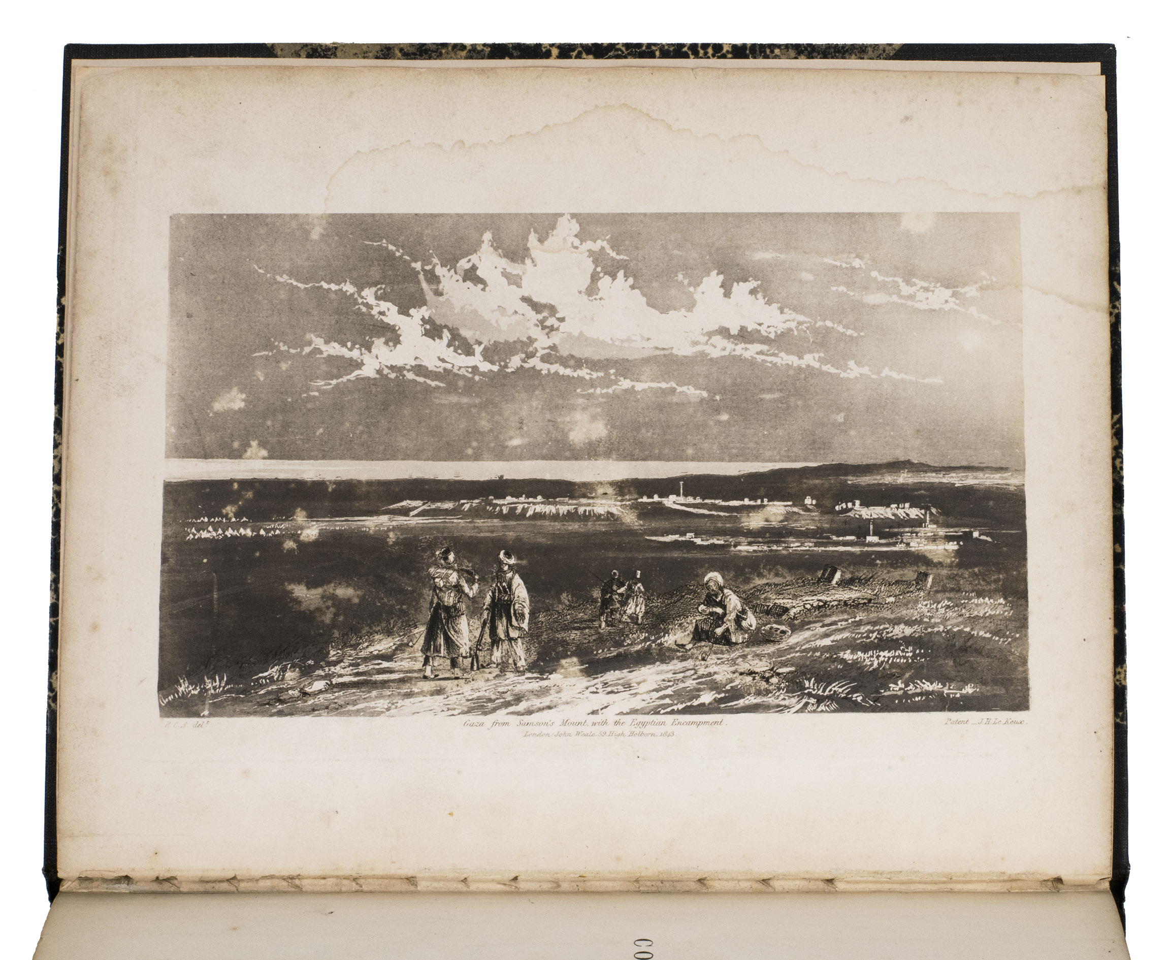 A detailed and illustrated record of British and French attacks on Acre (Akko), Jaffa, and Gaza from 1799 to 1840. Written by Ralph Carr Alderson (d. 1849), a lieutenant-colonel in the Corps of Royal Engineers who had recently visited Ottoman Syria and Palestine and personally sketched the scenes illustrated in plates of Gaza, Jaffa, Haifa, and Acre (Akko). His plates are quite fine, with "Gaza from Samson's Mount with the Egyptian Encampment" used as the frontispiece for the entire volume (the full book itself covering a variety of international and domestic projects of the Corps of Royal Engineers, of which Alderson's chapter is of the greatest importance).