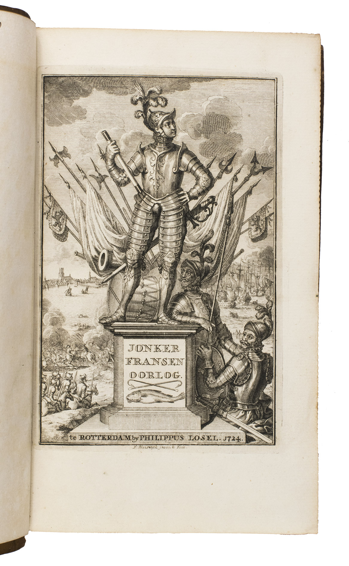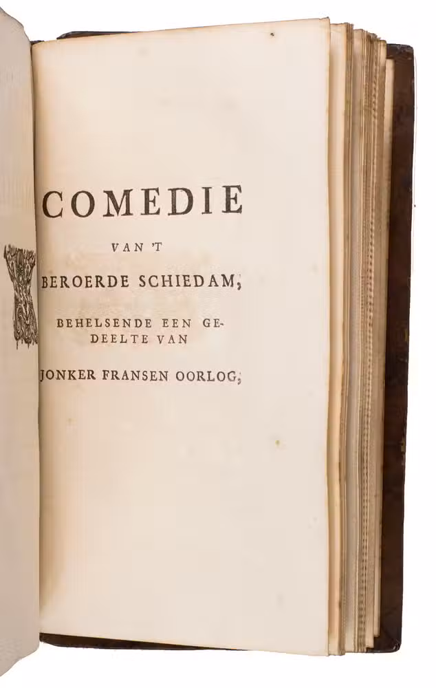 Large paper copy of the first edition of the history of the "Jonker Fransenoorlog", in a finely gold-tooled presentation binding by the so-called Crescent Moon Bindery (ca.1717-1729?). The war took place in and around Rotterdam between November 1488 and August 1490 and formed the final part of the "Hoeksche en Kabbeljauwse twisten" ("Hook and Cod Wars" (1350-1490)). During this time, Rotterdam was governed by the leader of the conservative "Hooks", the nobleman Frans van Brederode (Jonker Frans, 1465-1490), member of one of the most influential families in Holland. Under his command, they fought against the provincial administration of Stadholder Jan III van Egmont (1438-1516) dominated by the "Cods", who were closer to the Burgundian ruling elite. The work details the fight of the Hooks against the surrounding cities, such as Gouda, Hillegersberg, Schoonhoven, and Delft.