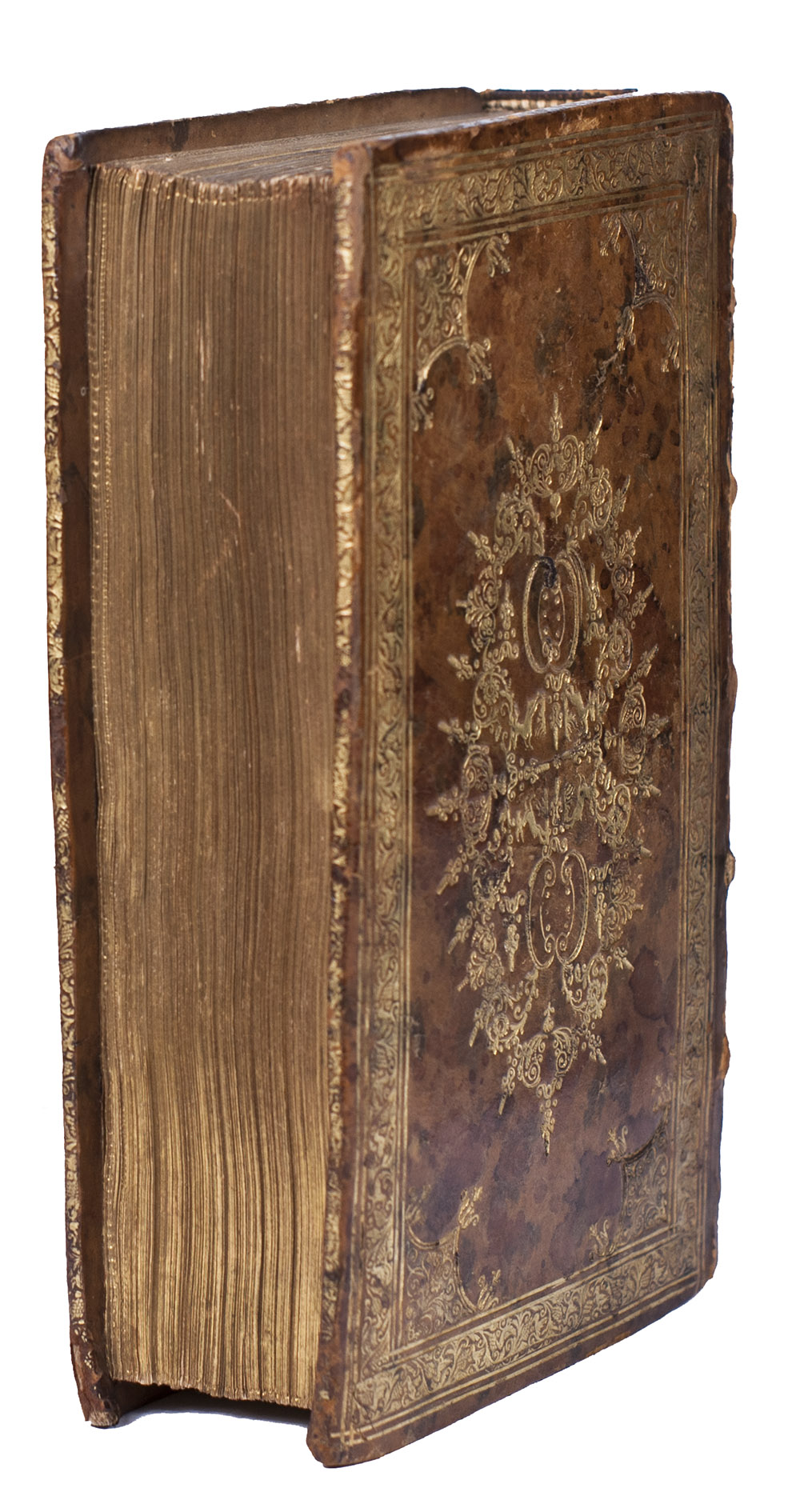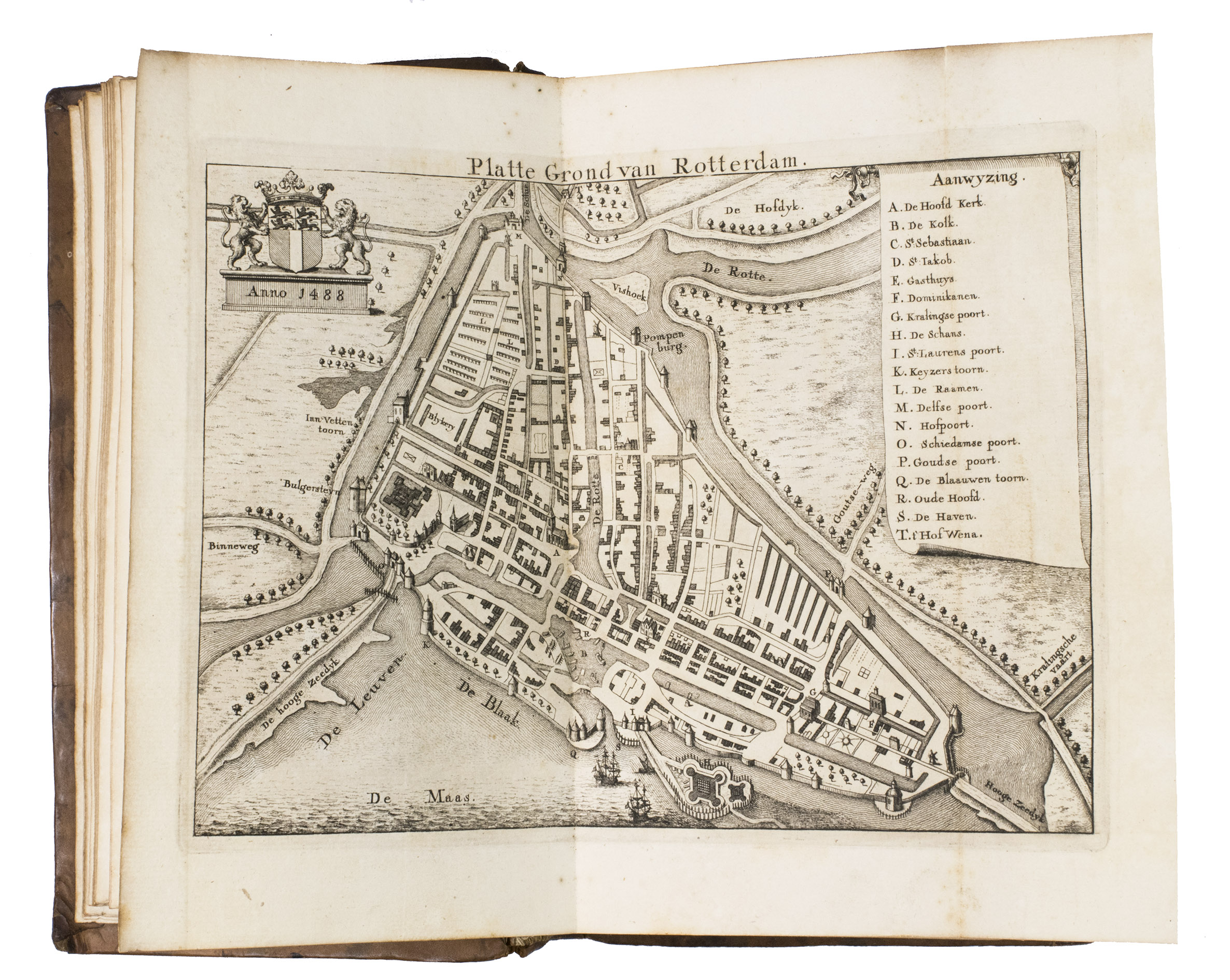 Rotterdam, Philippus Losel, 1724. Large 8vo (ca. 20 x 11.5 cm). With a frontispiece (depicting Jonker Frans standing in armour on a pedestal) engraved by François van Bleyswijck, a woodcut vignette on the title page, a folding engraved plan of Rotterdam in 1488 (ca. 16 x 22 cm), and a few woodcut tail pieces. Contemporary richly gold-tooled mottled calf, sewn on 4 supports with the corresponding raised bands on the spine, a brown morocco title label on the spine, lettered in gold, a centrepiece and cornerpieces on both boards composed of several stamps including four running stags (Storm van Leeuwen, IIA, p. 450, stamps I, 1, 5-6), surrounded by an ornamental border with birds along the edges between double rules, gilt and gauffered edges. [36], 387 pp.
