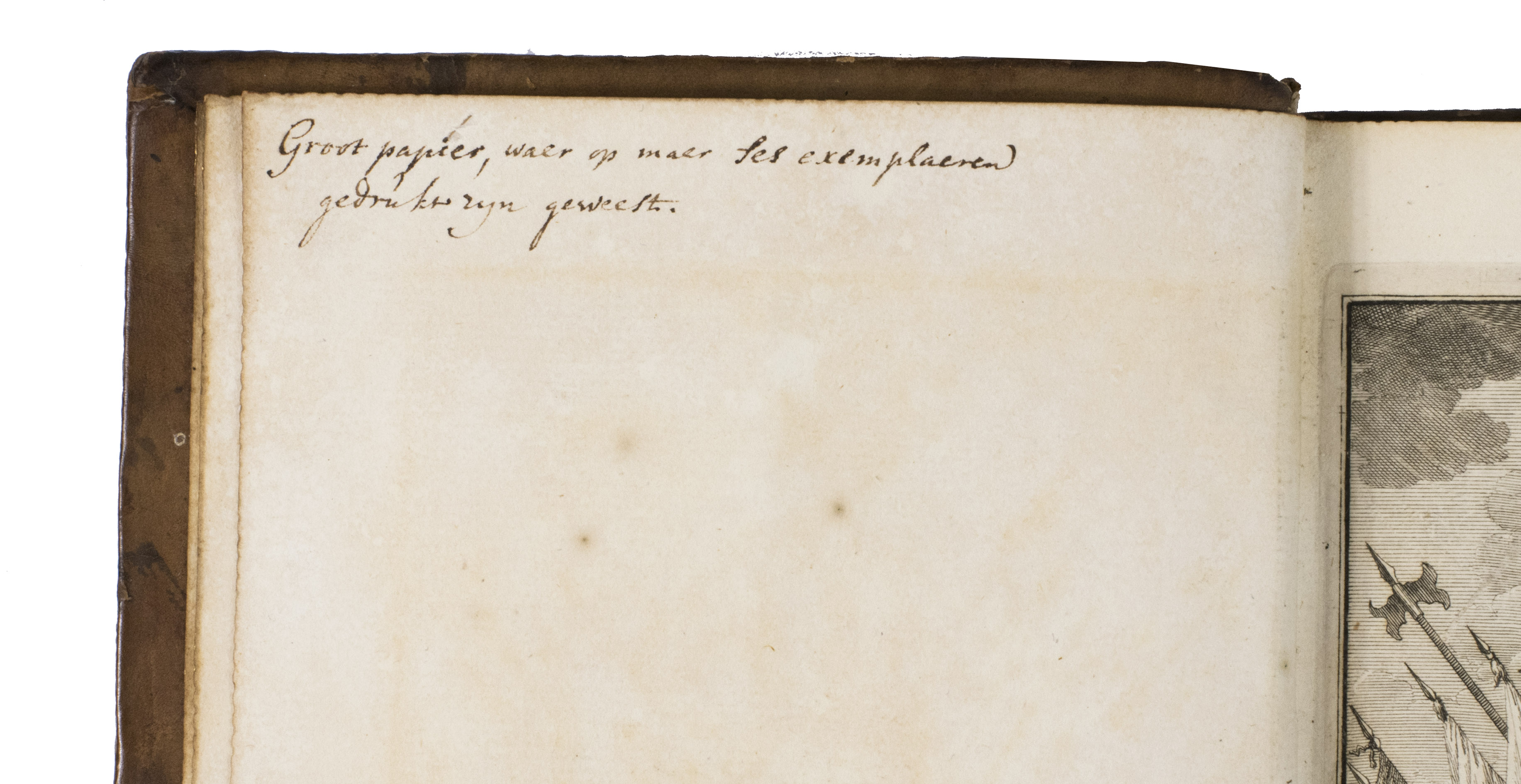 With an older booksellers' description mounted on the front pastedown, and a contemporary annotation in black ink on the verso of the second free flyleaf ("Groot papier, waer op maer ses exemplaeren gedrukt zyn geweest", translation: Large paper, of which only six copies have been printed). The joints are slightly weakened, but the structural integrity of the binding is still intact, the top of the spine is slightly chipped and the spine is somewhat rubbed. The leaves are lightly foxed. Otherwise a fine copy printed on large paper. Bodel Nijenhuis, no.1205; Haitsma Mulier/Van der Lem, no. 9e; STCN 218190875; cf. on the author: NNBW, VI, cols. 30-31; on the binding: Storm van Leeuwen, Dutch decorated bookbinding in the 18th century IIA, pp. 448-450.