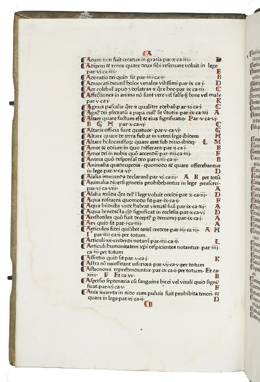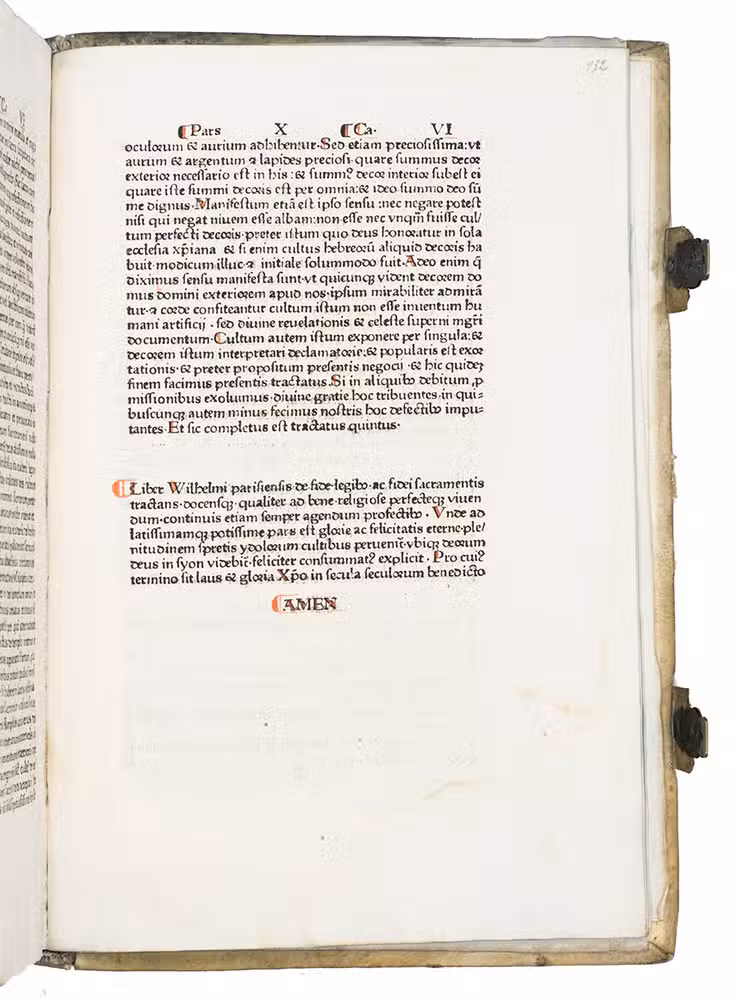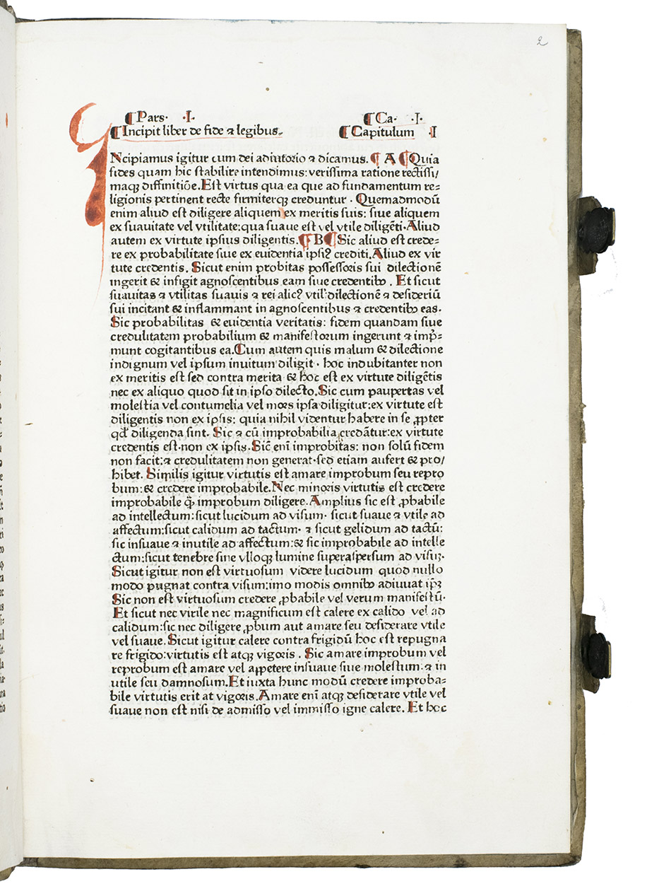Incunable first edition of De fide et legibus (On faith and laws), one of the most important works of William of Auvergne (post 1180 - 1249), in which he incorporates classical Arabic philosophical works of Ibn Sina, Al-Farabi and others, and it is the first of his works to be printed. It forms one of seven parts of his principal monumental work Magisterium divinale (The divine teaching), a compendium of philosophy and theology that attempts to explain the whole natural world.