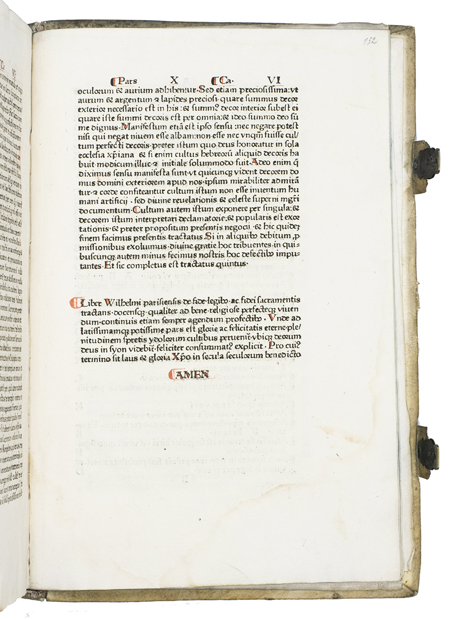 With a contemporary inscription: "Cart. in Buxheim. Contenta" and a small stamp of the "Bibl. Buxheim'" on the first page. The book therefore originally belonged to the Carthusians at Buxheim in Germany. The publisher Günther Zainer was known for his gifts to the Carthusian monastery in Buxheim and our copy of William of Auvergne's work was probably one of them. The monastery's library was sold in the 19th-century. Also with the bookplate of the library of George Dunn (1865-1912), an English bibliophile with an impressive library at Woolley Hall and a particular interest in paleography and early printing. Binding slightly stained and rubbed, first and last leaf somewhat loose, some water stains (especially at the end of the book), but still a beautiful copy in good condition. BMC II 323; Goff G 711; GW 11863; Hain-Copinger 8317; IGI 4602; ISTC ig00711000; Oates 883; Polain 1807; Proctor 1556; for the author: Thorndike III, pp. 338-371.