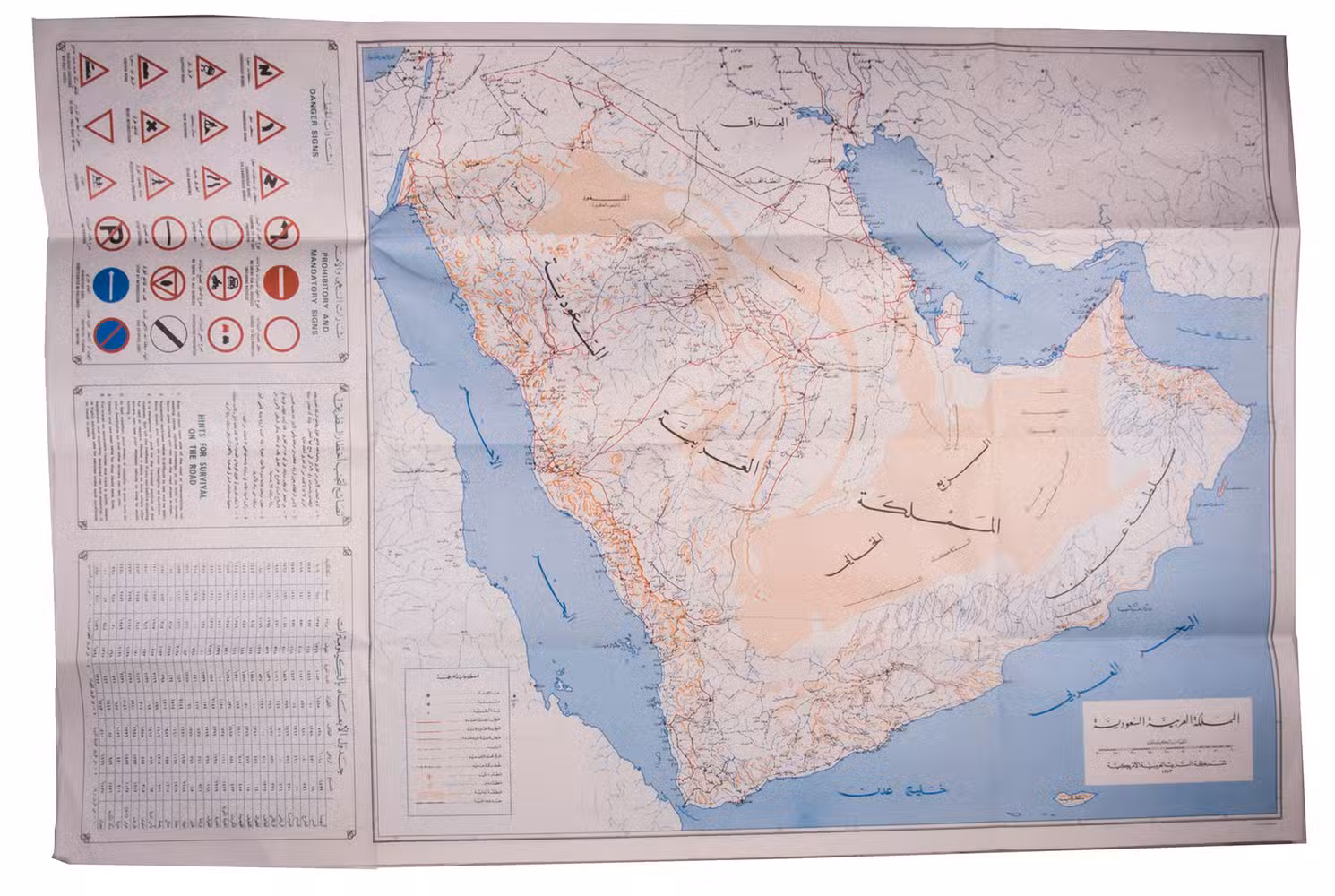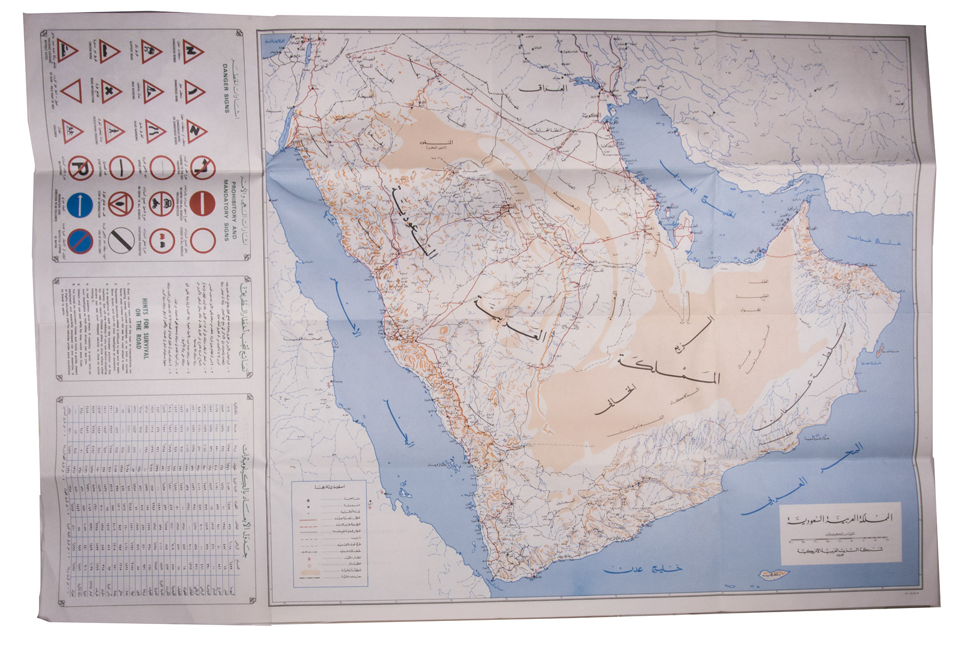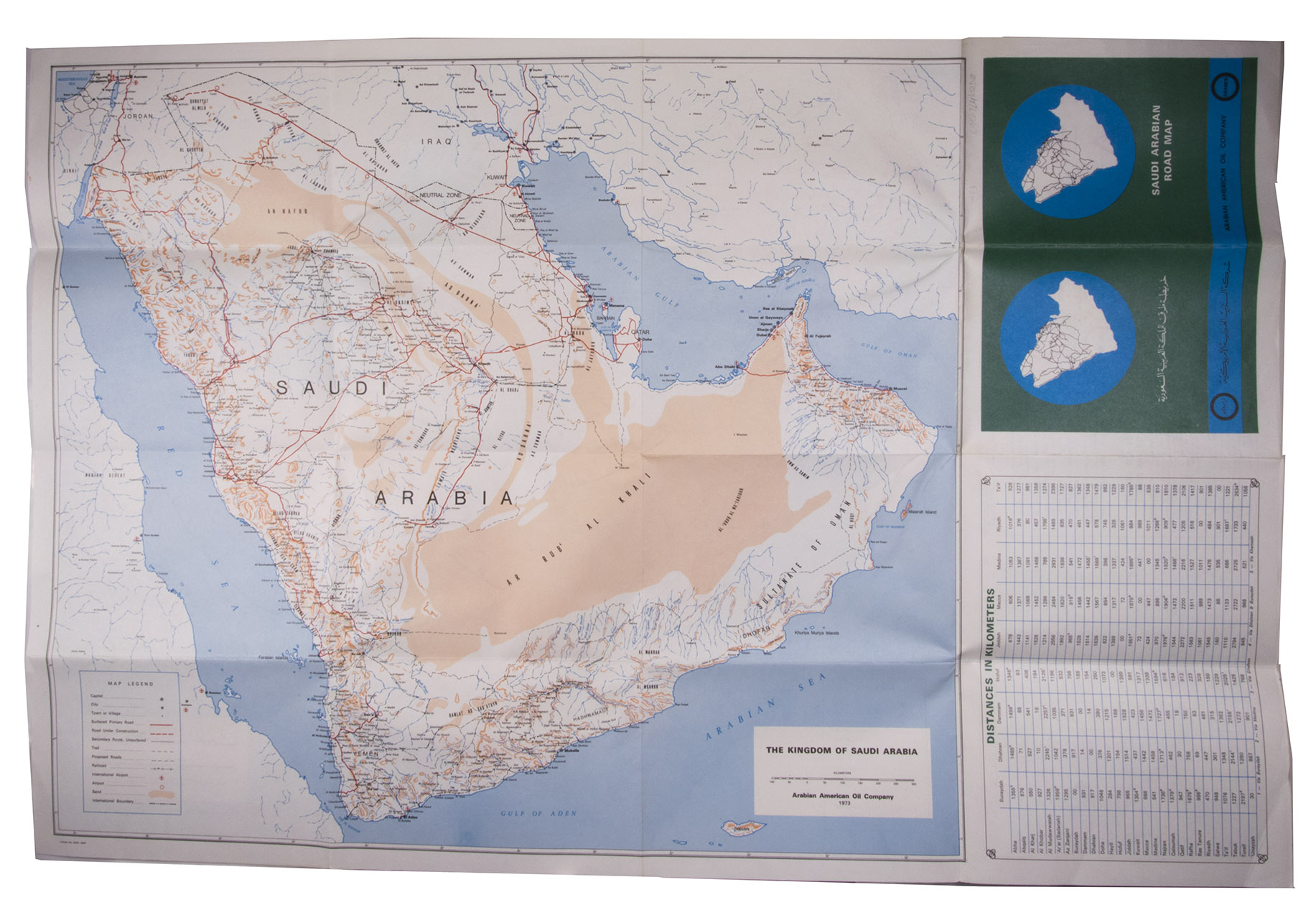Dammam, printed by the Al-Mutawa Press for the Arabian American Oil Company, 1973. Large folding map (60 x 90.5 cm), printed in colour, depicting the Kingdom of Saudi Arabia and its main roads. With on the right the title in both Arabic and English and a table with the distances from one city to another. Printed on two sides, one side with the map in English and the other in Arabic.