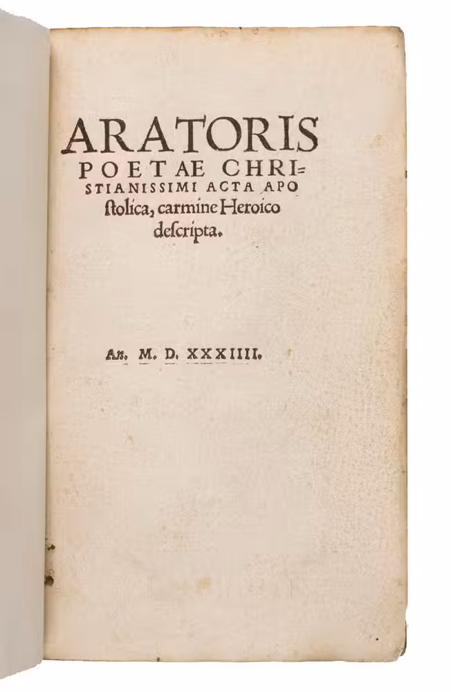 First and only 16th-century edition of the most celebrated work of Arator (ca. 490-after 544), a 6th-century Christian poet and subdeacon of Rome. De Actibus Apostolorum, written in Latin verse, stands as a remarkable example of early Christian literary culture.