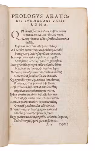 The final leaf is mounted on the second to last flyleaf, the leaves are occasionally browned and stained. Otherwise in very good condition. Broda, "An Unnoticed Twelfth-Century Manuscript of Arator's Historia Apostoliva, Wroclaw University Library", AKC, 1 (2018), pp. 1-16; Machiels A 831; NijhoffKronenberg 129; STCV:12926082; USTC 403902; not in Adams; BM STC Dutch.