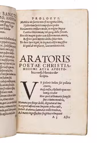 Arator, originally from Liguria in north-western Italy, left the imperial court to become a subdeacon in Rome, where he was closely associated with Pope Vigilius. He composed these verses in 544, dedicating them to the Pope. The work was first published by Aldus Manutius in Venice in 1502, and later included in the Bibliothèque des Pères, Paris, 1575.